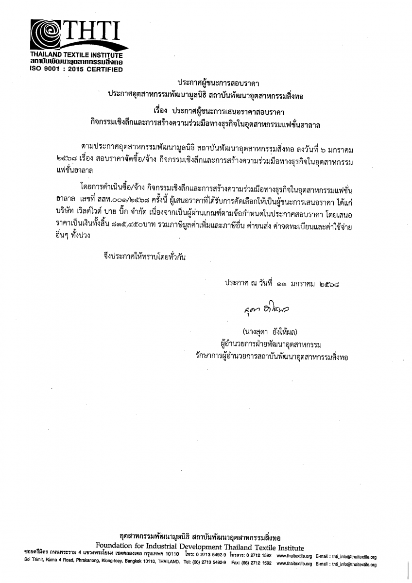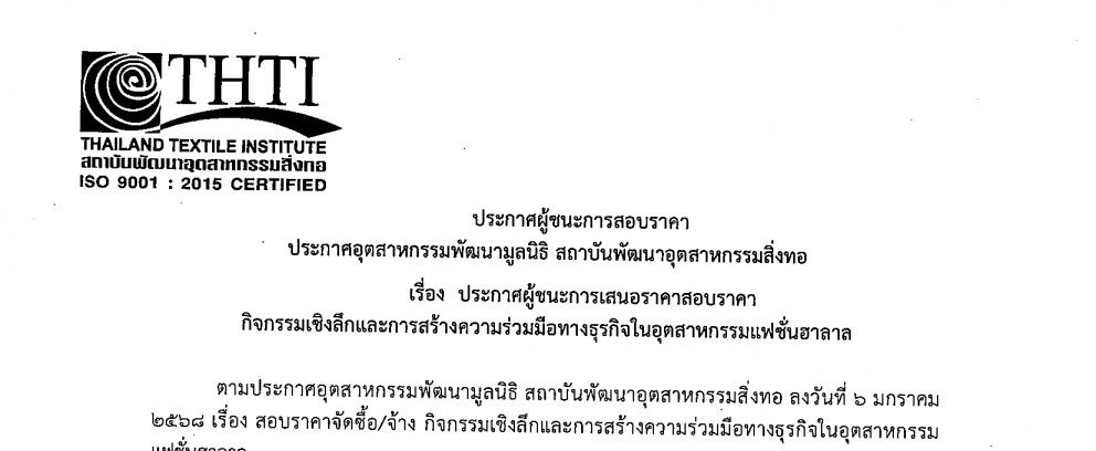 ประกาศผู้ชนะการเสนอราคาสอบราคากิจกรรมเชิงลึกและการสร้างความร่วมมือทางธุรกิจในอุตสาหกรรมแฟชั่นฮาลาล