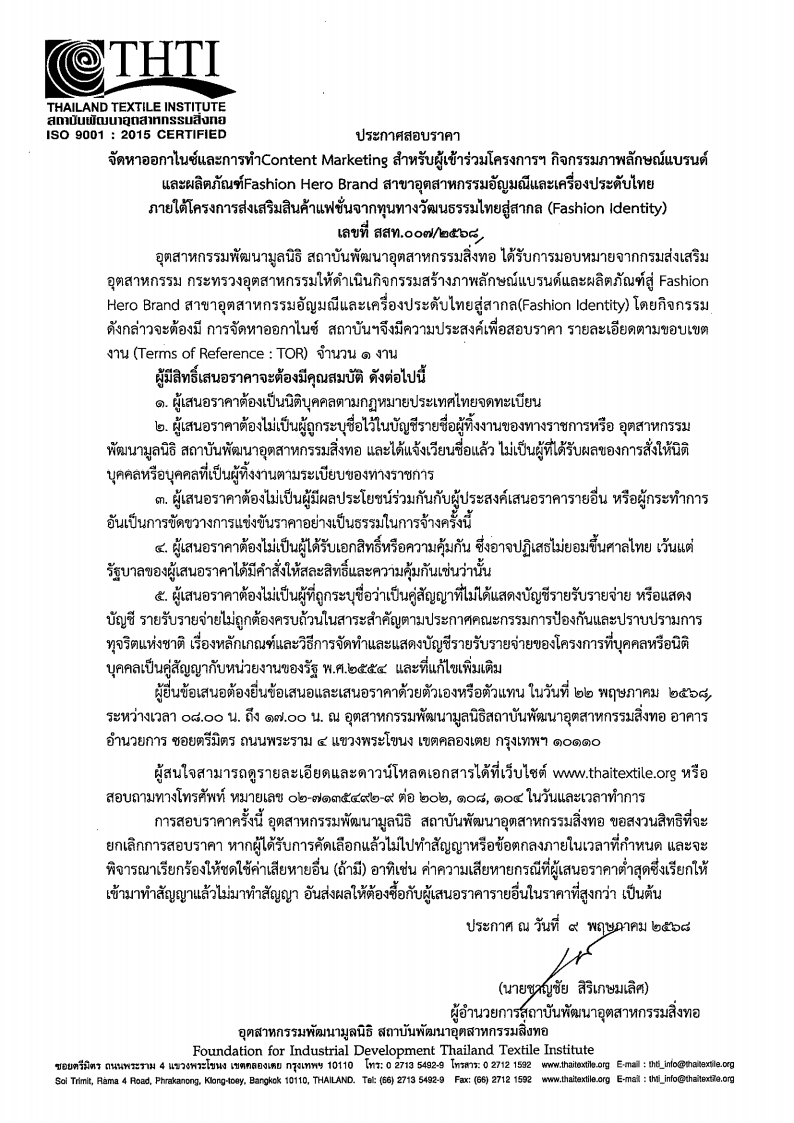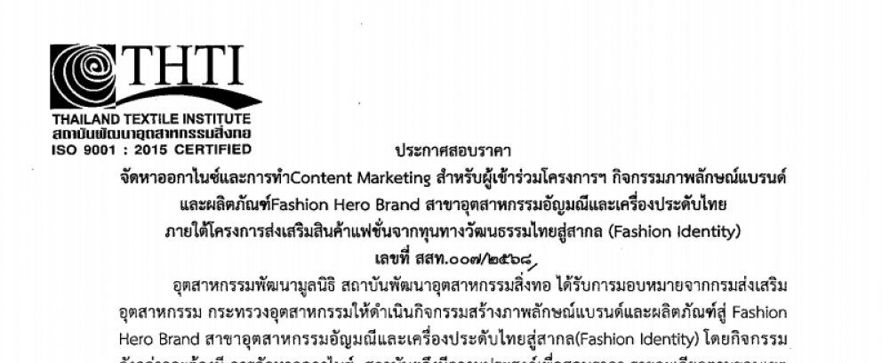 ประกาศสอบราคาจัดหารออกาไนซ์และการทำ Content Marketing สำหรับผู้เข้าร่วมโครงการฯ กิจกรรมภาพลักษณ์แบรนด์และผลิตภัณฑ์ Fashion Hero Brand สาขาอุตสาหกรรมอัญมณีและเครื่องประดับไทย ภายใต้โครงการส่งเสริมสินค้าแฟชั่นจากทุนทางวัฒนธรรมไทยสู่สากล (Fashion Identity) เ