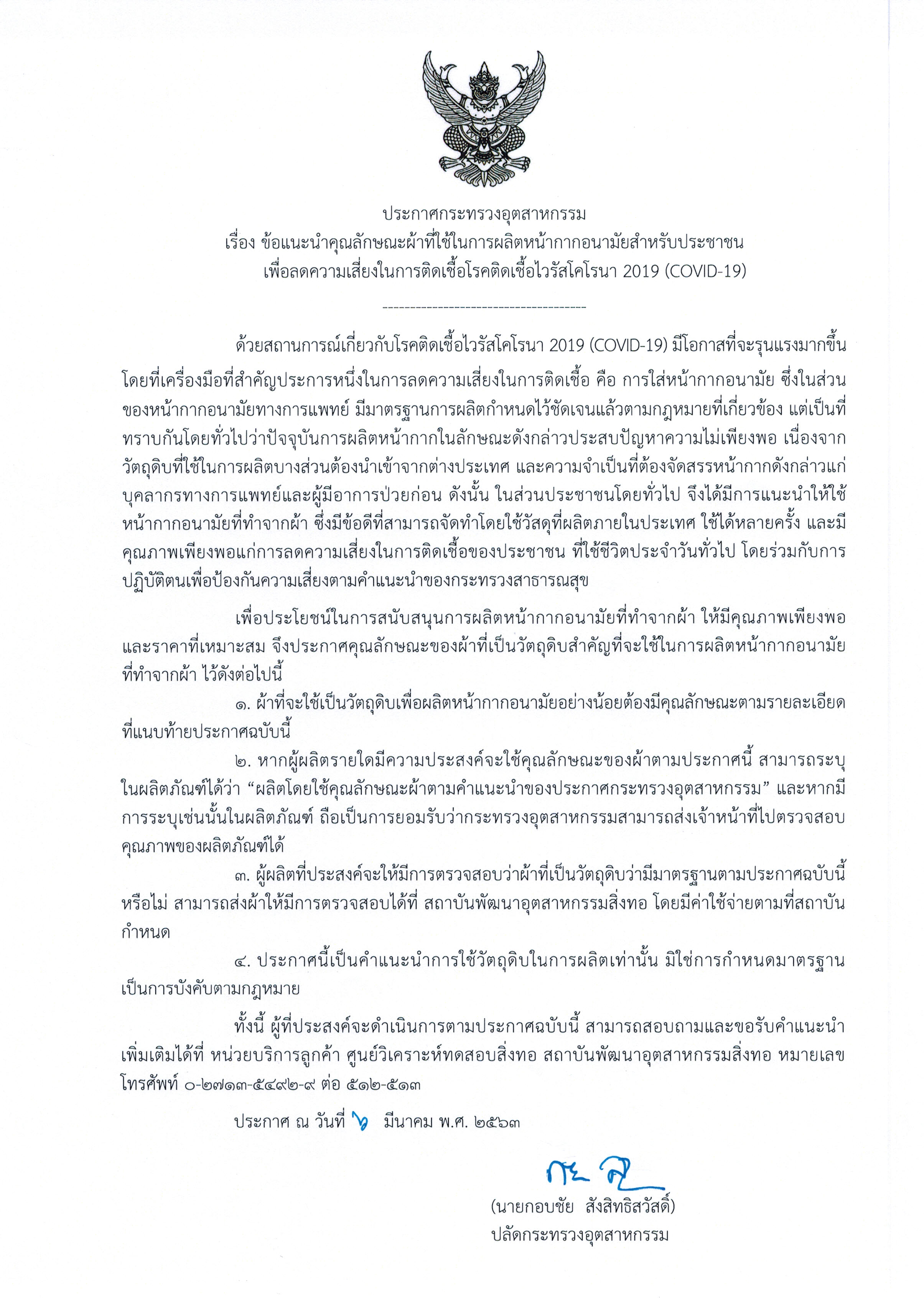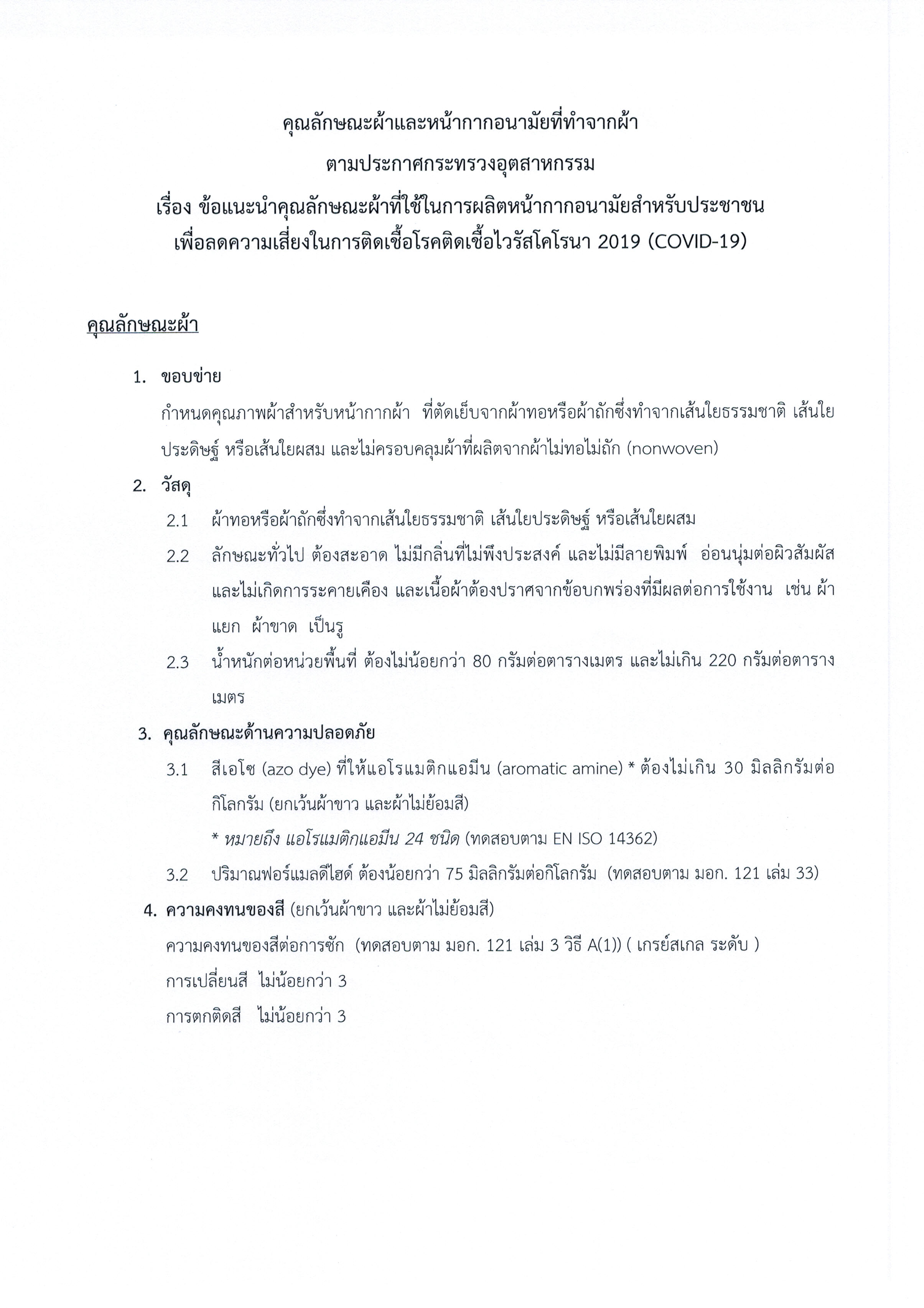 กระทรวงอุตสาหกรรมได้ออกประกาศเมื่อวันที่ 6 มีนาคม 2563 เรื่องข้อแนะนำคุณลักษณะผ้าที่ใช้ในการผลิตหน้ากากอนามัยสำหรับประชาชน เพื่อลดความเสี่ยงในการติดเชื้อโรคติดเชื้อไวรัสโคโรนา 2019 (COVID-19) เพื่อประโยชน์ในการสนับสนุนการผลิตหน้ากากอนามัยที่ทำจากผ้าให้มีคุณภาพเพียงพอและราคาที่เหมาะสม โดยคุณลักษณะของผ้าแนบท้ายประกาศได้ผ่านการจัดทำโดยสถาบันพัฒนาอุตสาหกรรมสิ่งทอ และสำนักงานมาตรฐานผลิตภัณฑ์อุตสาหกรรม ดังนี้