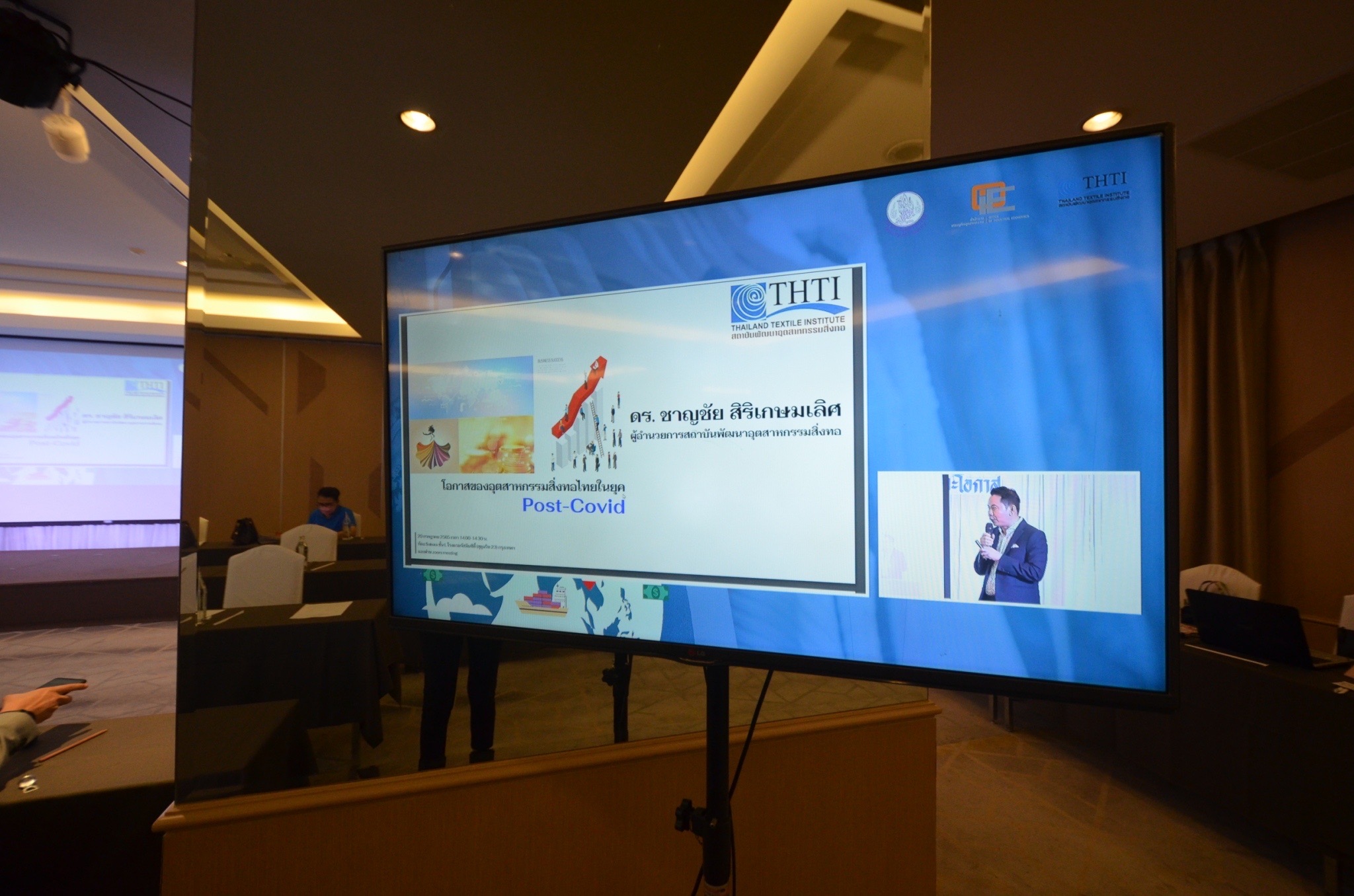 คุณศิริเพ็ญ เกียรติเฟื่องฟู รองผู้อำนวยการ สำนักงานเศรษฐกิจอุตสาหกรรม (สศอ.) ให้เกียรติเป็นประธานในพิธีเปิดงานผ่านระบบซูม ในกิจกรรมสัมมนา จับเทรนด์โอกาสธุรกิจสิ่งทอไทยให้ไกลระดับโลกเจาะโอกาสของสิ่งทอไทยในงานแสดงสินค้าต่างประเทศ โดยมี ดร.ชาญชัย สิริเกษมเลิศ ผู้อำนวยการสถาบันพัฒนาอุตสาหกรรมสิ่งทอ กล่าวรายงาน ณ ห้องซากุระ ชั้น L โรงแรมจัสมินซิตี้ เมื่อวันพุธที่ 20 กรกฎาคม 2565
