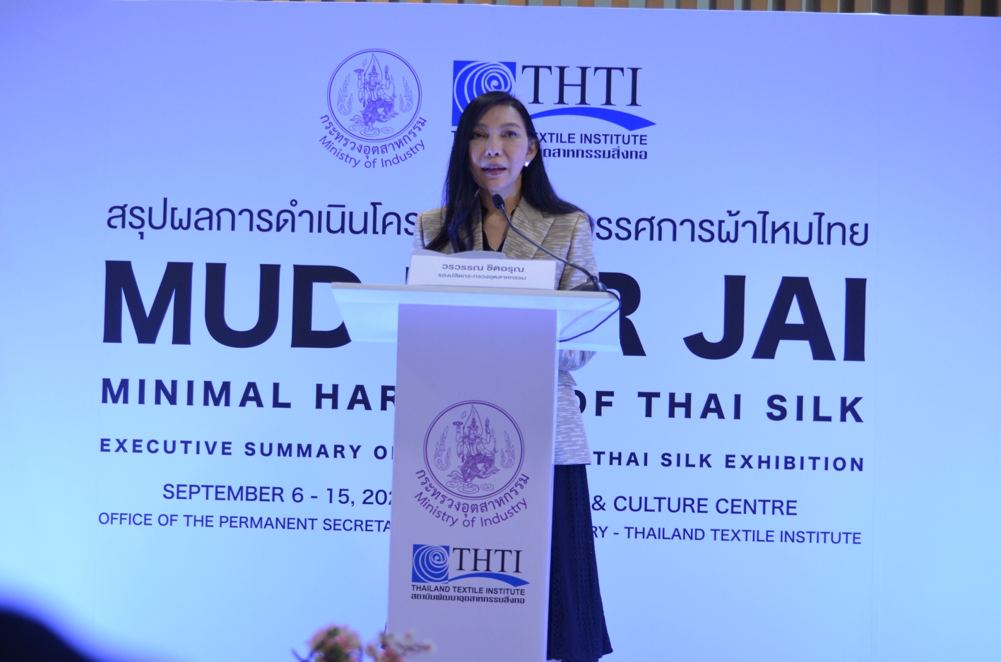 นางวรวรรณ ชิตอรุณ รองปลัดกระทรวงอุตสาหกรรม ให้เกียรติเป็นประธานกล่าวเปิด การจัดกิจกรรมสรุปผลการดำเนินโครงการและนิทรรศการผ้าไหมไทย มัดทอใจ มรดกผ้าไทยร่วมสมัย ในคอลเล็คชั่น Minimal Harmony of Thai Silk โดยมี ดร.ชาญชัย สิริเกษมเลิศ ผู้อำนวยการสถาบันพัฒนาอุตสาหกรรมสิ่งทอ กล่าวรายงาน ณ โถงชั้น L หอศิลป์วัฒนธรรมแห่งกรุงเทพมหานคร