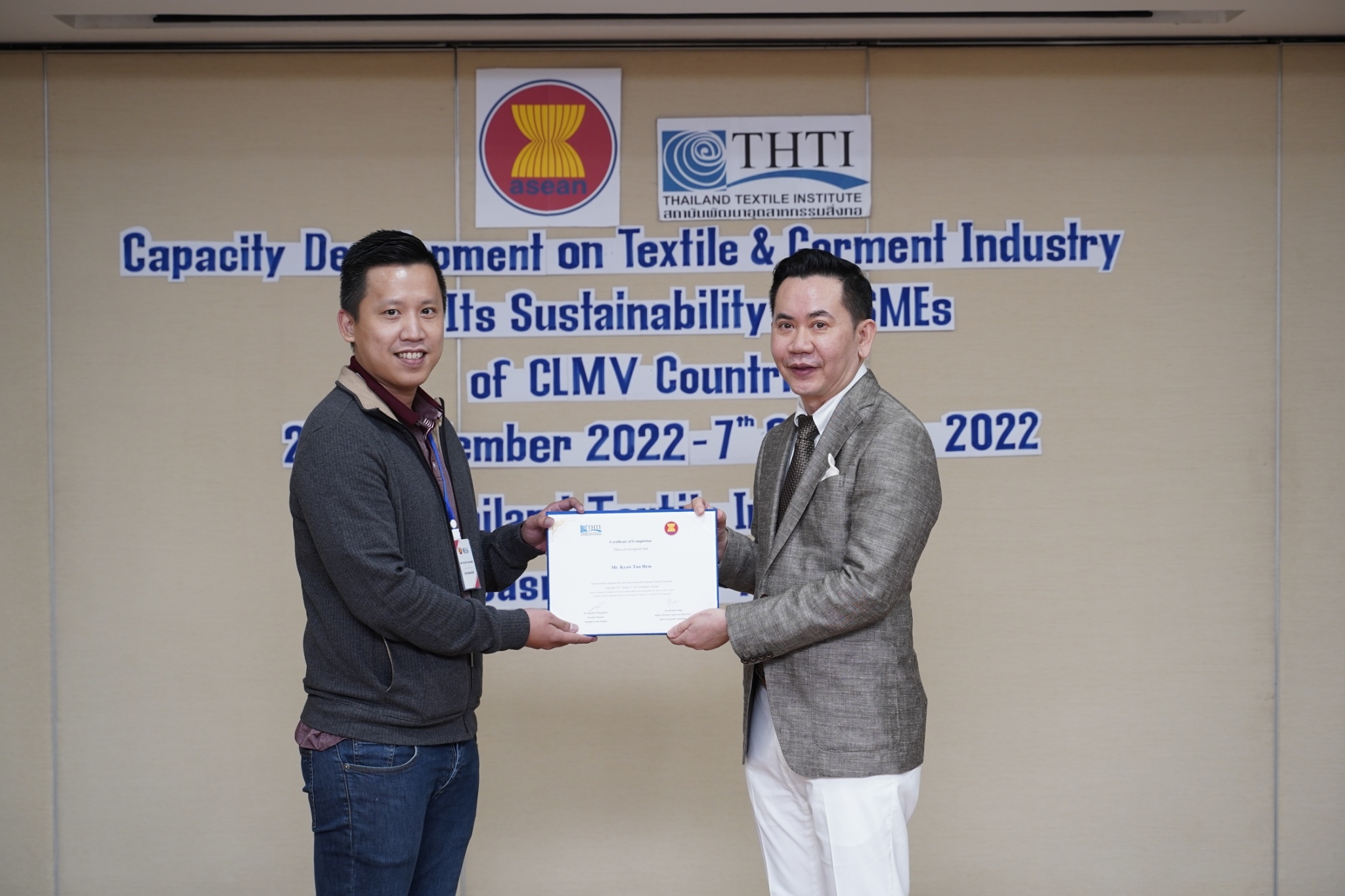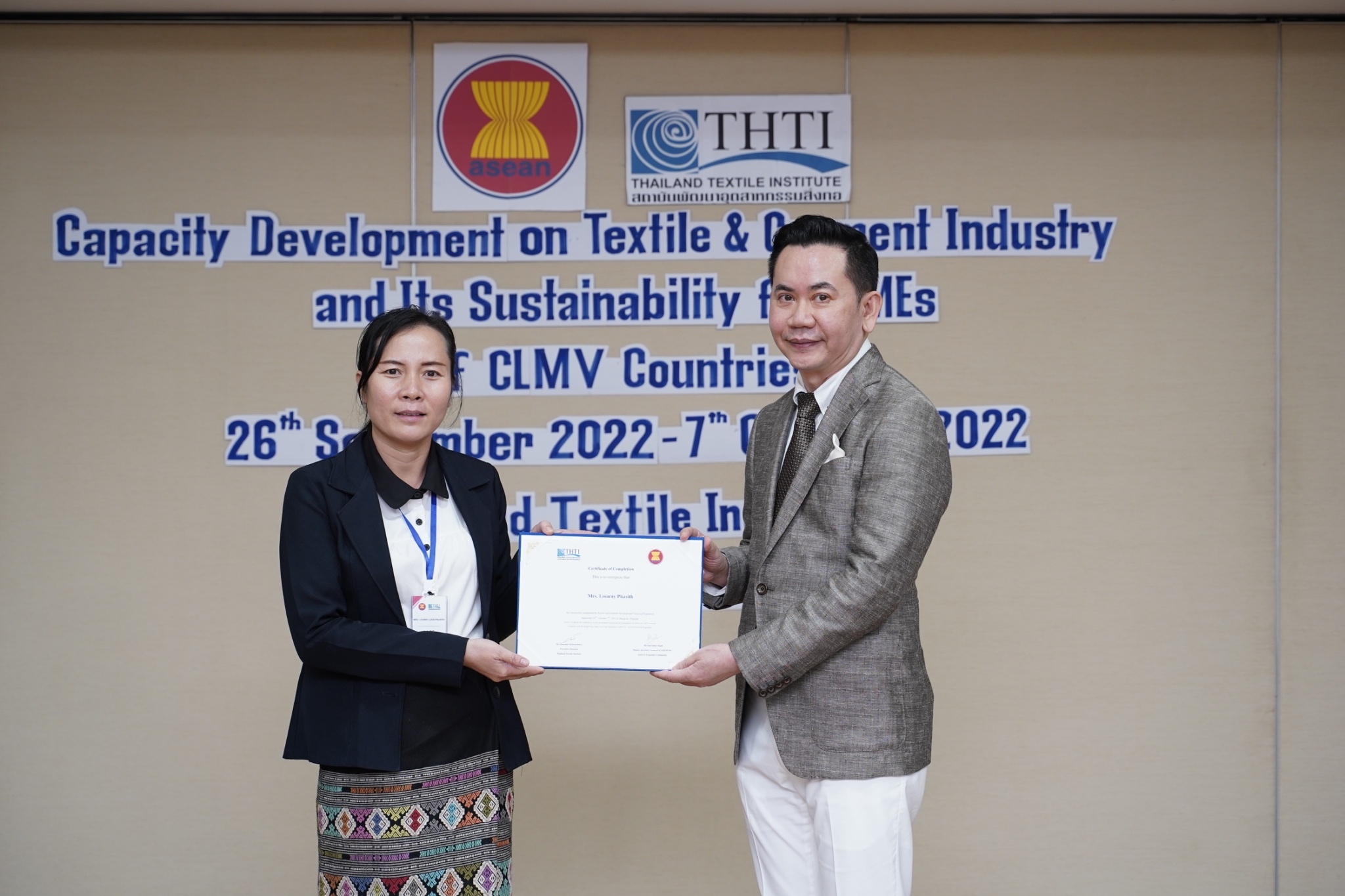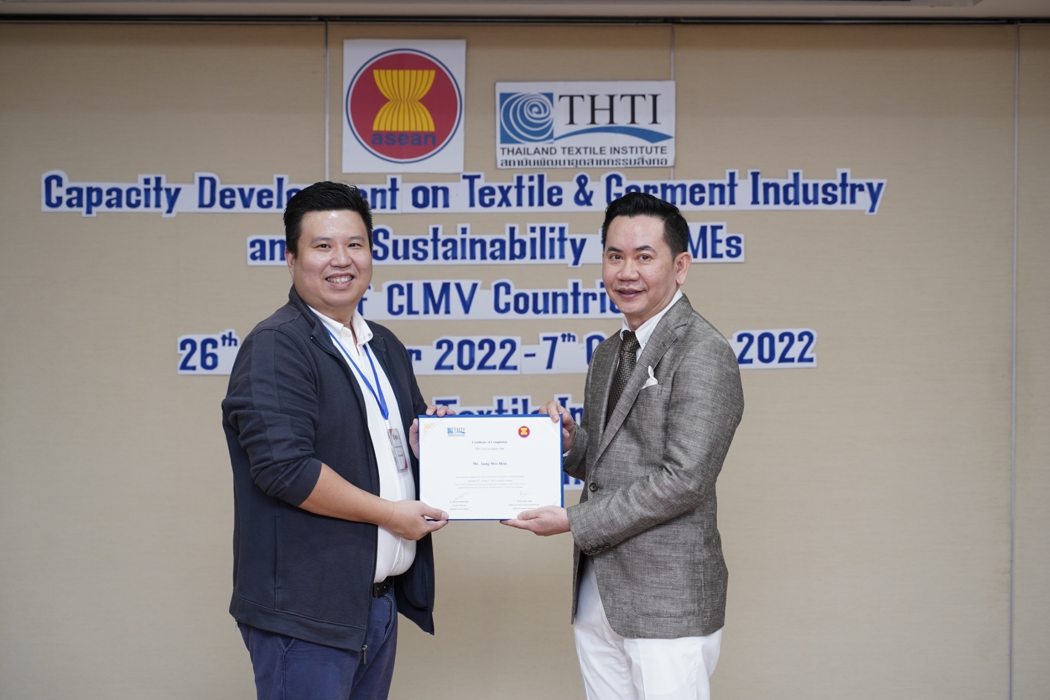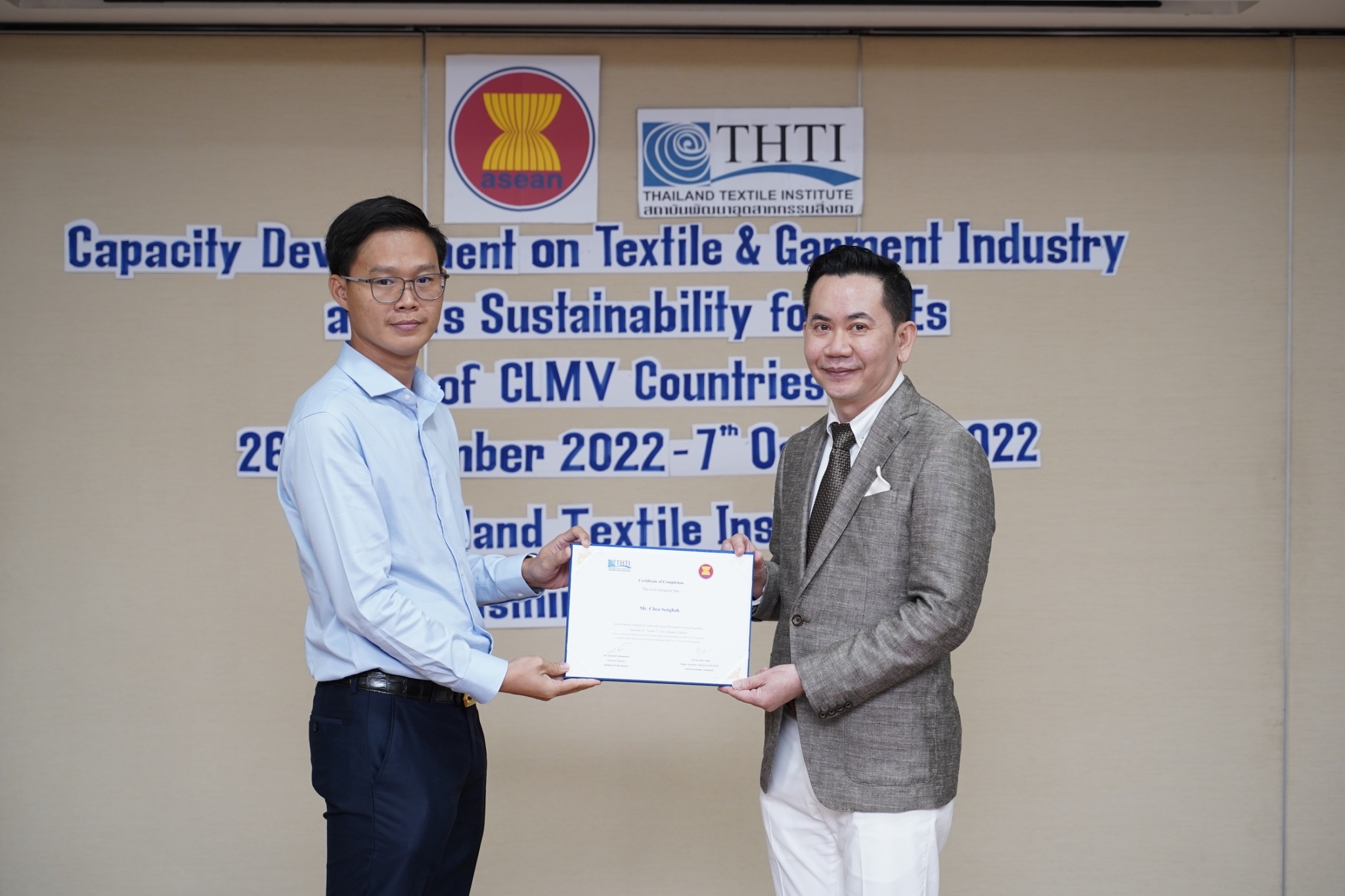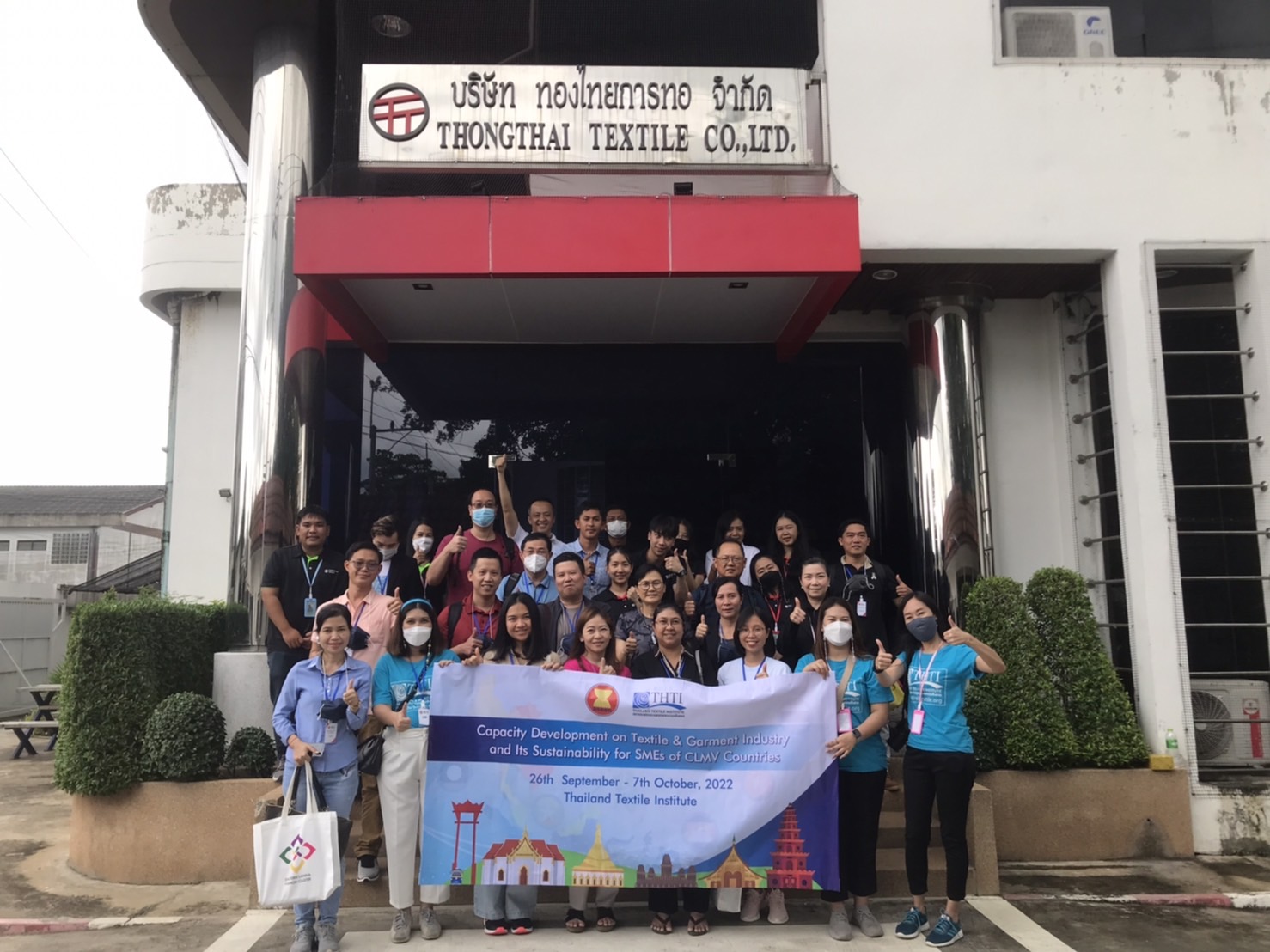 สำหรับกิจกรรมดังกล่าวจัดขึ้น โดยงบกองทุน AHKFTA ภายใต้ความตกลงการค้าเสรี ASEAN-Hong Kong, China Free Trade Agreement - ECOTECH Work Programme ได้เล็งเห็นถึงความสำคัญของผู้ประกอบการ SME ของกลุ่มประเทศ CLMV คือ กัมพูชา ลาว พม่า และเวียดนาม ในอุตสาหกรรมหกรรมสิ่งทอและเครื่องนุ่งห่มที่ได้รับผลกระทบจากการระบาดโควิด 19 ทำให้กำลังการผลิตหยุดชะงักเป็นเวลานาน จำเป็นต้องให้การสนับสนุนอุตสาหกรรมดังกล่าว จึงได้จัดโครงการฝึกอบรมพัฒนาผู้ประกอบการ SME ของกลุ่มประเทศ CLMV ขึ้น โดยกองทุนฯ ได้มอบหมายให้ สถาบันพัฒนาอุตสาหกรรมสิ่งทอ ซึ่งเป็นหน่วยงานภายใต้กำกับและดูแล โดยกระทรวงอุตสาหกรรม มีบทบาทและภารกิจ ในการส่งเสริม พัฒนาอุตสาหกรรมสิ่งทอและเครื่องนุ่งห่มของประเทศไทยทั้งระบบให้สามารถเติบโตได้อย่างมีประสิทธิภาพและยั่งยืน ดำเนินงานศึกษาและสำรวจสถานะอุตสาหกรรมสิ่งทอ และความต้องการในการพัฒนาอุตสาหกรรมสิ่งทอและเครื่องนุ่งห่มของแต่ละประเทศในกลุ่มประเทศ CLMV พร้อมจัดอบรมหลักสูตร Capacity Development on Textile & Garment Industry and Its Sustainability for SMEs of CLMV Countries ระหว่างวันที่ 26 กันยายน - 7 ตุลาคม 2565 เพื่อสร้างองค์ความรู้ และเปิดโอกาสให้ผู้ประกอบการ SME ของกลุ่มประเทศ CLMV และประเทศไทย (CLMV+T)ได้แลกเปลี่ยนเรียนรู้เกี่ยวกับการพัฒนา สร้างสรรค์นวัตกรรม และความร่วมมือใหม่ ๆ พร้อมนำเยี่ยมชม ศูนย์วิเคราะห์ทดสอบสิ่งทอ สถาบันฯสิ่งทอ และ บริษัท ทองไทยการทอ จำกัด และ บริษัท กู๊ดสตาร์ท จำกัด โรงงานอุตสาหกรรมสิ่งทอและเครื่องนุ่มห่มในประเทศไทย รวมทั้งจัดตั้งกลุ่มเพื่อเชื่อมโยงเครือข่ายบนแพลตฟอร์มออนไลน์ facebook group : Sustain2gether เพื่อส่งผ่านข้อมูลข่าวสารแบ่งปันความรู้สร้างความเข้มแข็งและการพัฒนาอุตสาหกรรมสิ่งทอและเครื่องนุ่งห่มร่วมกันอย่างต่อเนื่องและยั่งยืนในอนาคต