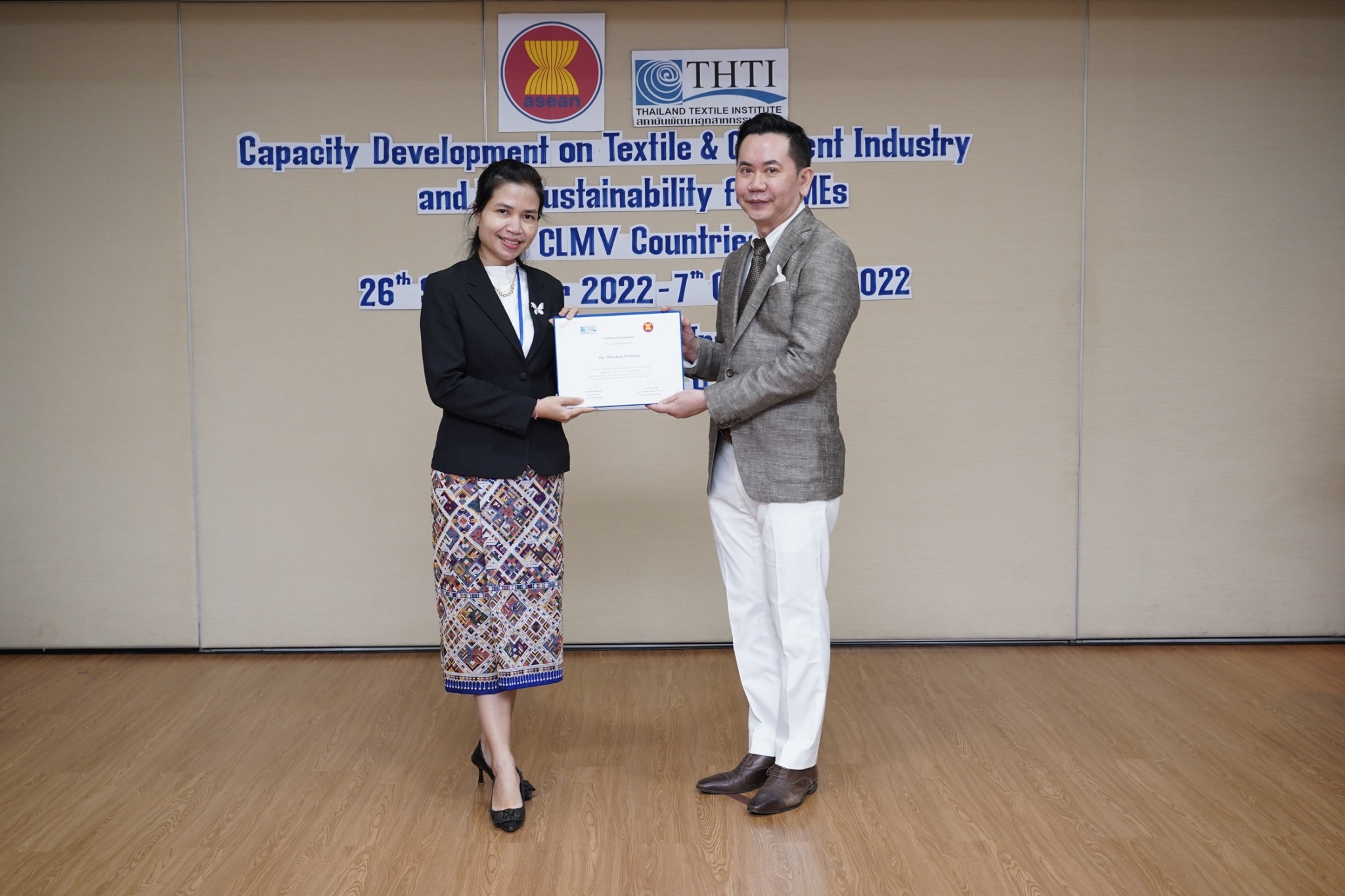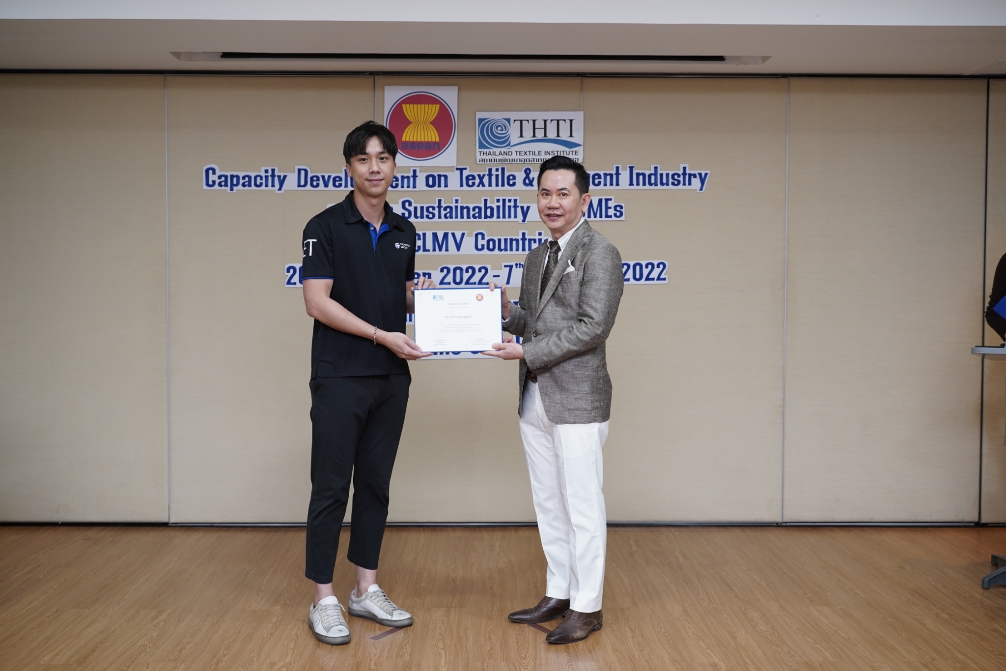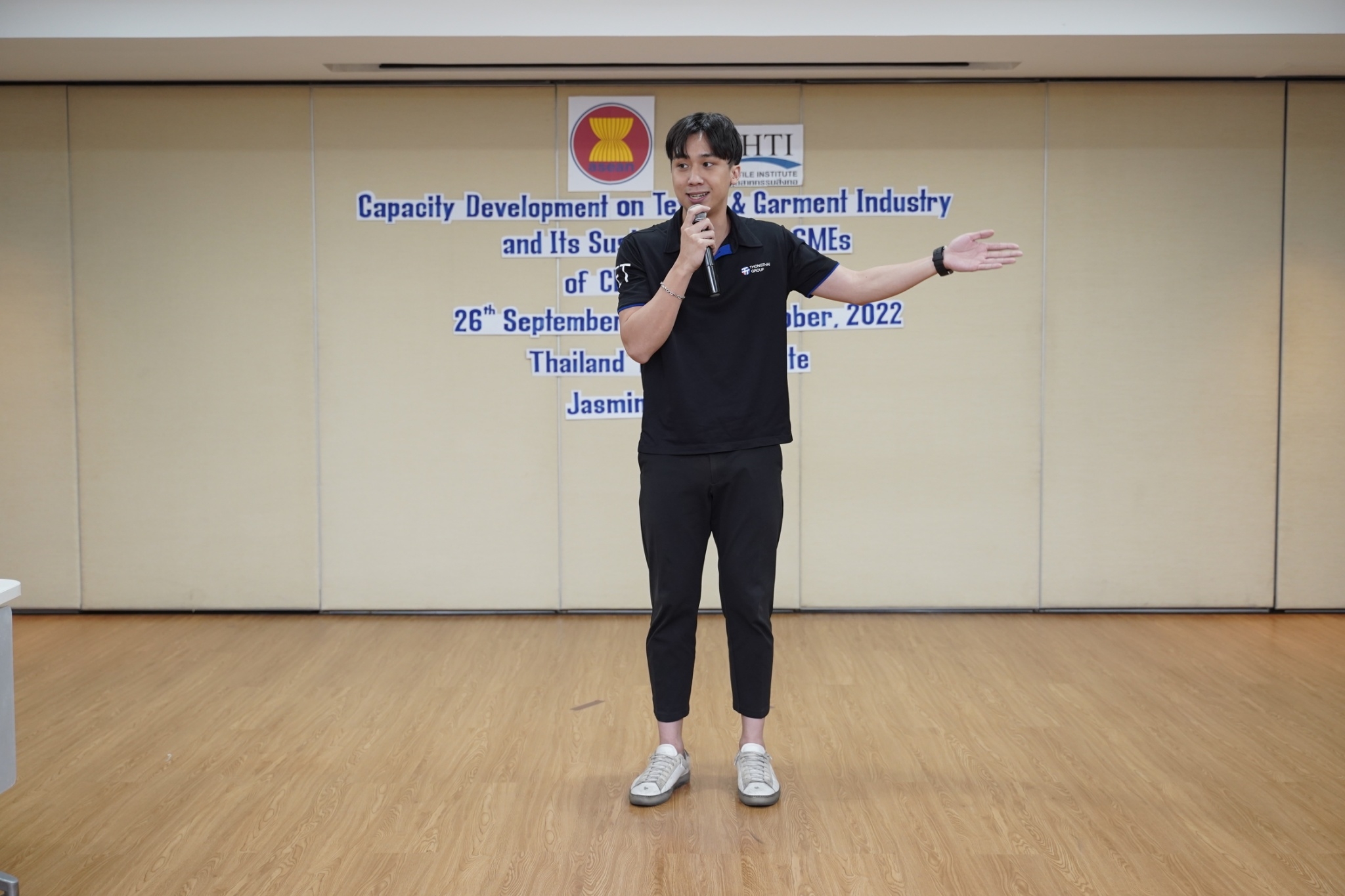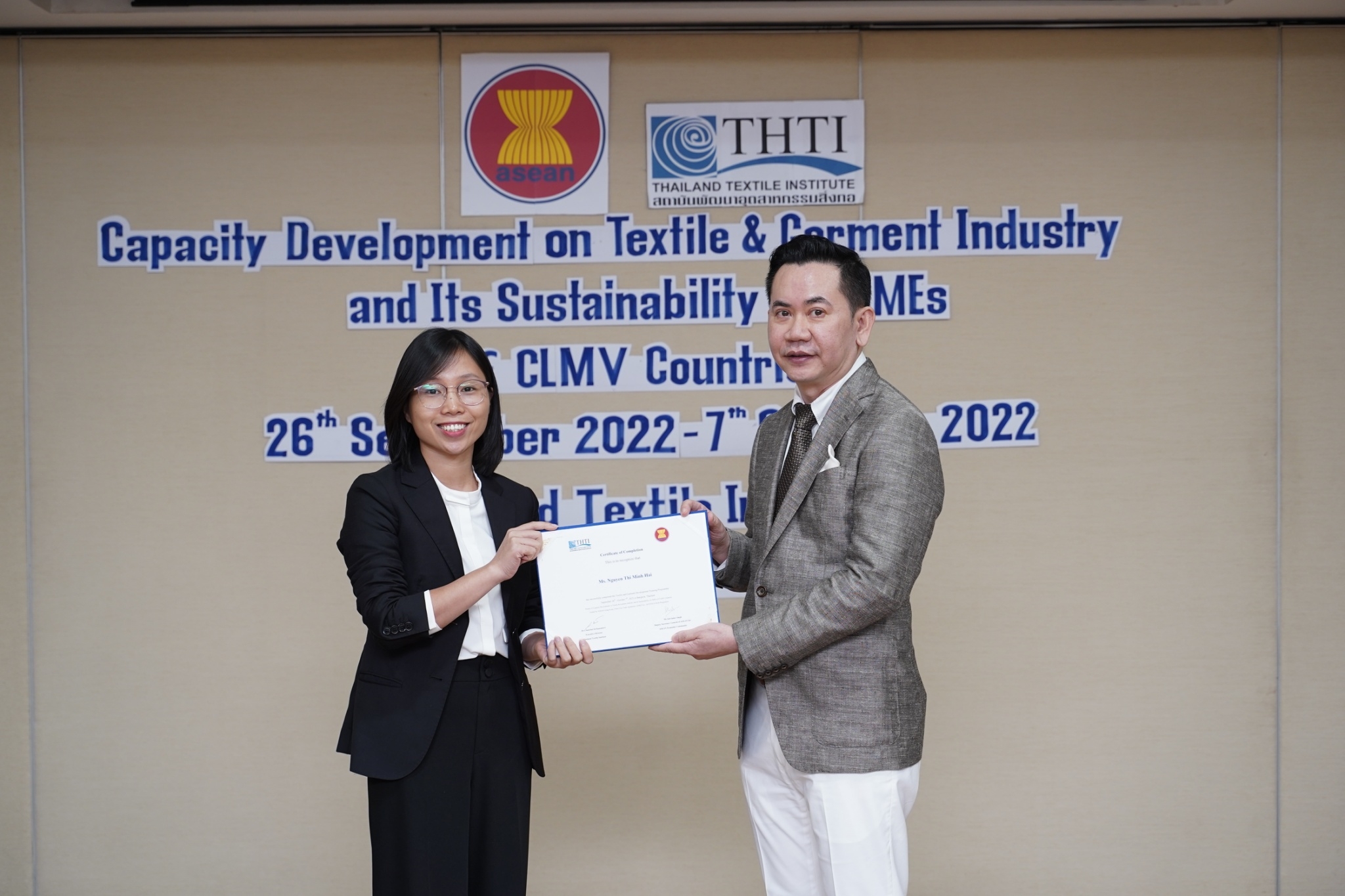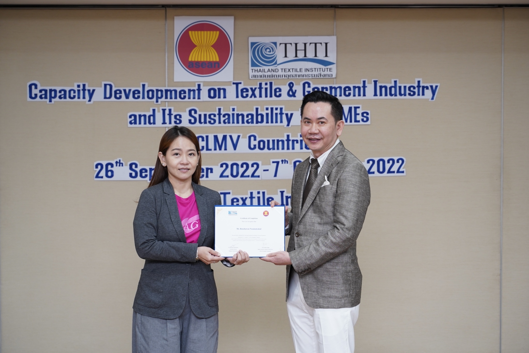 สำหรับกิจกรรมดังกล่าวจัดขึ้น โดยงบกองทุน AHKFTA ภายใต้ความตกลงการค้าเสรี ASEAN-Hong Kong, China Free Trade Agreement - ECOTECH Work Programme ได้เล็งเห็นถึงความสำคัญของผู้ประกอบการ SME ของกลุ่มประเทศ CLMV คือ กัมพูชา ลาว พม่า และเวียดนาม ในอุตสาหกรรมหกรรมสิ่งทอและเครื่องนุ่งห่มที่ได้รับผลกระทบจากการระบาดโควิด 19 ทำให้กำลังการผลิตหยุดชะงักเป็นเวลานาน จำเป็นต้องให้การสนับสนุนอุตสาหกรรมดังกล่าว จึงได้จัดโครงการฝึกอบรมพัฒนาผู้ประกอบการ SME ของกลุ่มประเทศ CLMV ขึ้น โดยกองทุนฯ ได้มอบหมายให้ สถาบันพัฒนาอุตสาหกรรมสิ่งทอ ซึ่งเป็นหน่วยงานภายใต้กำกับและดูแล โดยกระทรวงอุตสาหกรรม มีบทบาทและภารกิจ ในการส่งเสริม พัฒนาอุตสาหกรรมสิ่งทอและเครื่องนุ่งห่มของประเทศไทยทั้งระบบให้สามารถเติบโตได้อย่างมีประสิทธิภาพและยั่งยืน ดำเนินงานศึกษาและสำรวจสถานะอุตสาหกรรมสิ่งทอ และความต้องการในการพัฒนาอุตสาหกรรมสิ่งทอและเครื่องนุ่งห่มของแต่ละประเทศในกลุ่มประเทศ CLMV พร้อมจัดอบรมหลักสูตร Capacity Development on Textile & Garment Industry and Its Sustainability for SMEs of CLMV Countries ระหว่างวันที่ 26 กันยายน - 7 ตุลาคม 2565 เพื่อสร้างองค์ความรู้ และเปิดโอกาสให้ผู้ประกอบการ SME ของกลุ่มประเทศ CLMV และประเทศไทย (CLMV+T)ได้แลกเปลี่ยนเรียนรู้เกี่ยวกับการพัฒนา สร้างสรรค์นวัตกรรม และความร่วมมือใหม่ ๆ พร้อมนำเยี่ยมชม ศูนย์วิเคราะห์ทดสอบสิ่งทอ สถาบันฯสิ่งทอ และ บริษัท ทองไทยการทอ จำกัด และ บริษัท กู๊ดสตาร์ท จำกัด โรงงานอุตสาหกรรมสิ่งทอและเครื่องนุ่มห่มในประเทศไทย รวมทั้งจัดตั้งกลุ่มเพื่อเชื่อมโยงเครือข่ายบนแพลตฟอร์มออนไลน์ facebook group : Sustain2gether เพื่อส่งผ่านข้อมูลข่าวสารแบ่งปันความรู้สร้างความเข้มแข็งและการพัฒนาอุตสาหกรรมสิ่งทอและเครื่องนุ่งห่มร่วมกันอย่างต่อเนื่องและยั่งยืนในอนาคต