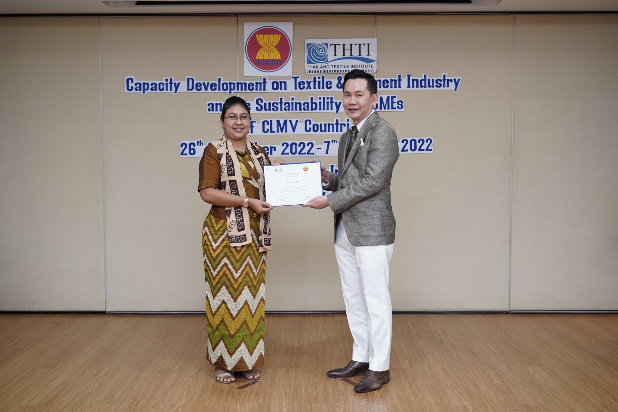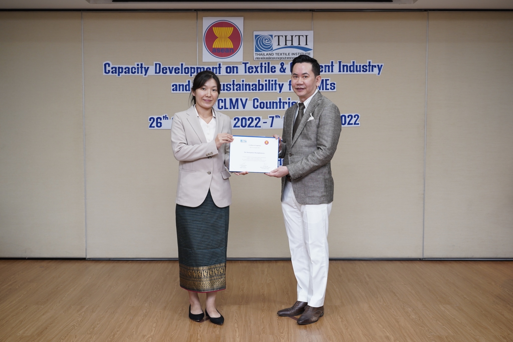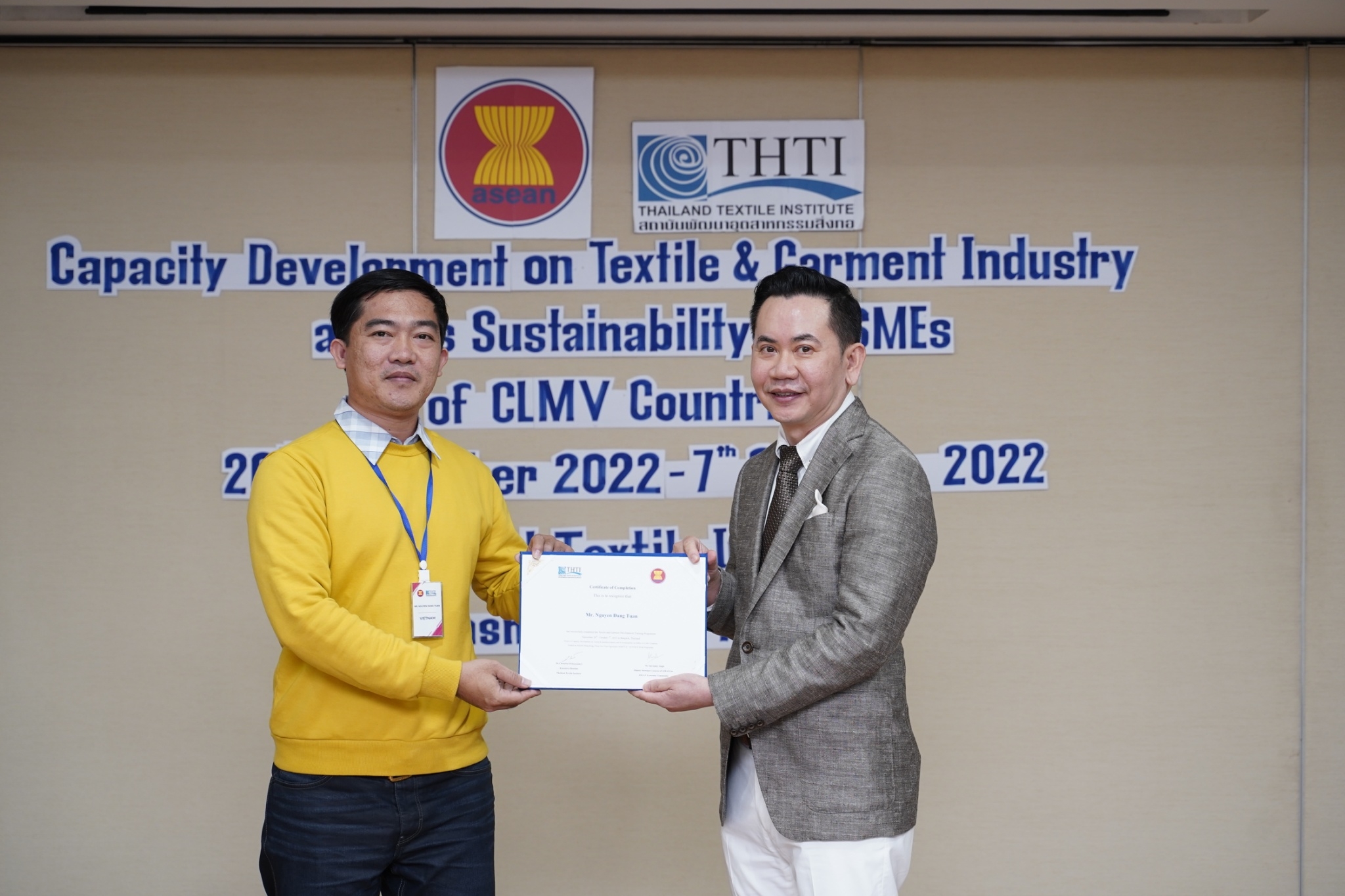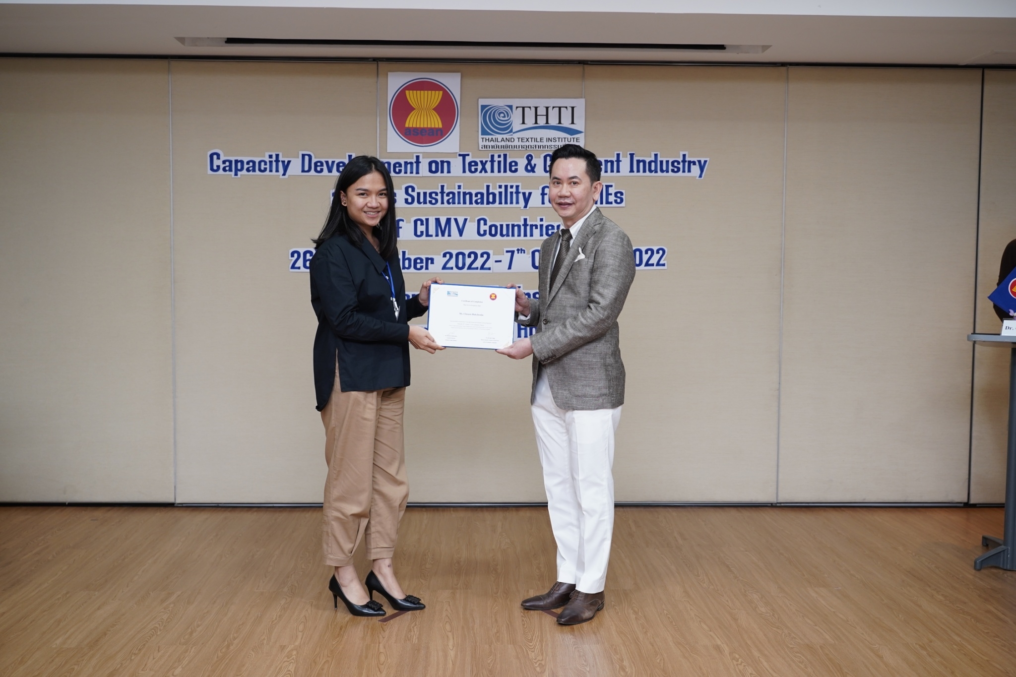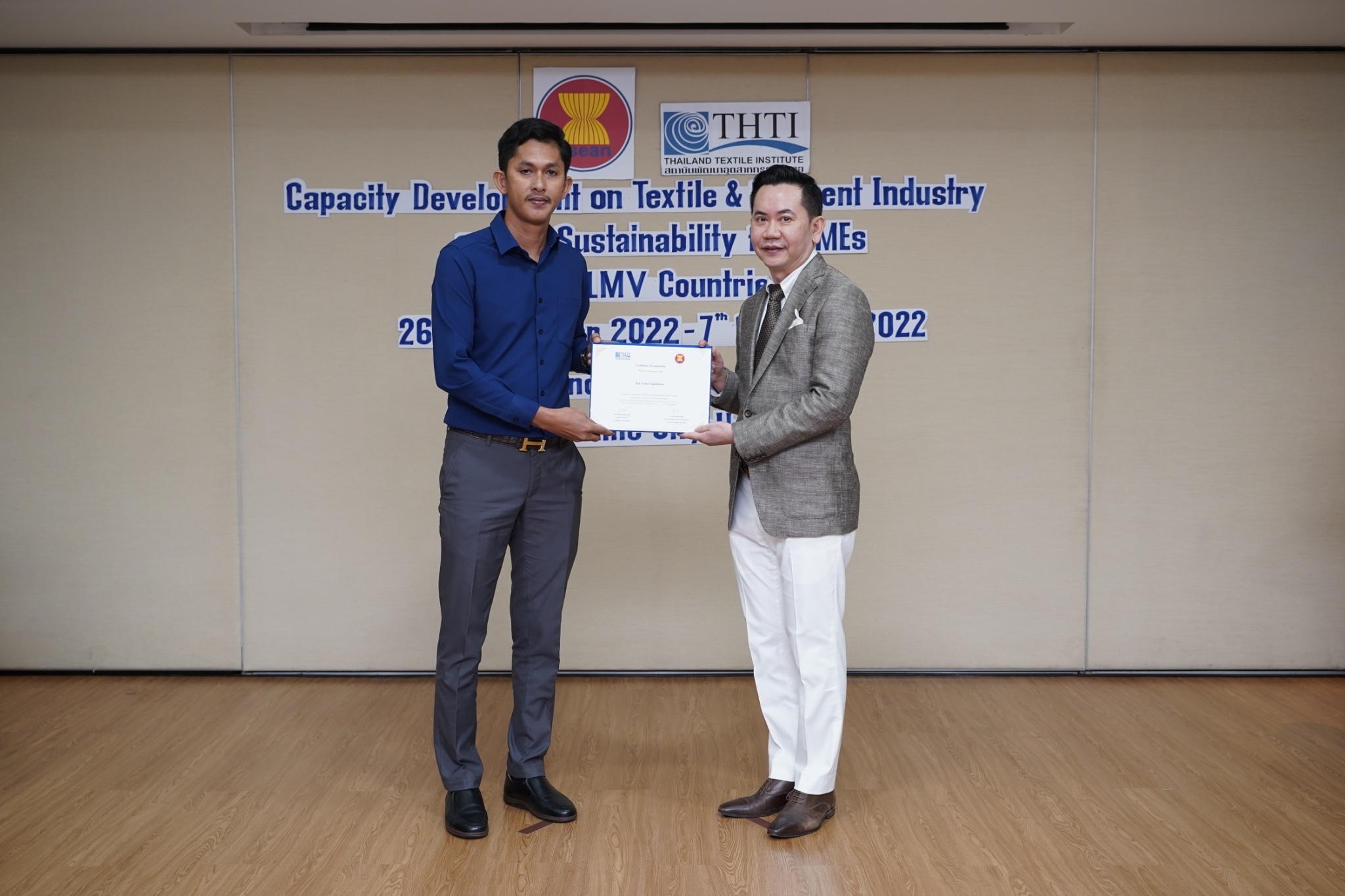 สำหรับกิจกรรมดังกล่าวจัดขึ้น โดยงบกองทุน AHKFTA ภายใต้ความตกลงการค้าเสรี ASEAN-Hong Kong, China Free Trade Agreement - ECOTECH Work Programme ได้เล็งเห็นถึงความสำคัญของผู้ประกอบการ SME ของกลุ่มประเทศ CLMV คือ กัมพูชา ลาว พม่า และเวียดนาม ในอุตสาหกรรมหกรรมสิ่งทอและเครื่องนุ่งห่มที่ได้รับผลกระทบจากการระบาดโควิด 19 ทำให้กำลังการผลิตหยุดชะงักเป็นเวลานาน จำเป็นต้องให้การสนับสนุนอุตสาหกรรมดังกล่าว จึงได้จัดโครงการฝึกอบรมพัฒนาผู้ประกอบการ SME ของกลุ่มประเทศ CLMV ขึ้น โดยกองทุนฯ ได้มอบหมายให้ สถาบันพัฒนาอุตสาหกรรมสิ่งทอ ซึ่งเป็นหน่วยงานภายใต้กำกับและดูแล โดยกระทรวงอุตสาหกรรม มีบทบาทและภารกิจ ในการส่งเสริม พัฒนาอุตสาหกรรมสิ่งทอและเครื่องนุ่งห่มของประเทศไทยทั้งระบบให้สามารถเติบโตได้อย่างมีประสิทธิภาพและยั่งยืน ดำเนินงานศึกษาและสำรวจสถานะอุตสาหกรรมสิ่งทอ และความต้องการในการพัฒนาอุตสาหกรรมสิ่งทอและเครื่องนุ่งห่มของแต่ละประเทศในกลุ่มประเทศ CLMV พร้อมจัดอบรมหลักสูตร Capacity Development on Textile & Garment Industry and Its Sustainability for SMEs of CLMV Countries ระหว่างวันที่ 26 กันยายน - 7 ตุลาคม 2565 เพื่อสร้างองค์ความรู้ และเปิดโอกาสให้ผู้ประกอบการ SME ของกลุ่มประเทศ CLMV และประเทศไทย (CLMV+T)ได้แลกเปลี่ยนเรียนรู้เกี่ยวกับการพัฒนา สร้างสรรค์นวัตกรรม และความร่วมมือใหม่ ๆ พร้อมนำเยี่ยมชม ศูนย์วิเคราะห์ทดสอบสิ่งทอ สถาบันฯสิ่งทอ และ บริษัท ทองไทยการทอ จำกัด และ บริษัท กู๊ดสตาร์ท จำกัด โรงงานอุตสาหกรรมสิ่งทอและเครื่องนุ่มห่มในประเทศไทย รวมทั้งจัดตั้งกลุ่มเพื่อเชื่อมโยงเครือข่ายบนแพลตฟอร์มออนไลน์ facebook group : Sustain2gether เพื่อส่งผ่านข้อมูลข่าวสารแบ่งปันความรู้สร้างความเข้มแข็งและการพัฒนาอุตสาหกรรมสิ่งทอและเครื่องนุ่งห่มร่วมกันอย่างต่อเนื่องและยั่งยืนในอนาคต