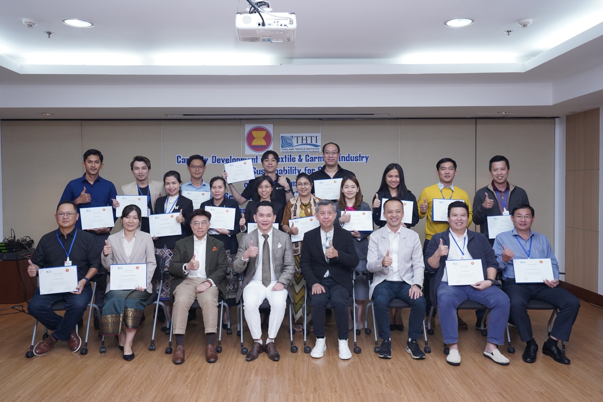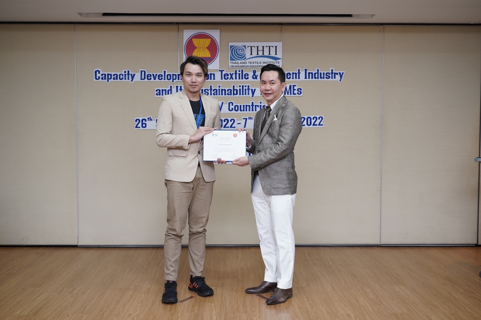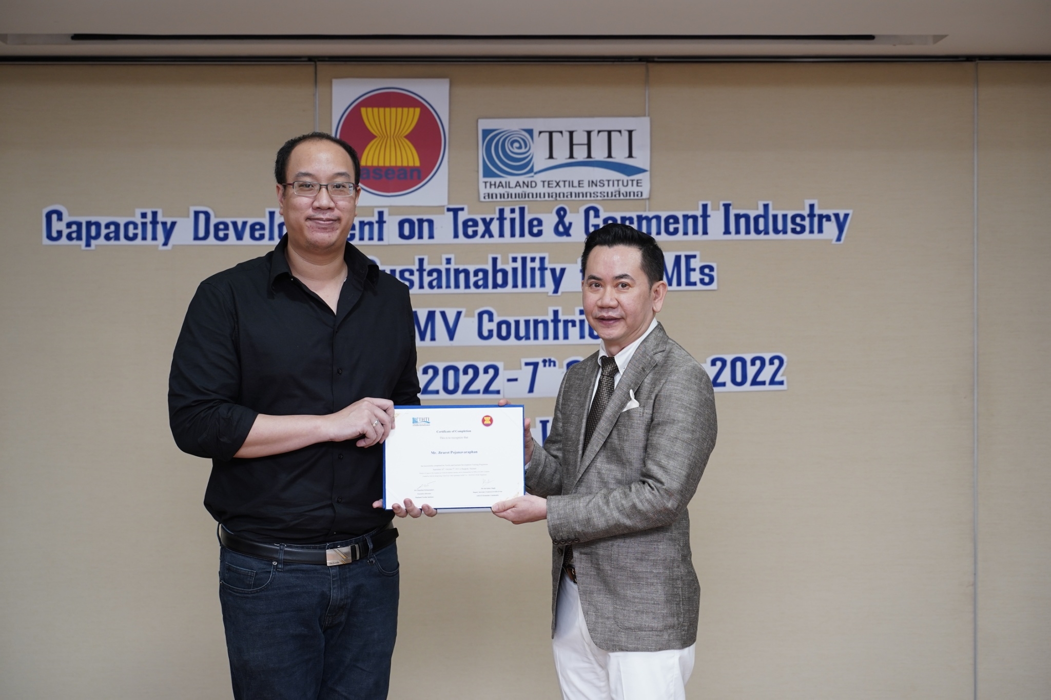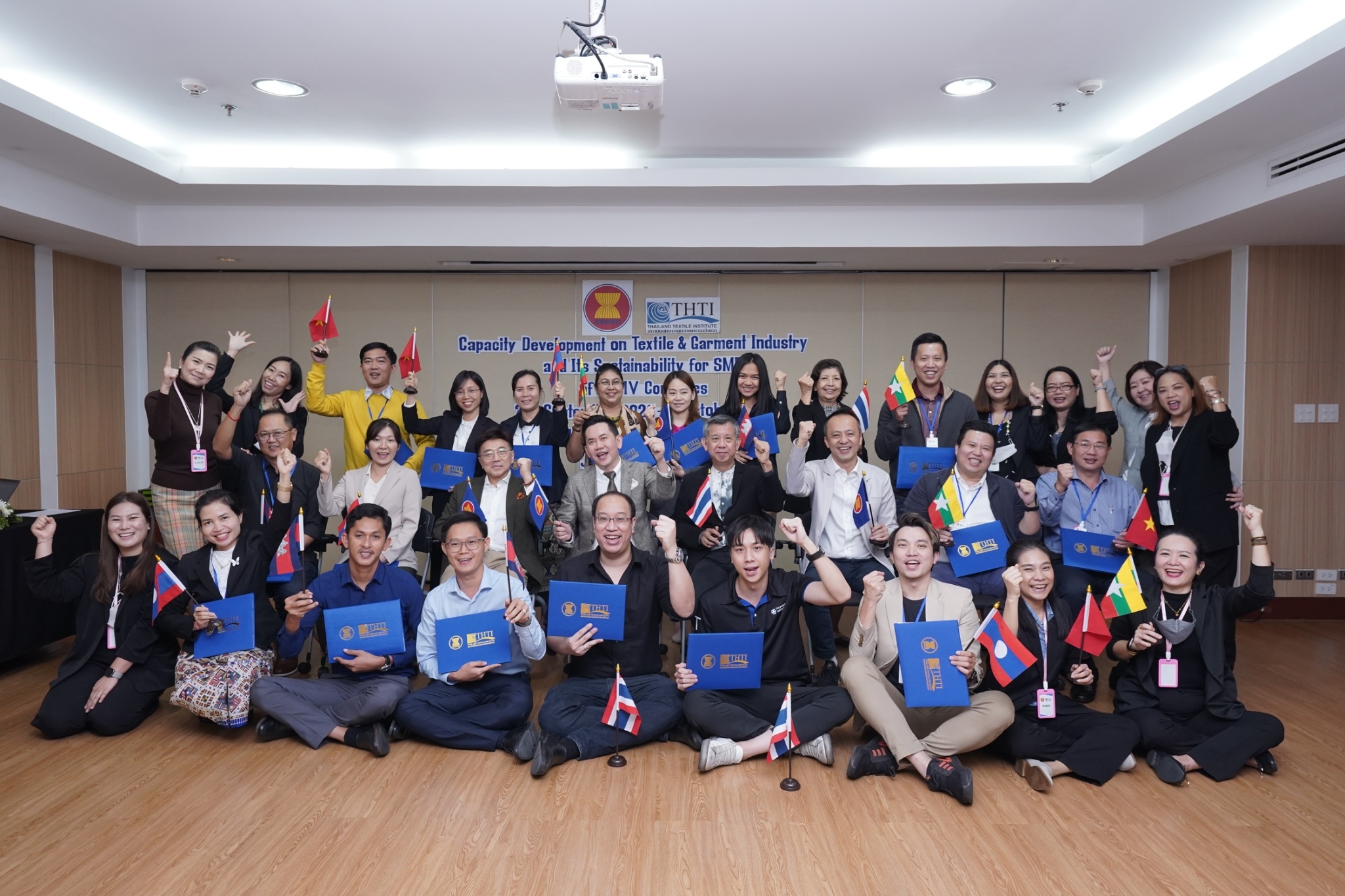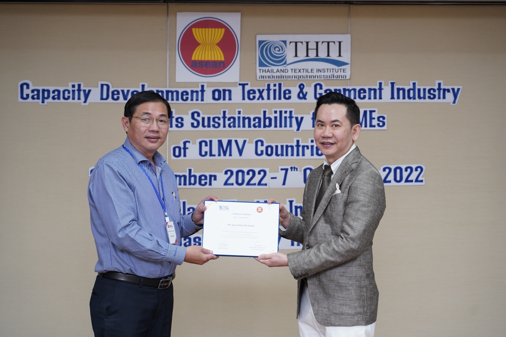 สำหรับกิจกรรมดังกล่าวจัดขึ้น โดยงบกองทุน AHKFTA ภายใต้ความตกลงการค้าเสรี ASEAN-Hong Kong, China Free Trade Agreement - ECOTECH Work Programme ได้เล็งเห็นถึงความสำคัญของผู้ประกอบการ SME ของกลุ่มประเทศ CLMV คือ กัมพูชา ลาว พม่า และเวียดนาม ในอุตสาหกรรมหกรรมสิ่งทอและเครื่องนุ่งห่มที่ได้รับผลกระทบจากการระบาดโควิด 19 ทำให้กำลังการผลิตหยุดชะงักเป็นเวลานาน จำเป็นต้องให้การสนับสนุนอุตสาหกรรมดังกล่าว จึงได้จัดโครงการฝึกอบรมพัฒนาผู้ประกอบการ SME ของกลุ่มประเทศ CLMV ขึ้น โดยกองทุนฯ ได้มอบหมายให้ สถาบันพัฒนาอุตสาหกรรมสิ่งทอ ซึ่งเป็นหน่วยงานภายใต้กำกับและดูแล โดยกระทรวงอุตสาหกรรม มีบทบาทและภารกิจ ในการส่งเสริม พัฒนาอุตสาหกรรมสิ่งทอและเครื่องนุ่งห่มของประเทศไทยทั้งระบบให้สามารถเติบโตได้อย่างมีประสิทธิภาพและยั่งยืน ดำเนินงานศึกษาและสำรวจสถานะอุตสาหกรรมสิ่งทอ และความต้องการในการพัฒนาอุตสาหกรรมสิ่งทอและเครื่องนุ่งห่มของแต่ละประเทศในกลุ่มประเทศ CLMV พร้อมจัดอบรมหลักสูตร Capacity Development on Textile & Garment Industry and Its Sustainability for SMEs of CLMV Countries ระหว่างวันที่ 26 กันยายน - 7 ตุลาคม 2565 เพื่อสร้างองค์ความรู้ และเปิดโอกาสให้ผู้ประกอบการ SME ของกลุ่มประเทศ CLMV และประเทศไทย (CLMV+T)ได้แลกเปลี่ยนเรียนรู้เกี่ยวกับการพัฒนา สร้างสรรค์นวัตกรรม และความร่วมมือใหม่ ๆ พร้อมนำเยี่ยมชม ศูนย์วิเคราะห์ทดสอบสิ่งทอ สถาบันฯสิ่งทอ และ บริษัท ทองไทยการทอ จำกัด และ บริษัท กู๊ดสตาร์ท จำกัด โรงงานอุตสาหกรรมสิ่งทอและเครื่องนุ่มห่มในประเทศไทย รวมทั้งจัดตั้งกลุ่มเพื่อเชื่อมโยงเครือข่ายบนแพลตฟอร์มออนไลน์ facebook group : Sustain2gether เพื่อส่งผ่านข้อมูลข่าวสารแบ่งปันความรู้สร้างความเข้มแข็งและการพัฒนาอุตสาหกรรมสิ่งทอและเครื่องนุ่งห่มร่วมกันอย่างต่อเนื่องและยั่งยืนในอนาคต
