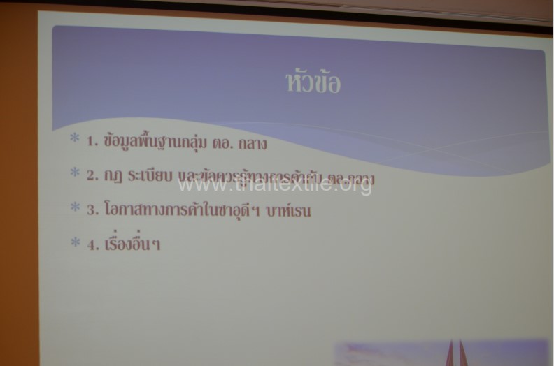 โดยได้รับเกียรติจากผู้ทรงคุณวุฒิ คุณสมพล รัตนาภิบาล อดีตผู้ตรวจราชการกระทรวงอุตสาหกรรม บรรยายใน หัวข้อ การจัดการและกระบวนการผลิตอุตสาหกรรมฮาลาล และ คุณฐานิตศร์ ณ สงขลา อดีตเอกอัคราชทูต สถานเอกอัครราชทูต กรุงมานามา ราชอาณาจักรบาห์เรน บรรยายในหัวข้อ "เปิดประตูสินค้าไทยสู่ตะวันออกกลาง" โดยมี ดร.ชาญชัย สิริเกษมเลิศ ร่วมฟังบรรยาย ณ ห้อง MR208 C ศูนย์การประชุมแห่งชาติสิริกิติ์ ทั้งนี้เพื่อสร้างโอกาสและสร้างองค์ความรู้ในการขยายตลาดให้กับผู้ประกอบการอุตสาหกรรมสิ่งทอเครื่องนุ่งห่มสู่ตะวันออกกลางในอนาคต