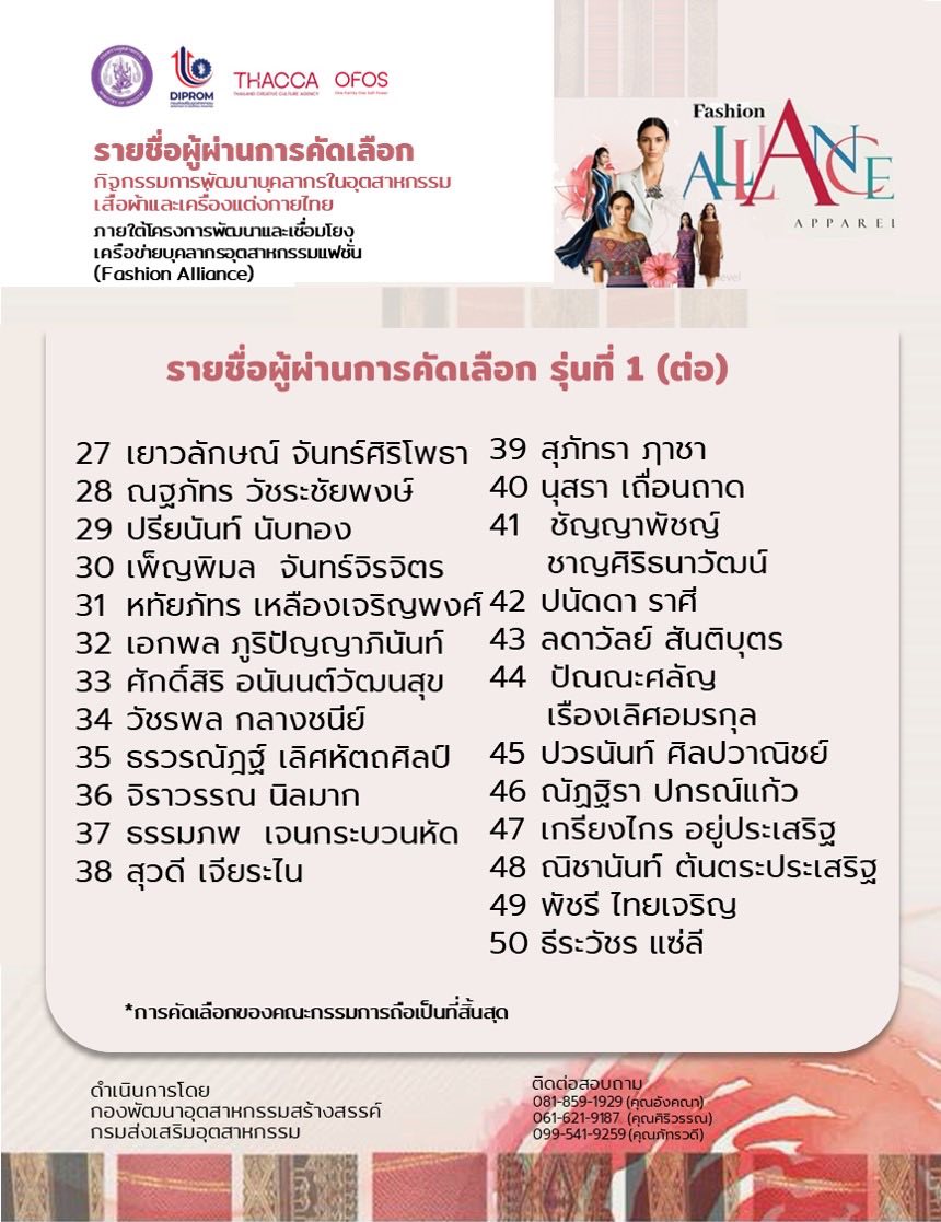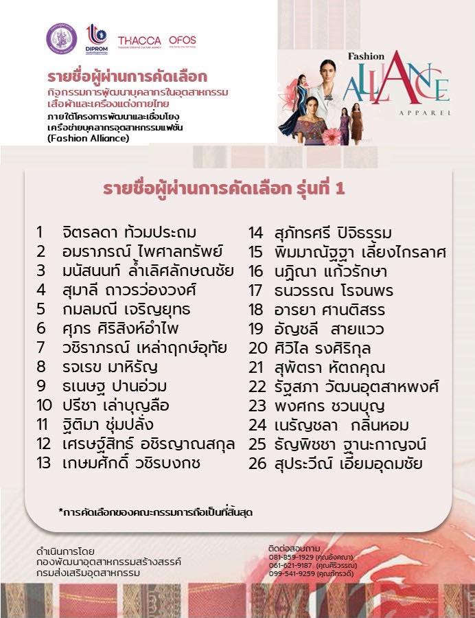 13 พ.ค. 68 ดีพร้อมคัดเลือกผู้เข้าร่วมกิจกรรมพัฒนาบุคลากรในอุตสาหกรรมเสื้อผ้าและเครื่องแต่งกายไทย (Soft Power Fashion Apparel Alliance) ภายใต้โครงการ พัฒนาและเชื่มโยงเครือข่ายบุคลากรอุตสาหกรรมแฟชั่น (Fashion Alliance) โดยคณะกรรมการผู้ทรงคุณวุฒิ