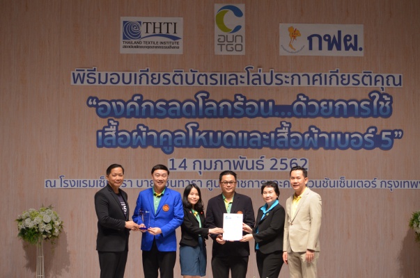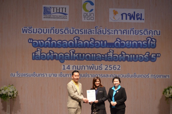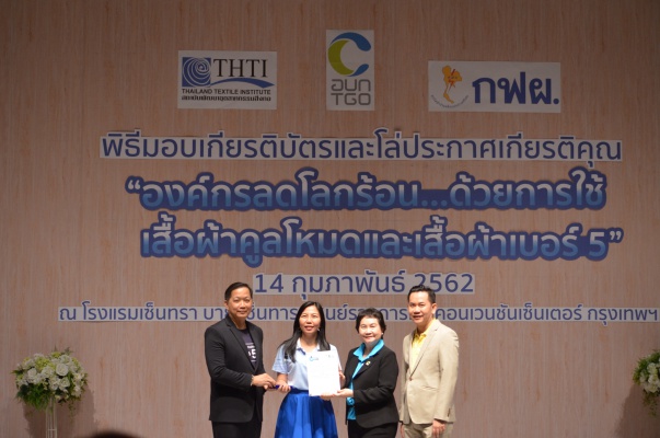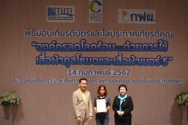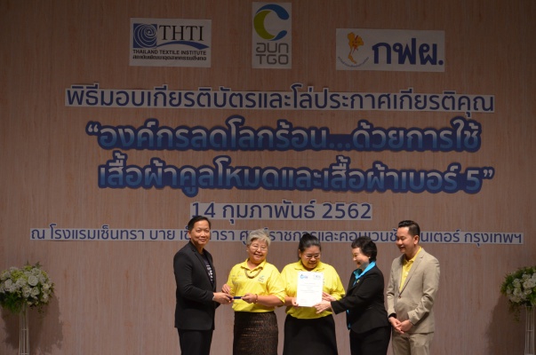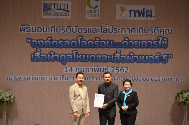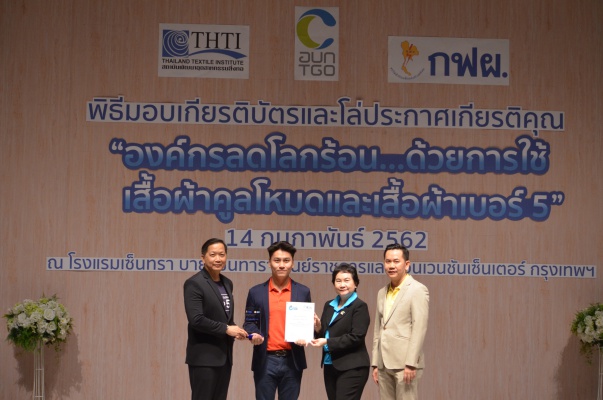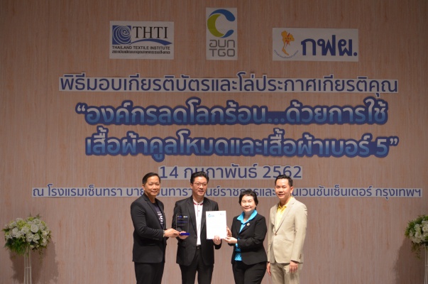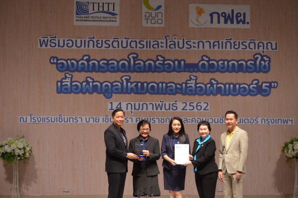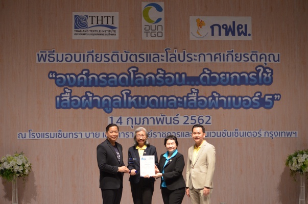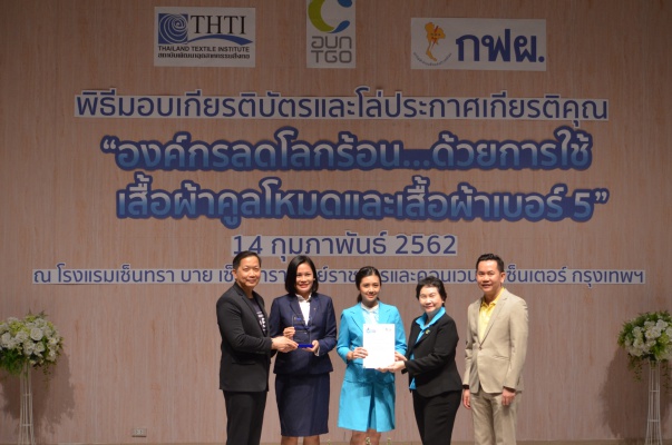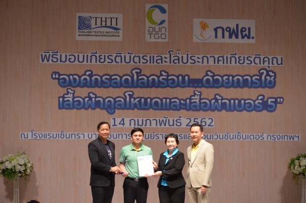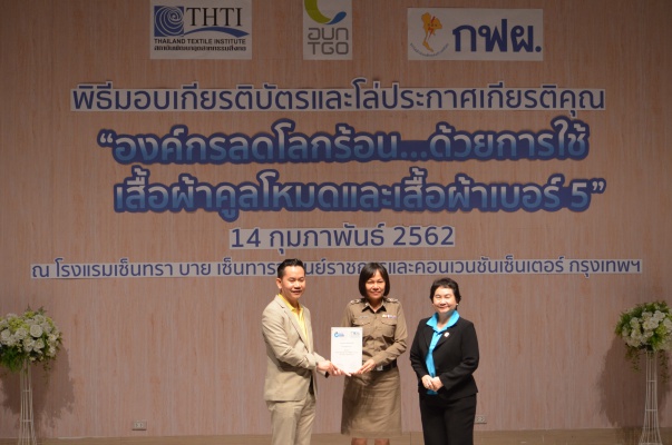 14 ก.พ.62 นางประเสริฐสุข เพฑูรย์สิทธิชัย ผู้อำนวยการองค์การบริหารจัดการก๊าซเรือนกระจก (องค์การมหาชน) (อบก.) นายจิระศักดิ์ มัณฑางกูร ผู้อำนวยการฝ่ายบริหารด้านการใช้ไฟฟ้าและกิจการเพื่อสังคม การไฟฟ้าฝ่ายผลิตแห่งประเทศไทย (กฟผ.) และ ดร.ชาญชัย สิริเกษมเลิศ ผู้อำนวยการสถาบันพัฒนาอุตสาหกรรมสิ่งทอ (สสท.) ร่วมกันแถลงความร่วมมือ พร้อมมอบเกียรติบัตรและโล่ประกาศเกียรติคุณให้กับหน่วยงาน ทั้งภาครัฐและภาคเอกชน จำนวน 87 หน่วยงาน เพื่อแสดงความขอบคุณที่ให้ความร่วมมือในการใช้เสื้อผ้าคูลโหมด และเสื้อผ้าเบอร์ 5 ภายในงานพิธีมอบเกียรติบัตรและโล่ประกาศเกียรติคุณ “องค์กรลดโลกร้อน...ด้วยการใช้เสื้อผ้าคูลโหมดและเสื้อผ้าเบอร์ 5” ซึ่งทาง อบก. ได้ร่วมกับ กฟผ.และ สสท.จึดขึ้น ณ ห้องประชุมออดิทอเรียม โรงแรมเซ็นทรา บายเซ็นทารา ศูนย์ราชการและคอนเวนชันเซ็นเตอร์ แจ้งวัฒนะ กรุงเทพฯ