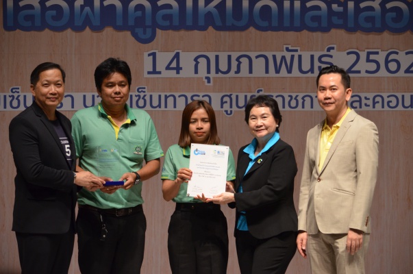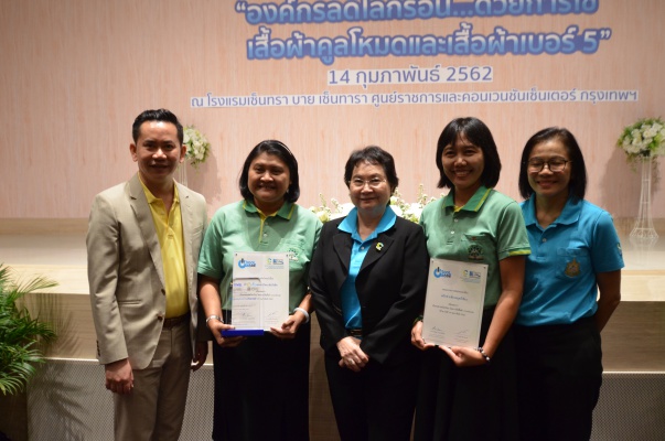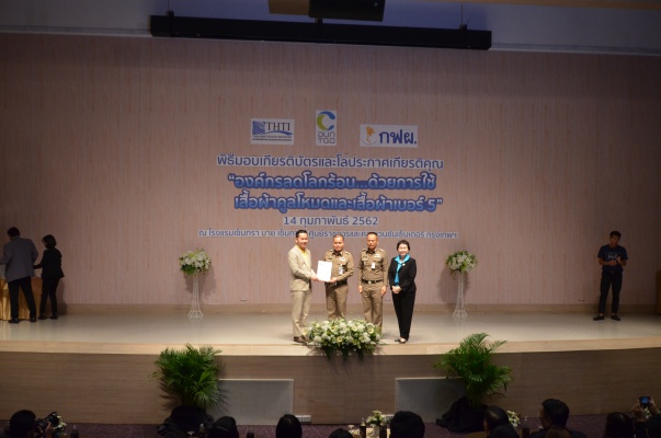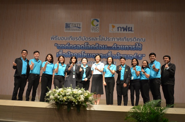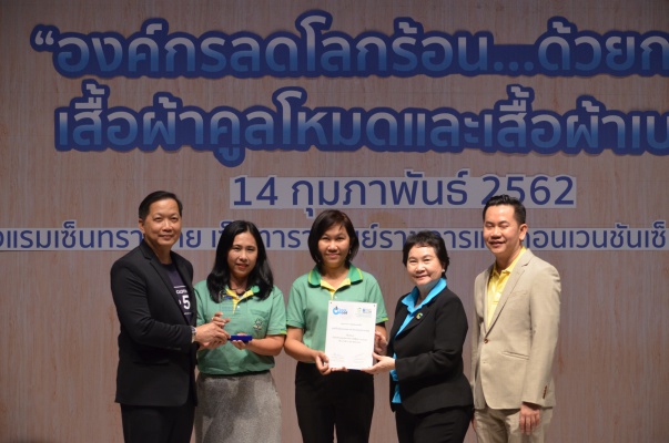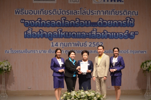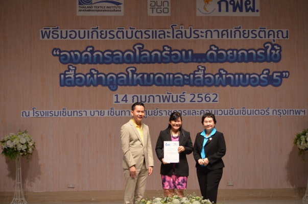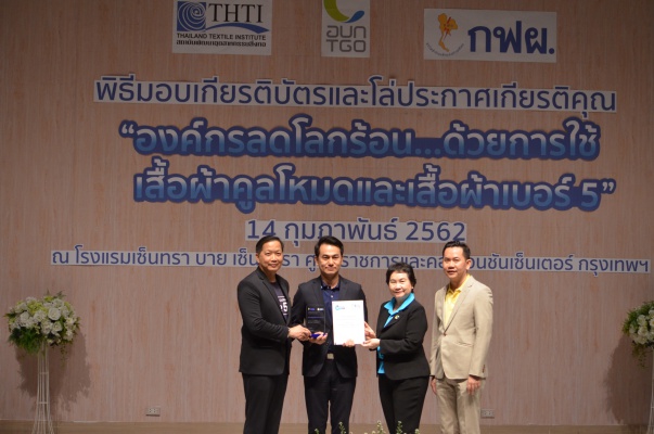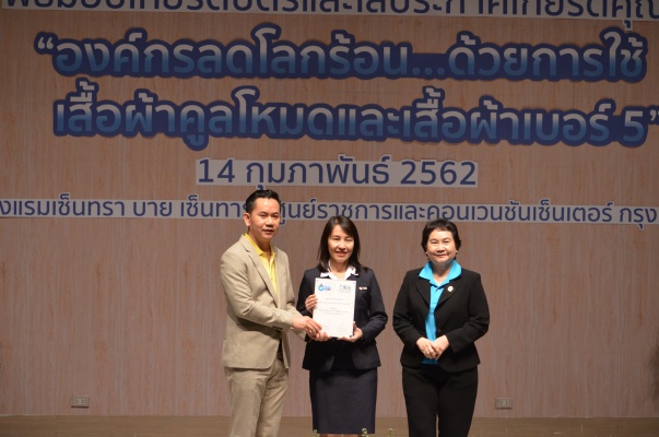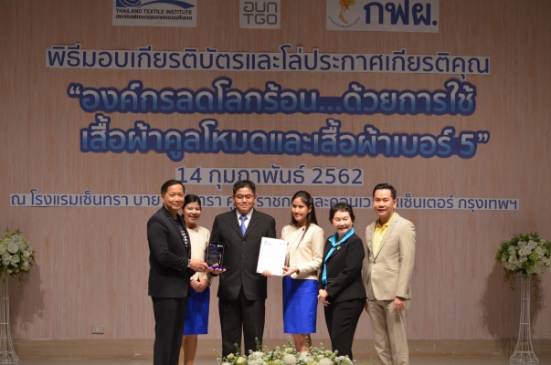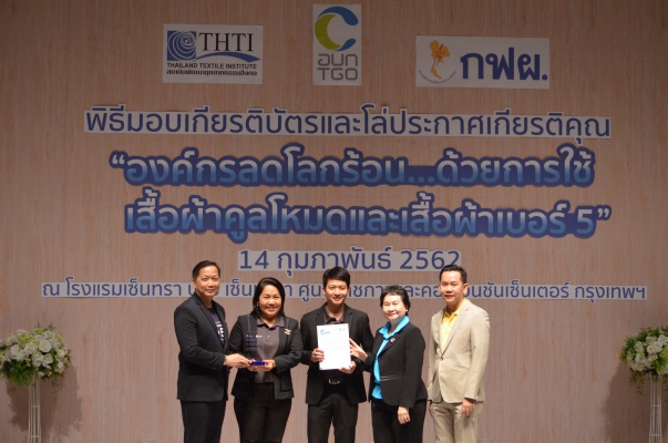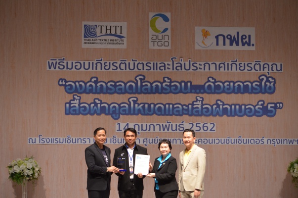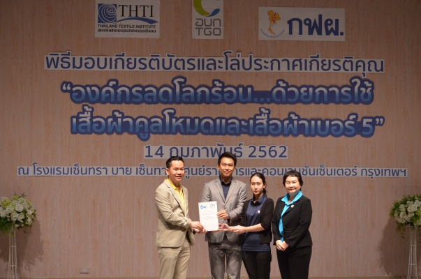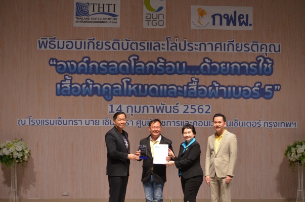 14 ก.พ.62 นางประเสริฐสุข เพฑูรย์สิทธิชัย ผู้อำนวยการองค์การบริหารจัดการก๊าซเรือนกระจก (องค์การมหาชน) (อบก.) นายจิระศักดิ์ มัณฑางกูร ผู้อำนวยการฝ่ายบริหารด้านการใช้ไฟฟ้าและกิจการเพื่อสังคม การไฟฟ้าฝ่ายผลิตแห่งประเทศไทย (กฟผ.) และ ดร.ชาญชัย สิริเกษมเลิศ ผู้อำนวยการสถาบันพัฒนาอุตสาหกรรมสิ่งทอ (สสท.) ร่วมกันแถลงความร่วมมือ พร้อมมอบเกียรติบัตรและโล่ประกาศเกียรติคุณให้กับหน่วยงาน ทั้งภาครัฐและภาคเอกชน จำนวน 87 หน่วยงาน เพื่อแสดงความขอบคุณที่ให้ความร่วมมือในการใช้เสื้อผ้าคูลโหมด และเสื้อผ้าเบอร์ 5 ภายในงานพิธีมอบเกียรติบัตรและโล่ประกาศเกียรติคุณ “องค์กรลดโลกร้อน...ด้วยการใช้เสื้อผ้าคูลโหมดและเสื้อผ้าเบอร์ 5” ซึ่งทาง อบก. ได้ร่วมกับ กฟผ.และ สสท.จึดขึ้น ณ ห้องประชุมออดิทอเรียม โรงแรมเซ็นทรา บายเซ็นทารา ศูนย์ราชการและคอนเวนชันเซ็นเตอร์ แจ้งวัฒนะ กรุงเทพฯ