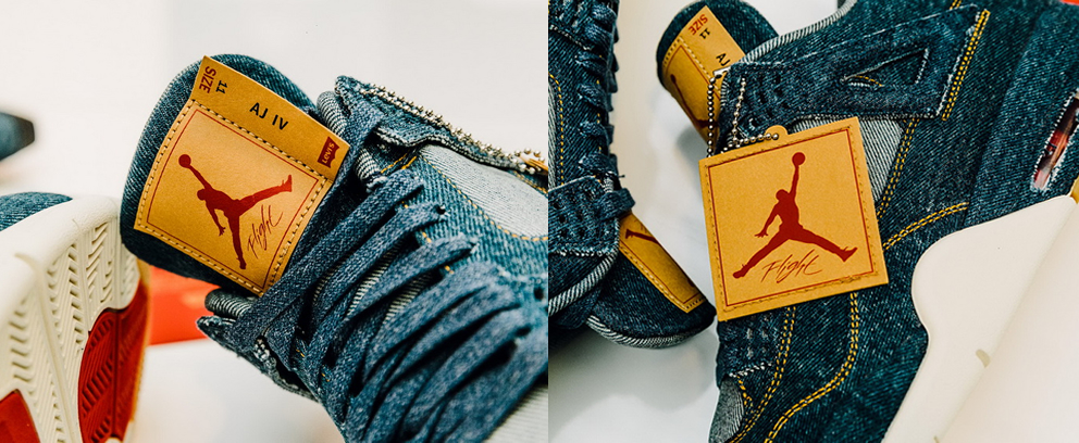 ความน่าสนใจของผลงานชิ้นเอกครั้งนี้ คือ การผสมผสานระหว่าง “Identity” ระหว่างสองแบรนด์เข้าด้วยกัน โดยในส่วนสนีกเกอร์ “Air Jordan IV” คอลเลคชั่นพิเศษนี้ ใช้วัสดุผ้ายีนส์ของ “Levi’s®” ทั้งภายใน-ภายนอกรองเท้า ซึ่งด้านนอกรองเท้า ใช้ด้ายเย็บสีน้ำตาลทอง และติดป้ายแดงต้นฉบับของ “Levi’s®” ขณะเดียวกันตรงส่วนเชือกรองเท้า เลือกใช้สีคราม เพื่อให้กลมกลืนไปกับตัวรองเท้า นอกจากนี้ตรงลิ้นรองเท้า ติดป้ายหนัง เหมือนเช่นกางเกงยีนส์ พร้อมทั้งประทับโลโก้แบรนด์ “Jordan” และ “Levi’s®” อยู่รวมบนแผ่นป้ายเดียวกัน ส่วนพื้นรองเท้า คงรักษาเอกลักษณ์ความเป็น Air Jordan