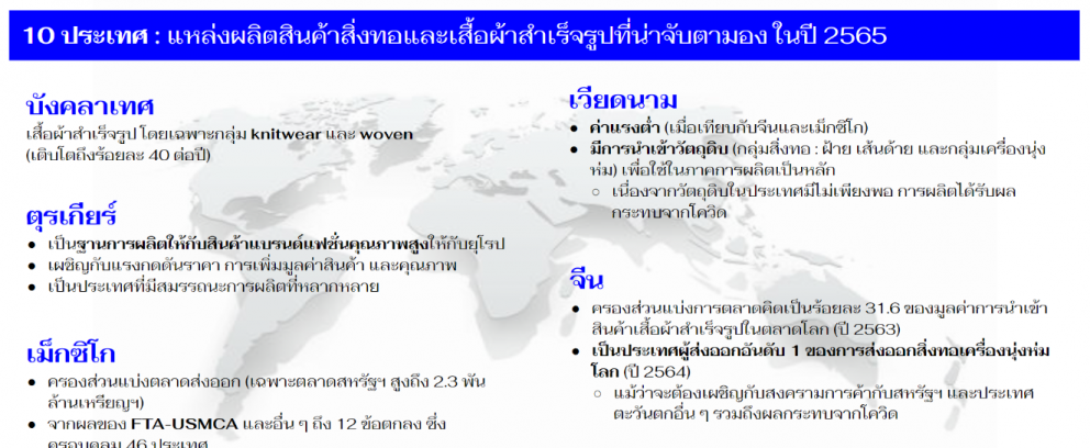 10 ประเทศ : แหล่งผลิตสินค้าสิ่งทอและเสื้อผ้าสำเร็จรูปที่น่าจับตามอง ในปี 2565