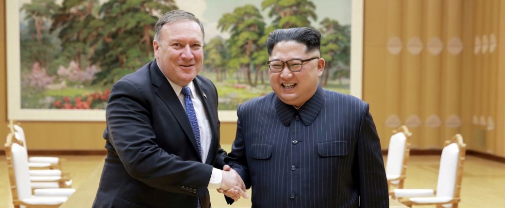 North Korean leader Kim Jong Un shakes hands with U.S. Secretary of State Mike Pompeo, May 9, 2018, released by North Korea's Korean Central News Agency (KCNA) in Pyongyang.