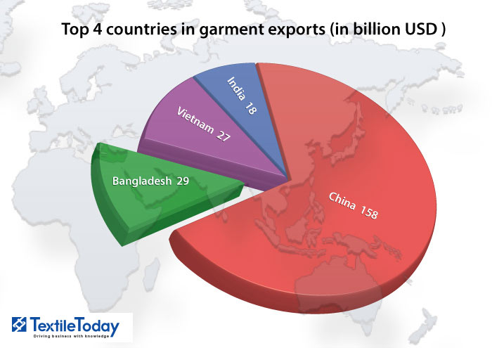 จากข้อมูลองค์การการค้าโลก (WTO) ปี 2017 พบว่า เวียดนาม มีมูลค่าการส่งออกเสื้อผ้าสำเร็จรูปอยู่ที่ 27 พันล้านเหรียญสหรัฐฯ และมีส่วนแบ่งตลาดเท่ากับ 5.9 อินเดียอยู่อันดับที่ 4 มีมูลค่าการส่งออกเสื้อผ้าสำเร็จรูปเท่ากับ 18 พันล้านเหรียญสหรัฐฯ และตุรกีอยู่อันดับที่ 5 โดยมีส่วนแบ่งตลาดอยู่ที 3.3%