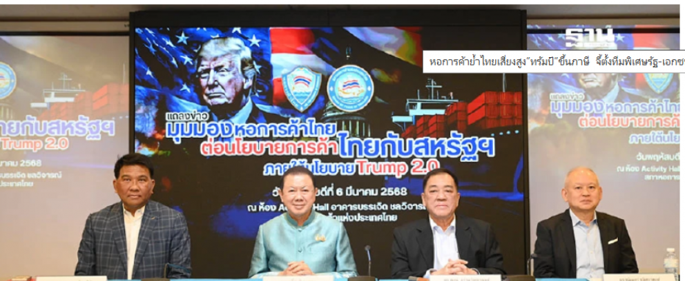 รายงานข่าวจากหอการค้าไทย (6 มี.ค. 2568) ผู้บริหารของหอการค้าไทยได้ออกแถลงการณ์ย้ำรัฐบาลให้เตรียมความพร้อมรับมือกับการเปลี่ยนแปลงนโยบายการค้าของสหรัฐอเมริกา ภายใต้การบริหารของประธานาธิบดีโดนัลด์ ทรัมป์ ซึ่งมีความเสี่ยงส่งผลกระทบต่อเศรษฐกิจไทยและโลกอย่างมีนัยสำคัญ ทั้งนี้ไทยมีความเสี่ยงที่จะถูกขึ้นภาษี เนื่องจากเป็นหนึ่งในประเทศที่สหรัฐขาดดุลการค้าในลำดับที่ 11