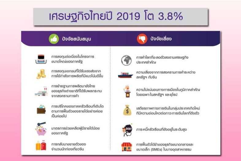 อย่างไรก็ตามในปี 2562 นี้ ธนาคารคาดว่าเศรษฐกิจของไทยยังคงมีอัตราการเติบโตได้ในทิศทางที่ดี โดยมีปัจจัยบวกจากการลงทุนต่อเนื่องในโครงการขนาดใหญ่ของภาครัฐ การลงทุนของภาคเอกชนที่ได้รับแรงส่งจากการใช้กำลังการผลิตที่มีแนวโน้มดีขึ้น การย้ายฐานการผลิตมายังไทยของธุรกิจต่างชาติที่ได้รับผลกระทบจากสงครามการค้า การบริโภคของภาคครัวเรือนที่เติบโตามการฟื้นตัวของรายได้อย่างค่อยเป็นค่อยไป รวมไปถึงมาตรการช่วยเหลือผู้มีรายได้น้อยของภาครัฐ และ การกลับมาการขยายตัวของจำนวนนักท่องเที่ยวจีน