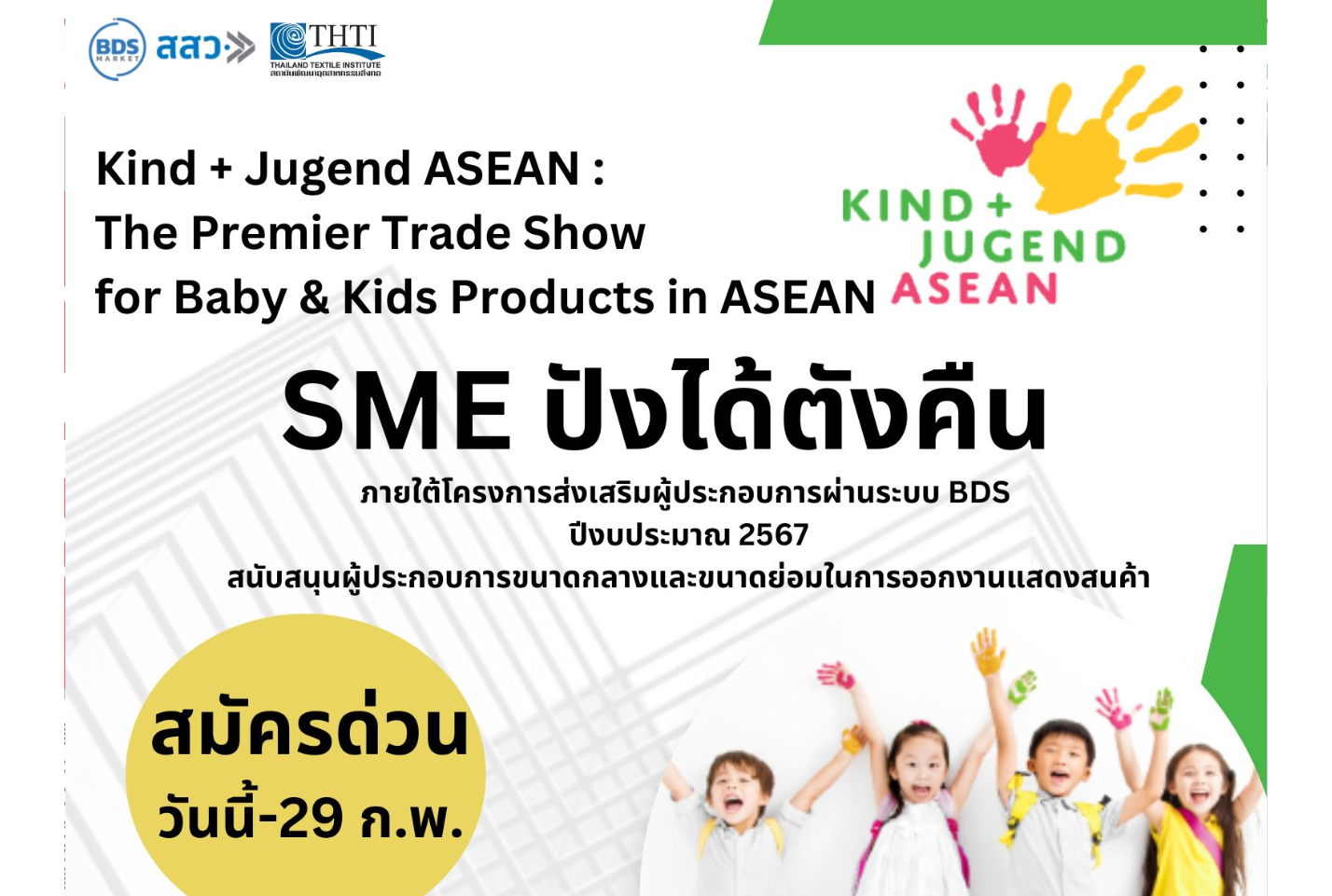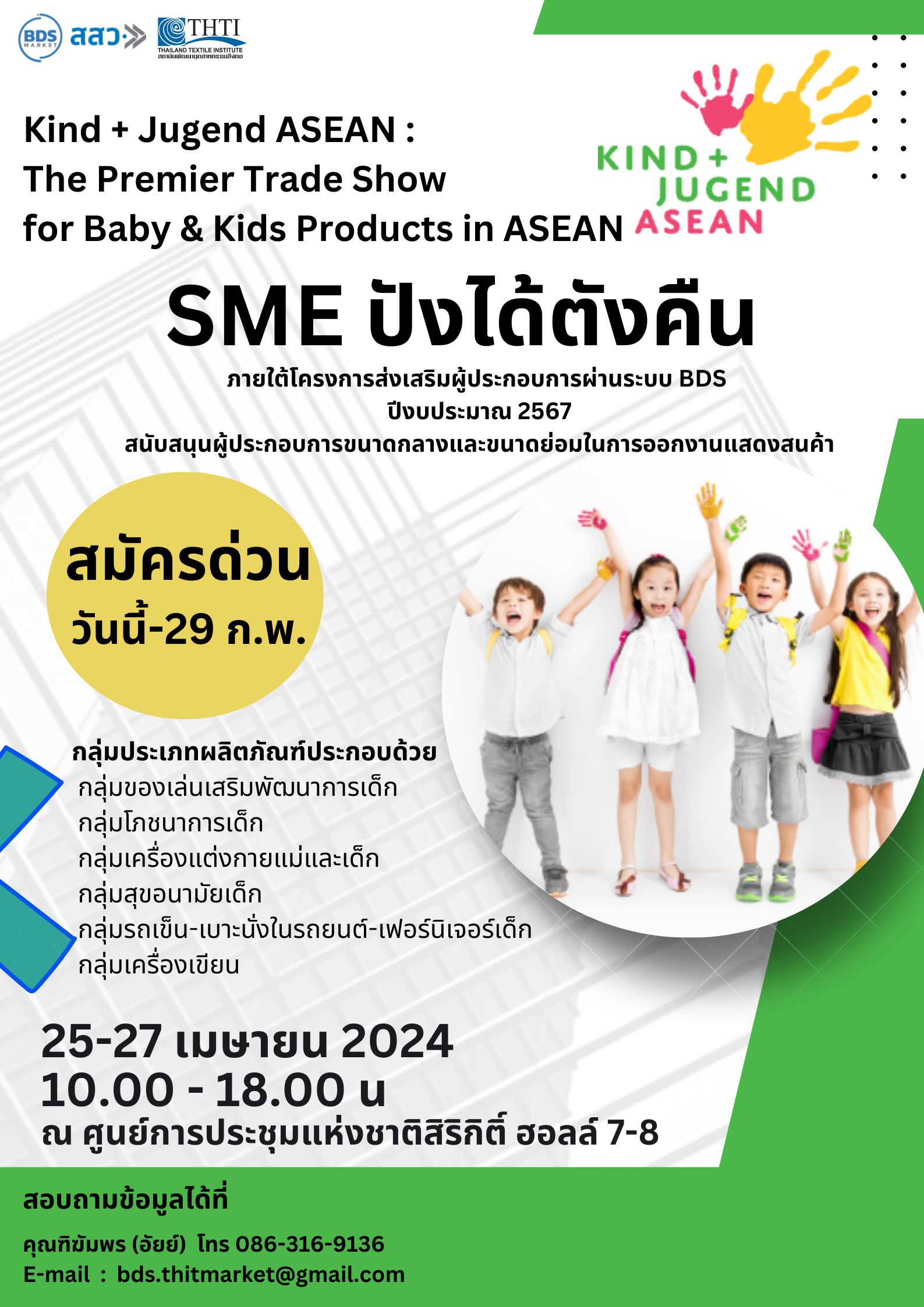 สถาบันพัฒนาอุตสาหกรรมสิ่งทอ ผู้ให้บริการทางธุรกิจ (Business Development Service Provider : BDSP) ขอเชิญผู้ประกอบการกลุ่มผลิตภัณฑ์ แม่และเด็ก ที่ต้องการพบปะกับผู้ซื้อตัวจริงจากทั่วทั้งเอเชียแปซิฟิกในงาน Kind + Jugend ASEAN 2024 มหกรรมสินค้าแม่และเด็กแห่งอาเซียน!!ระหว่างวันที่ 25 - 27 เมษายน 2567 ศูนย์การประชุมแห่งชาติสิริกิติ์ ฮอลล์ 7-8 กรุงเทพฯ กลุ่มประเภทผลิตภัณฑ์ประกอบด้วย