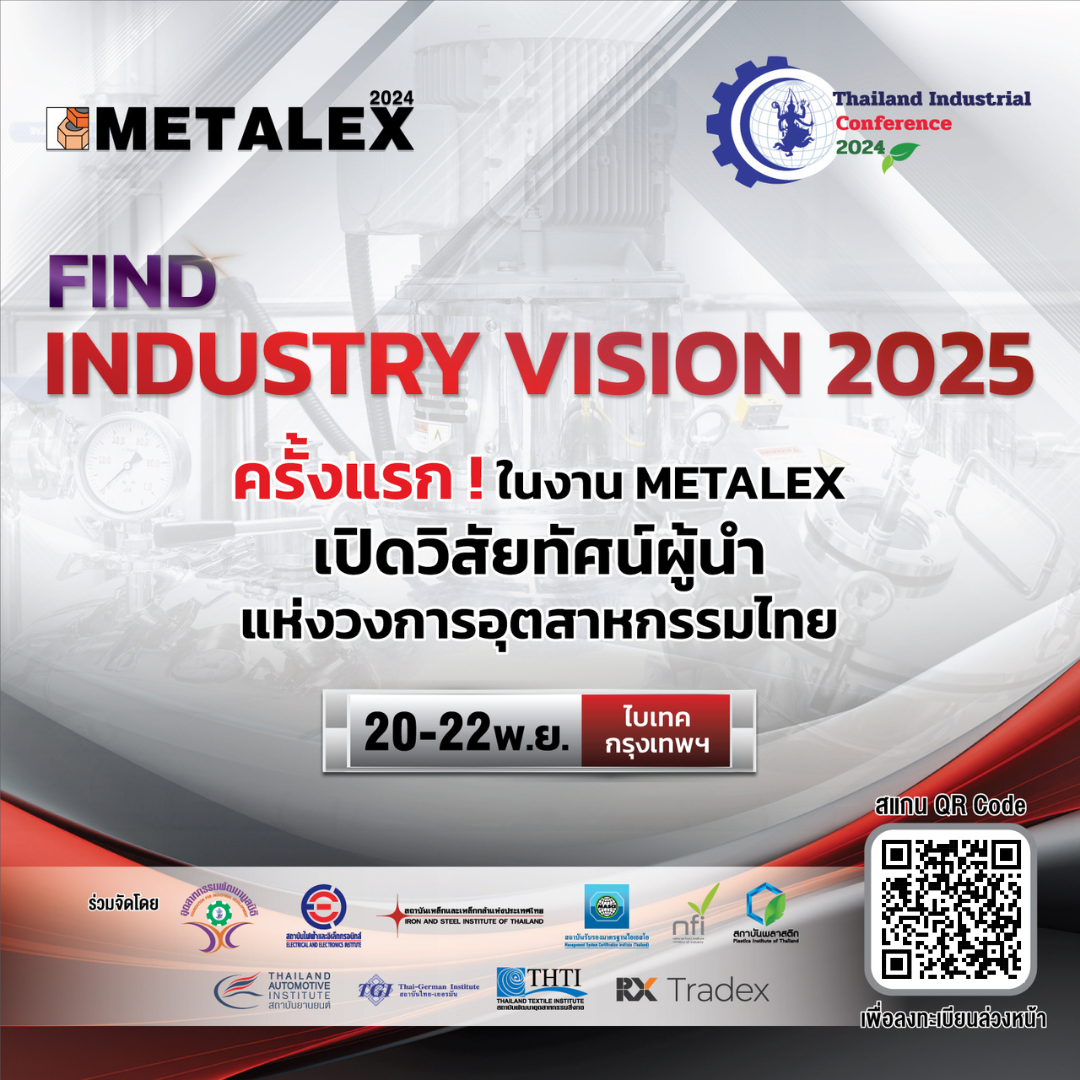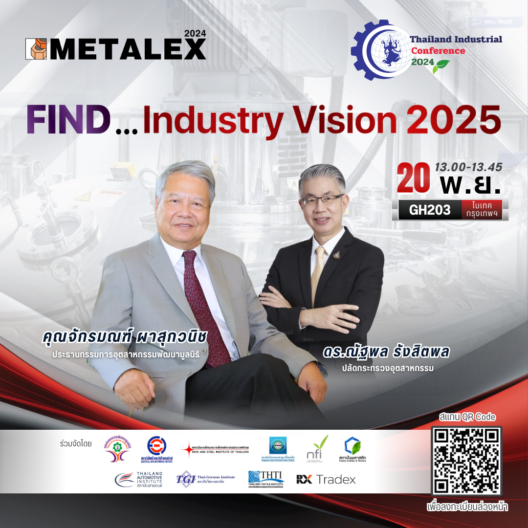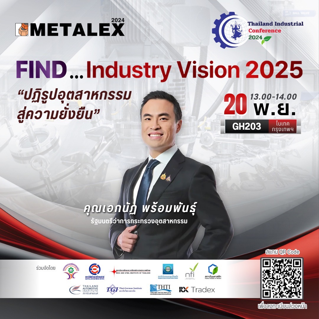 อุตสาหกรรมพัฒนามูลนิธิ สถาบันพัฒนาอุตสาหกรรมสิ่งทอ และสถาบันเครือข่าย ร่วมกับ อาร์เอ็กซ์ เทรดเด็กซ์ “FIND Industry Vision 2025” จัดงานประชุมวิชาการ พร้อม ระดมความคิดเห็นจากผู้เกี่ยวข้องทั้งภาครัฐและเอกชนในการกำหนดทิศทางการปฏิรูปโครงสร้างอุตสาหกรรม ภายในงาน METALEX 2024 มหกรรมเครื่องจักรกลและเทคโนโลยีโลหการอันดับหนึ่งของอาเซียน – ครั้งที่ 38