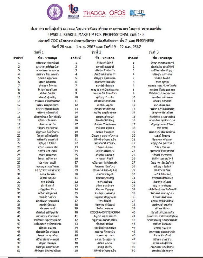 ประกาศรายชื่อผู้เข้าร่วมอบรม UpSkill ReSkill Make up for Professional รุ่นที่ 1 - 3 ภายใต้โครงการพัฒนาศักยภาพบุคลากรในอุตสาหกรรมแฟชั่น UpSkill ReSkill (Soft Power Fashion)