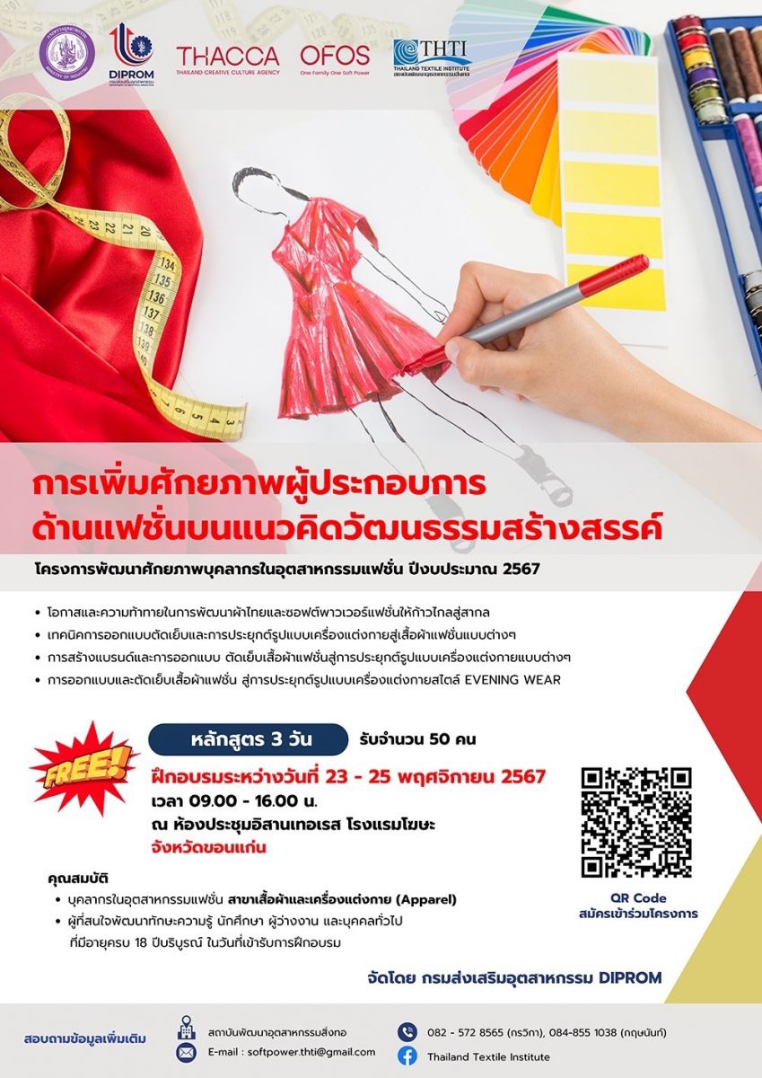 โครงการพัฒนาศักยภาพบุคลากรในอุตสาหกรรมแฟชั่น ปีงบประมาณ 2567 การเพิ่มศักยภาพผู้ประกอบการด้านแฟชั่นบนแนวคิดวัฒนธรรมสร้างสรรค์ 23 - 25 พ.ย. 2567