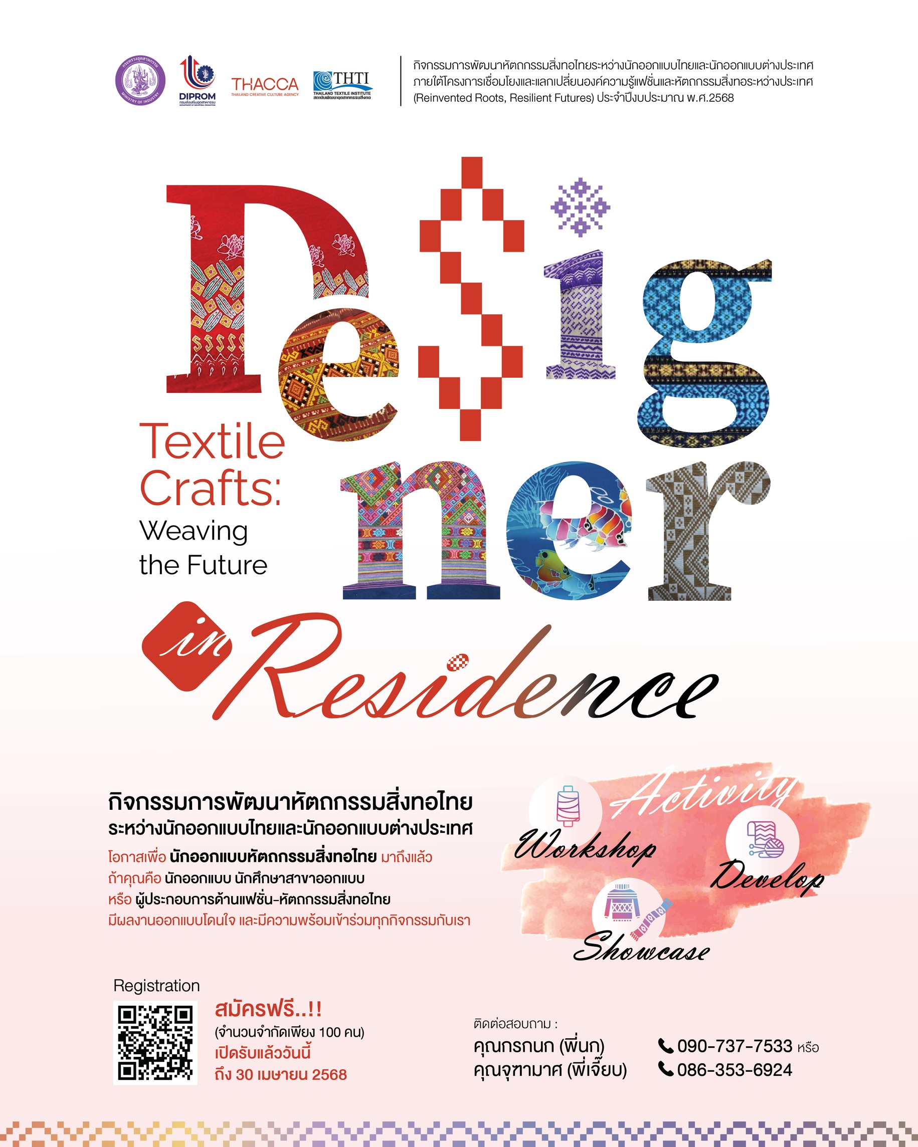 🎉กิจกรรม การพัฒนาหัตถกรรมสิ่งทอไทยระหว่างนักออกแบบไทยและนักออกแบบต่างประเทศ (Designer in Residence) ปี พ.ศ. 2568 📣เปิดรับสมัครผู้เข้าร่วมกิจกรรม