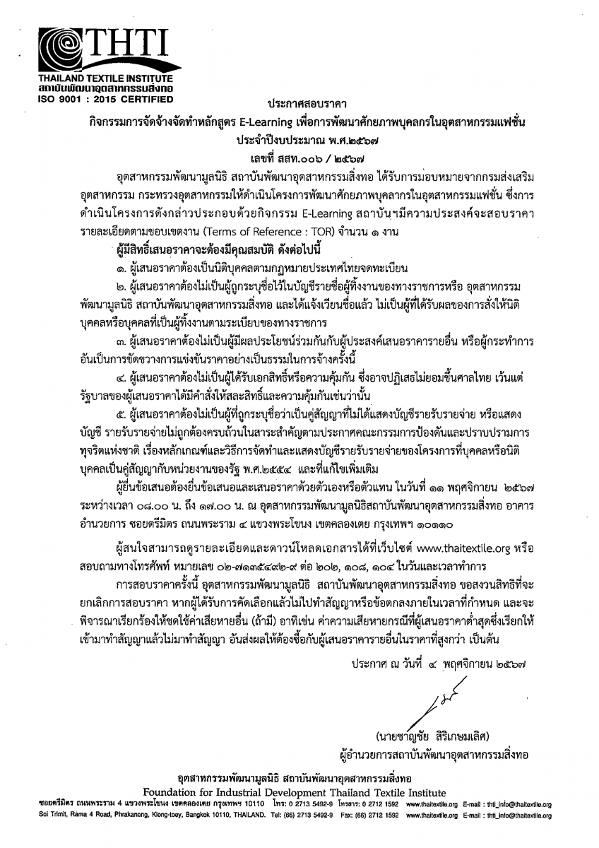 ประกาศสอบราคา กิจกรรมการจัดจ้างจัดทำหลักสูตร E-Learning เพื่อการพัฒนาศักยภาพบุคลกรในอุตสาหกรรมแฟชั่น ประจำปีงบประมาณ พ.ศ.2567 เลขที่ สสท.006 / 2567