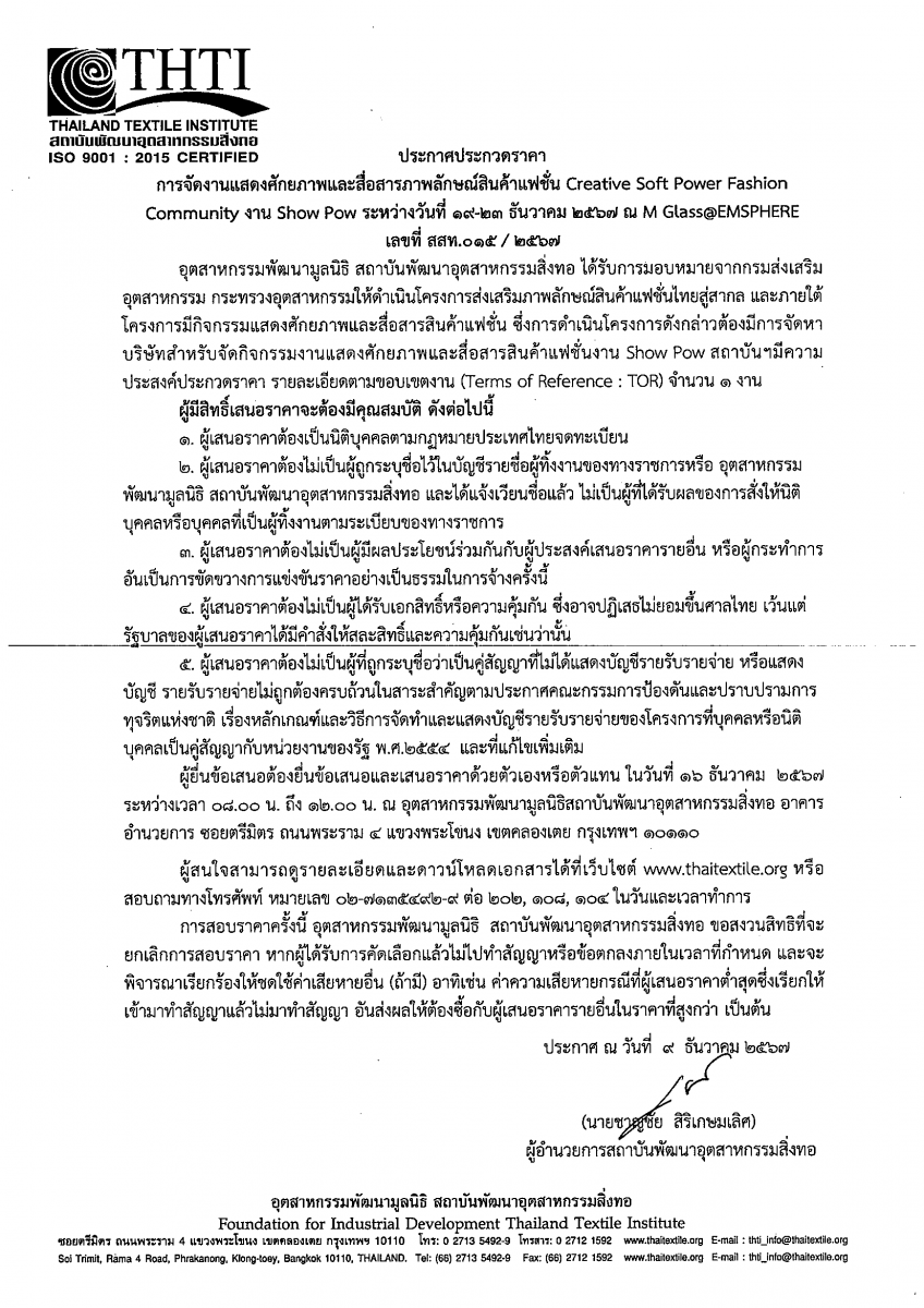 ประกาศประกวดราคา การจัดงานแสดงศักยภาพและสื่อสารภาพลักษณ์สินค้าแฟชั่น Creative Soft Power Fashion Community งาน Show Pow วันที่ 13-19 ธันวาคม 2567 เลขที่ สสท.014/2567
