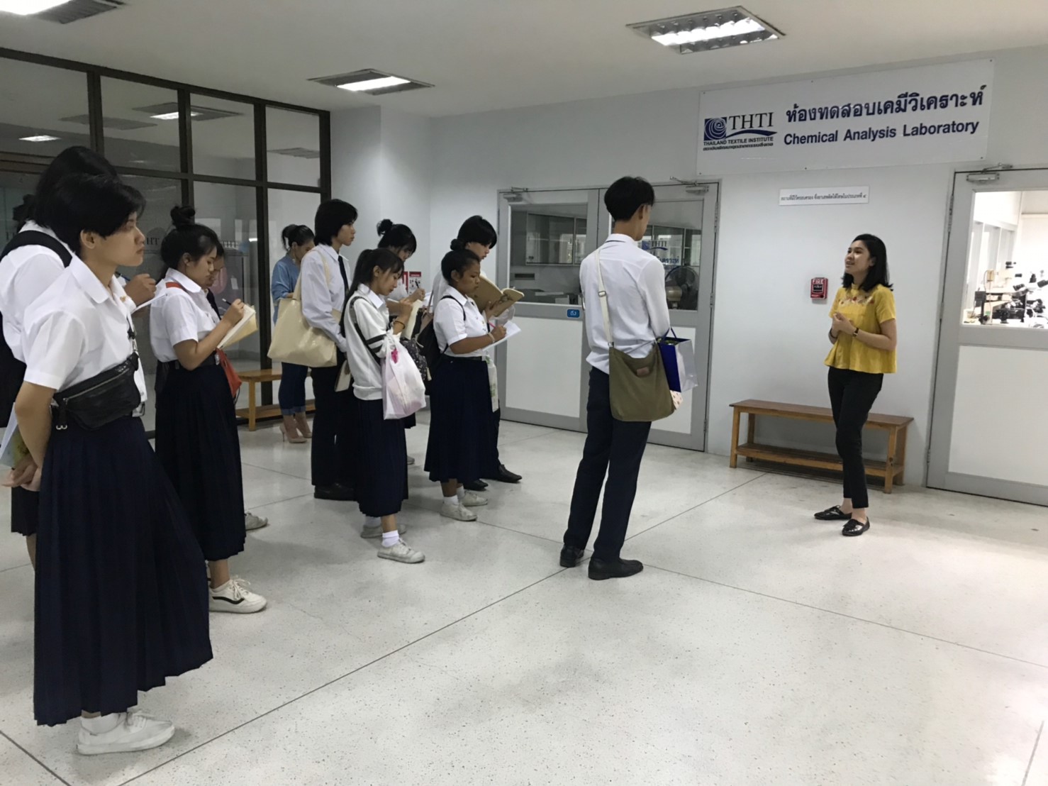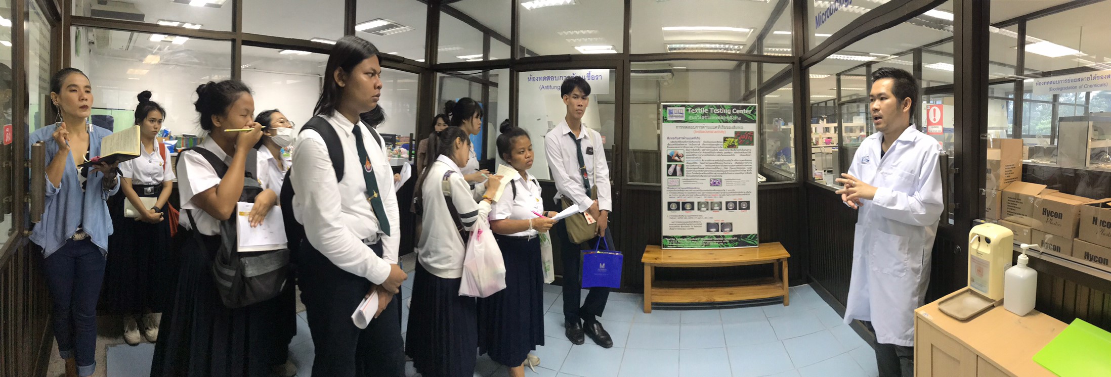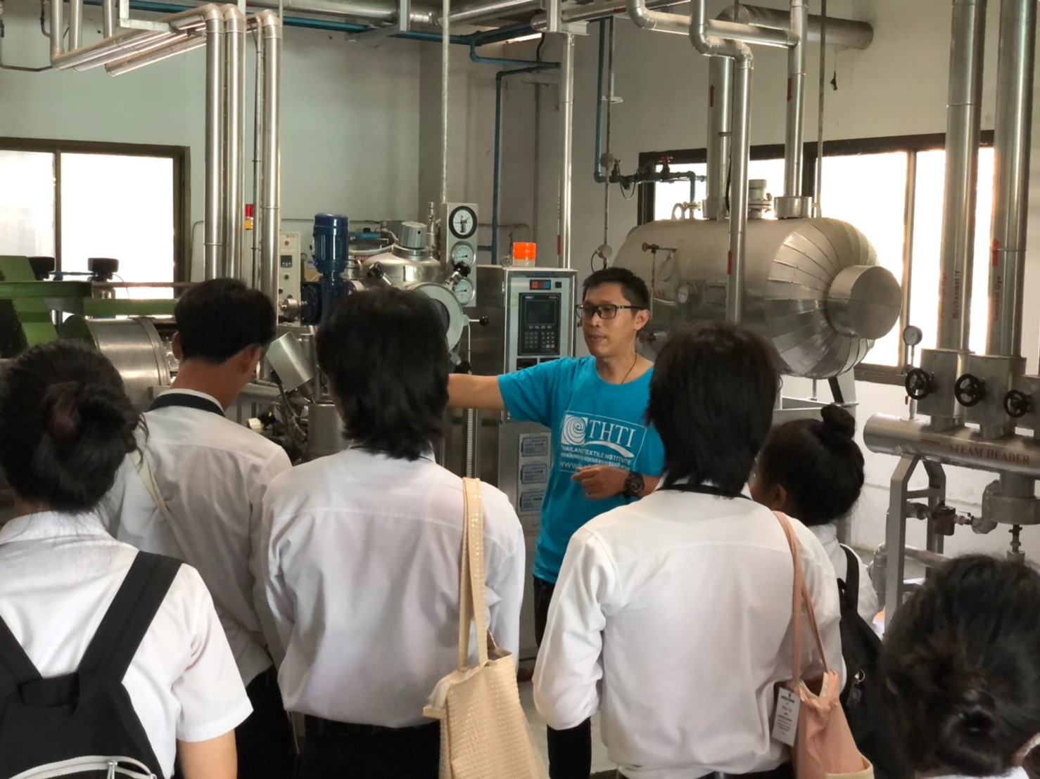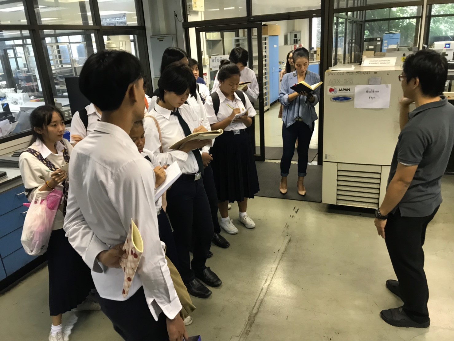 นางทิพวรรณ พาณิชการ รักษาการ ผู้อำนวยการศูนย์วิเคราะห์ทดสอบสิ่งทอ สถาบันพัฒนาอุตสาหกรรมสิ่งทอ ให้การต้อนรับอาจารย์และนักศึกษาจาก คณะเทคโนโลยีคหกรรมศาสตร์ (วิชาวัสดุสิ่งทอและการตัดเย็บเพื่องานแฟชั่น) สาขาการออกแบบแฟชั่นระดับปริญญาตรี มหาวิทยาลัยเทคโนโลยีราชมงคลกรุงเทพ ในโอกาสเข้าเยี่ยมชมศึกษาดูงาน ณ สถาบันพัฒนาอุตสาหกรรมสิ่งทอ