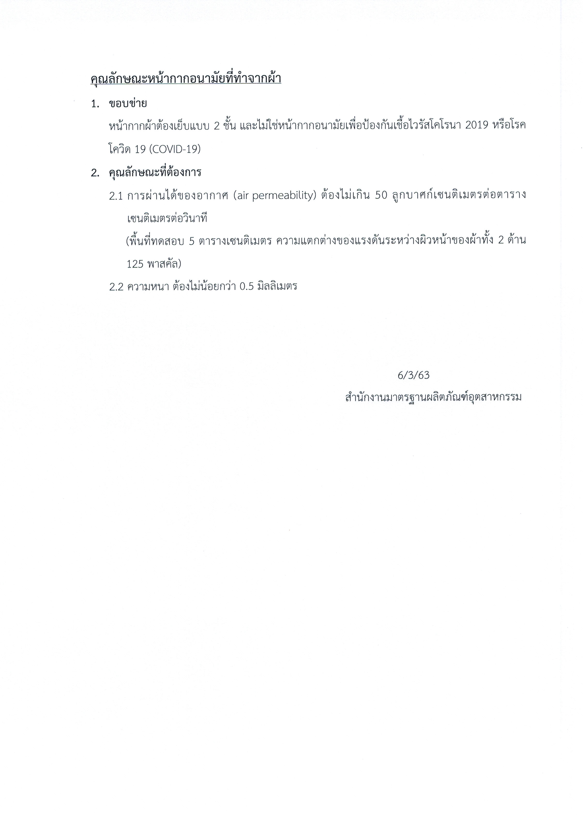 กระทรวงอุตสาหกรรมได้ออกประกาศเมื่อวันที่ 6 มีนาคม 2563 เรื่องข้อแนะนำคุณลักษณะผ้าที่ใช้ในการผลิตหน้ากากอนามัยสำหรับประชาชน เพื่อลดความเสี่ยงในการติดเชื้อโรคติดเชื้อไวรัสโคโรนา 2019 (COVID-19) เพื่อประโยชน์ในการสนับสนุนการผลิตหน้ากากอนามัยที่ทำจากผ้าให้มีคุณภาพเพียงพอและราคาที่เหมาะสม โดยคุณลักษณะของผ้าแนบท้ายประกาศได้ผ่านการจัดทำโดยสถาบันพัฒนาอุตสาหกรรมสิ่งทอ และสำนักงานมาตรฐานผลิตภัณฑ์อุตสาหกรรม ดังนี้