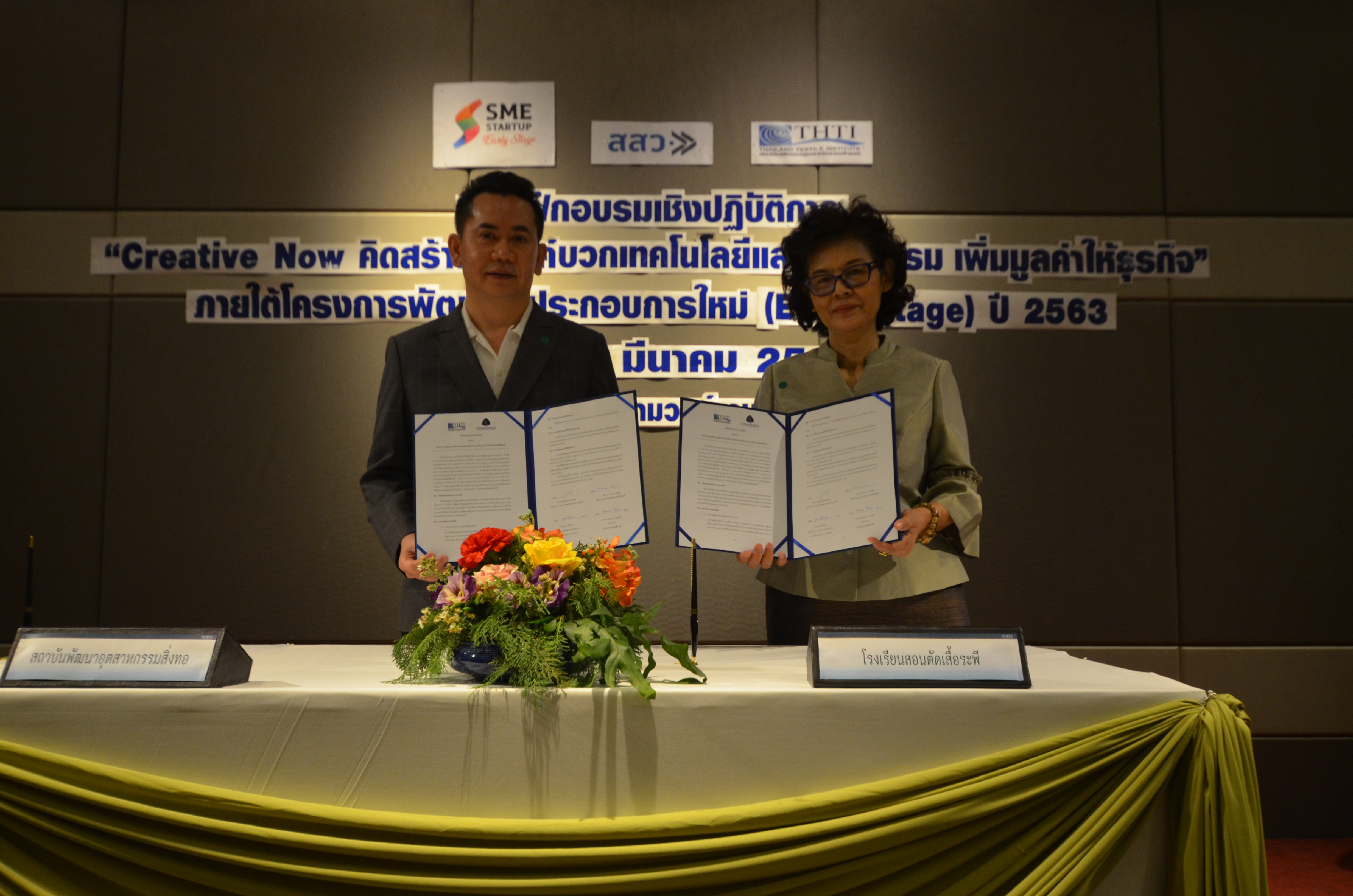 ดร.ชาญชัย สิริเกษมเลิศ ผู้อำนวยการสถาบันพัฒนาอุตสาหกรรมสิ่งทอ และ พ.ต.อ. นาตยา นครชัย ผู้บริหารโรงเรียนสอนตัดเสื้อระพี ได้ร่วมลงนามบันทึกข้อตกลงความร่วมมือ เพื่อถ่ายทอดองค์ความรู้และพัฒนาบุคลากรของทั้งสองฝ่าย รวมไปถึงความร่วมมือที่จะพัฒนาทักษะและขีดความสามารถในการแข่งขันของผู้ประกอบการและประชาชนทั่วไปในด้านสิ่งทอและแฟชั่น อันจะเกิดประโยชน์แก่อุตสาหกรรมสิ่งทอและแฟชั่นไทย ซึ่งเป็นการบูรณาการระหว่างภาครัฐและเอกชนให้เกิดความร่วมมือในการพัฒนาบุคลากรตลอดจนถึงการพัฒนาผลิตภัณฑ์ ซึ่งได้มีผู้แทนจากสำนักงานส่งเสริมวิสาหกิจขนาดกลางและขนาดย่อม(สสว.) และผู้เข้าร่วมอบรมภายใต้โครงการ “พัฒนาผู้ประกอบการใหม่ (Early Stage)” ปี 2563 ร่วมเป็นสักขีพยาน