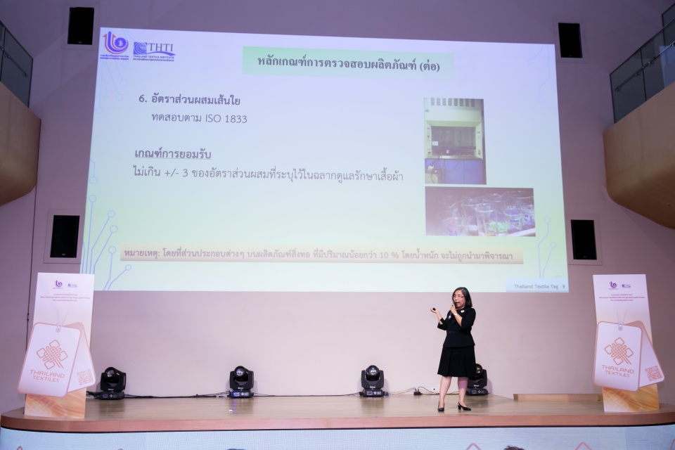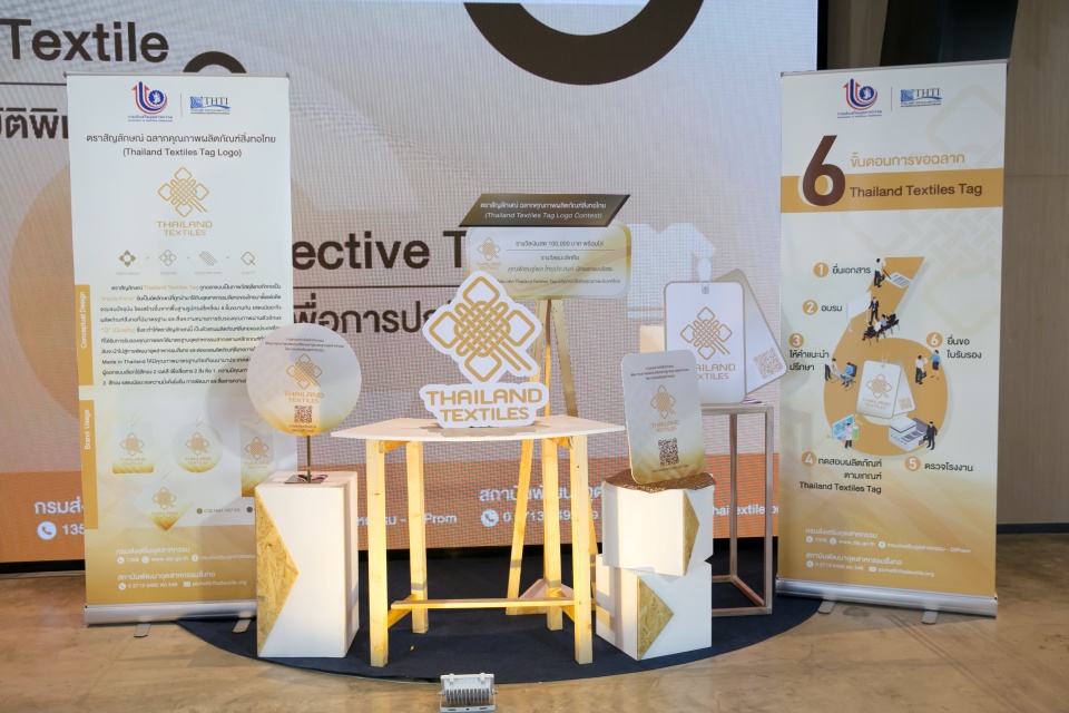 เปิดเผยว่า กองพัฒนาอุตสาหกรรมสร้างสรรค์ ได้ดำเนินกิจกรรมพัฒนาคุณภาพผลิตภัณฑ์สิ่งทอเข้าสู่มาตรฐานอุตสาหกรรม โดยมีสถาบันพัฒนาอุตสาหกรรมสิ่งทอเป็นที่ปรึกษา พร้อมจัดประกวดออกแบบตราสัญลักษณ์ Thailand Textiles Tag เพื่อเป็นเครื่องหมายรับรองคุณภาพของเนื้อผ้า ความคงทนของสี และความปลอดภัยจากสารเคมีตกค้าง ซึ่งผู้ที่ได้รับรางวัล คือ นายพิเชษฐ์พล ไทยประสงค์ นักออกแบบอิสระ โดยตราสัญลักษณ์ Thailand Textiles Tag หมายรวมถึงวัตถุดิบที่ใช้และกระบวนการผลิตที่เกิดขึ้นในประเทศไทย (Made in Thailand)โดยพิจารณาแหล่งกำเนิดของสินค้ายึดตามหลักสากล ได้แก่