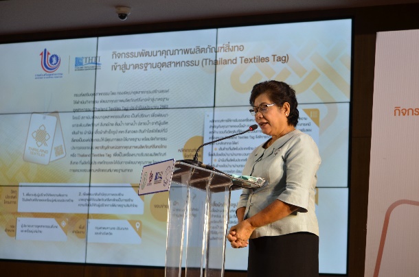 ผู้อำนวยการกองพัฒนาอุตสาหกรรมสร้างสรรค์ กรมส่งเสริมอุตสาหกรรม (นางวันเพ็ญ รัตนกังวาล) กล่าวถึง กิจกรรมพัฒนาคุณภาพผลิตภัณฑ์สู่มาตรฐานอุตสาหกรรม (Thailand Textiles Tag)