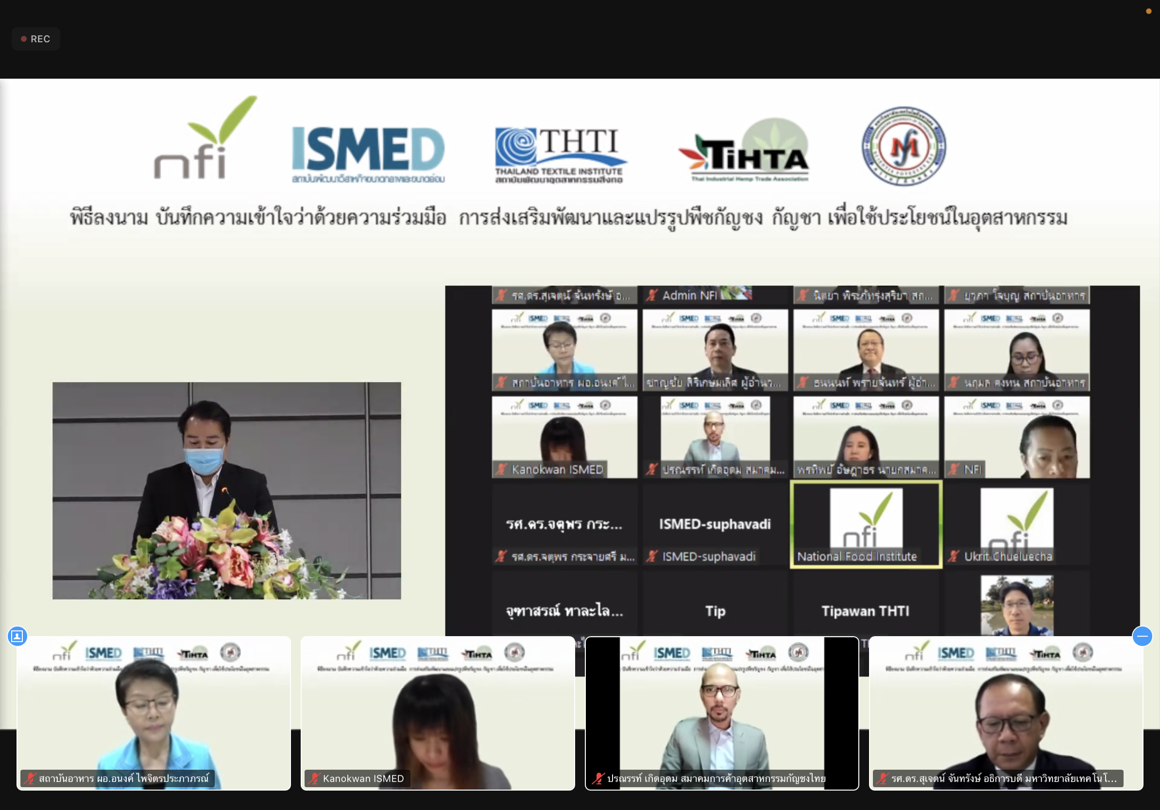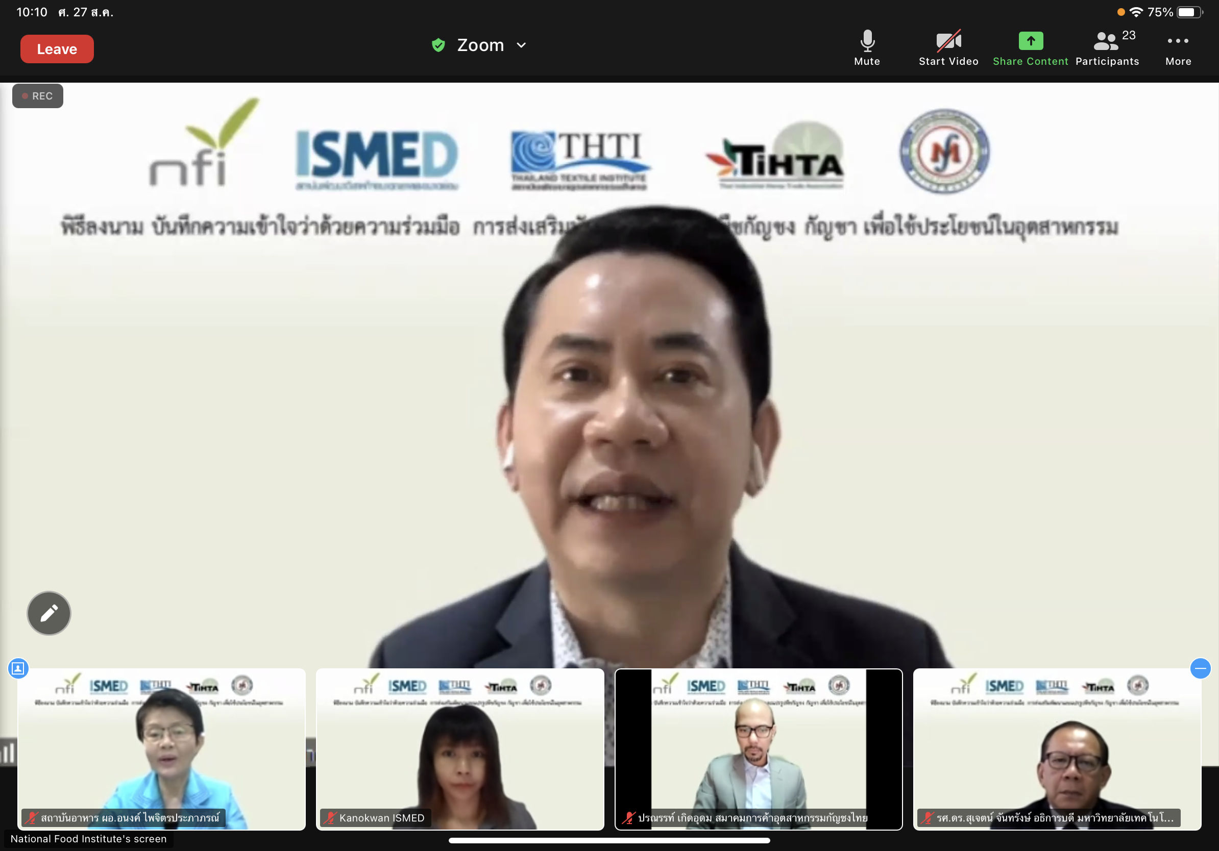 27 ส.ค.64 ดร.ชาญชัย สิริเกษมเลิศ ผู้อำนวยการสถาบันพัฒนาอุตสาหกรรมสิ่งทอ ลงนามบันทึกความร่วมมือ(MOU) กับ 5 หน่วยเพื่อร่วมกันพัฒนางานวิจัยงานแปรรูปพืช กัญชง กัญชาเพื่อใช้ประโยชน์ในอุตสาหกรรม ตามกรอบที่กฎหมายกำหนด ภายใต้การสนับสนุนของกระทรวงอุตสาหกรรม ผ่านระบบ Zoom Cloud Meeting โดยการลงนามครั้งนี้ประกอบไปด้วย