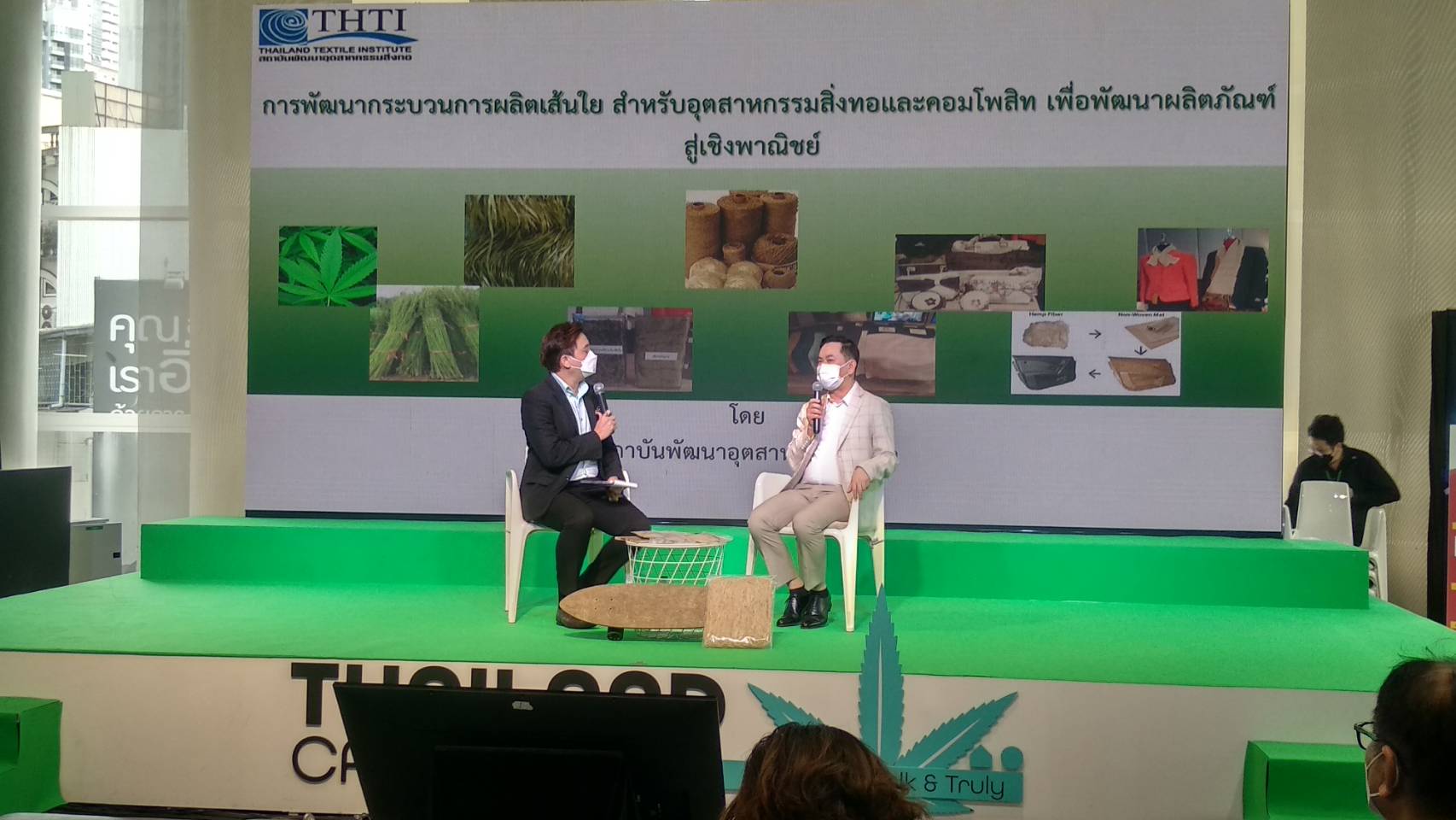 ทีสามารถนำมาสร้างมูลค่าเพิ่มในอุตสาหกรรมสิ่งทอได้ โดยการนำเส้นใยกัญชงมาถักทอเป็นผืนผ้า และแปรรูปเป็นผลิตภัณฑ์ต่าง ๆ อาทิ เสื้อผ้า เคหะสิ่งทอ หรือแฟชั่นไลฟ์สไตล์ต่าง ๆ เช่น กระเป๋า รองเท้า รวมทั้ง วิจัยร่วมวัสดุคอมโพสิทพัฒนาเป็น ประตูรถยนต์ สเกต์บอร์ด เป็นต้น โดยภายในงานนี้ ยังมีหน่วยงานภาคเอกชน สมาคม และสหพันธ์อุตสาหกรรมสิ่งทอแห่งประเทศไทย ได้เดินทางเข้าร่วมงานอย่างคึกคัก