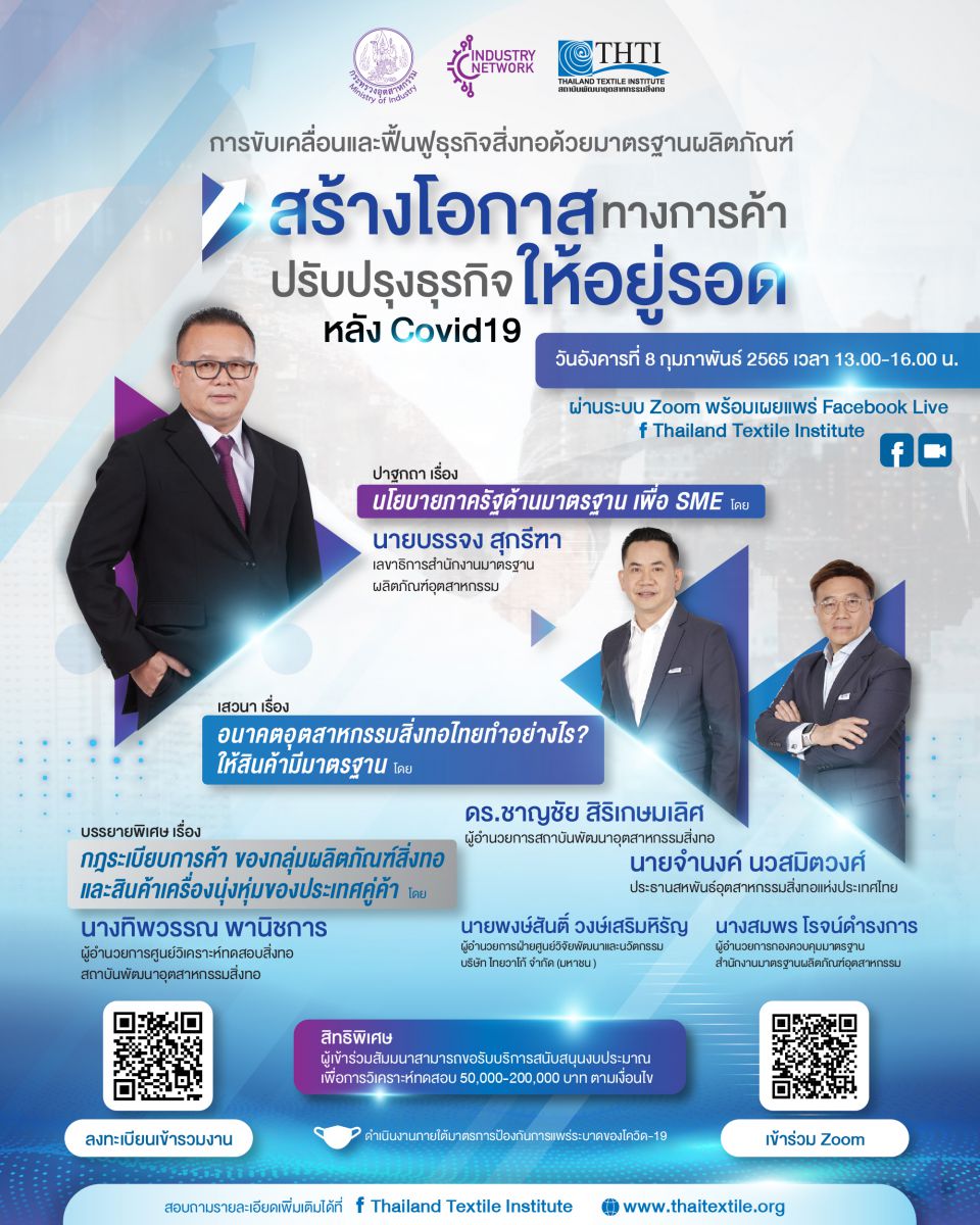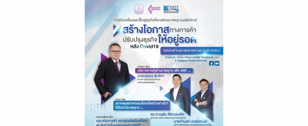 🔹 สถาบันฯสิ่งทอ ขอเรียนเชิญท่านเข้าร่วมงานสัมมนาหัวข้อ "การขับเคลื่อนและฟื้นฟูธุรกิจสิ่งทอ ด้วยมาตรฐานผลิตภัณฑ์ " วันอังคารที่ 8 กุมภาพันธ์ 2565 เวลา 13.00-16.00 น.