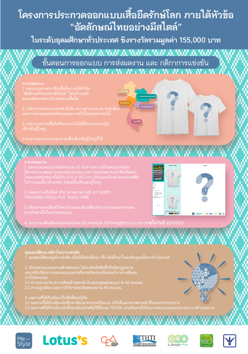 ครงการ MeStyle Young Graphic Designer Contest Season 2 ประกวดออกแบบกราฟฟิกเสื้อยืดรักษ์โลก ลายอัตลักษณ์ไทย ๕ ภาค ในระดับอุดมศึกษาทั่วประเทศ ชิงเงินรางวัลรวมมูลค่า 155,000 บาท ในหัวข้อ อัตลักษณ์ไทย อย่างมีสไตล์ โดยผลงานที่ชนะเลิศจะได้รับการพิมพ์บนเสื้อยืดเพื่อผลิตและจำหน่ายในห้างสรรพสินค้าโลตัสทุกสาขาทั่วประเทศ และแพลตฟอร์มออนไลน์ Lotus’s SMART App