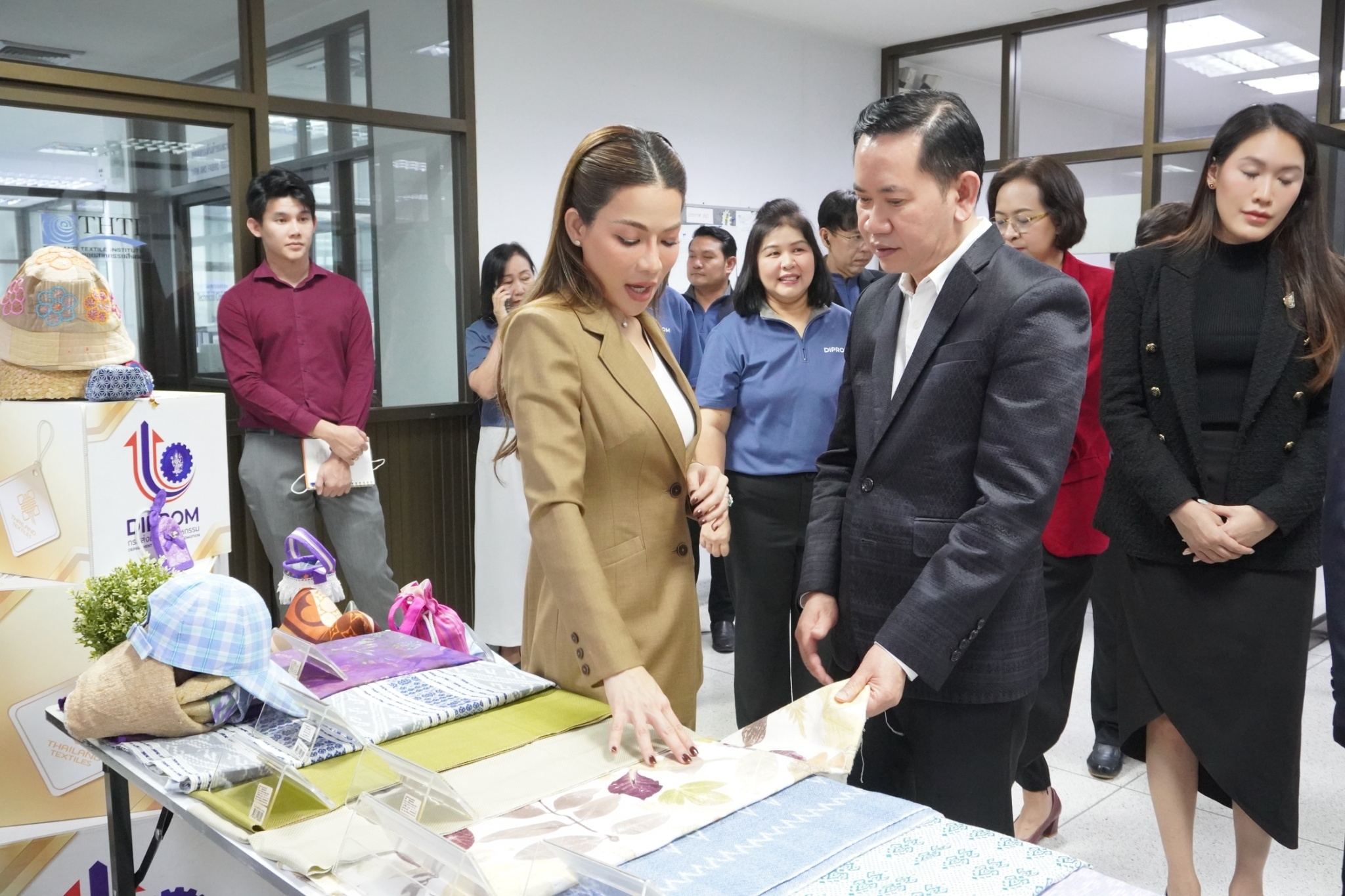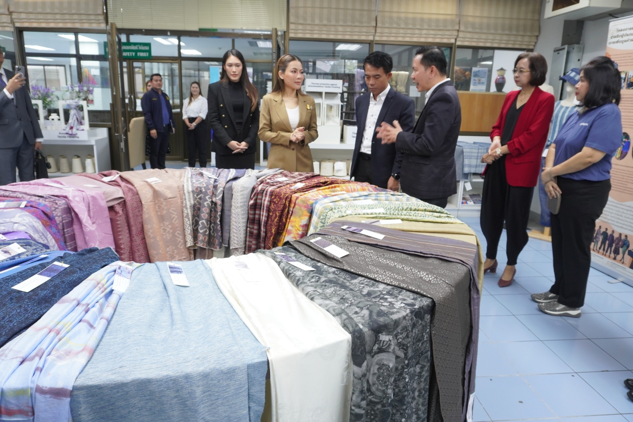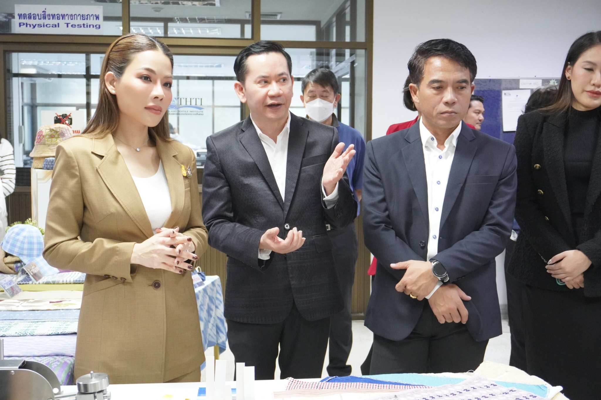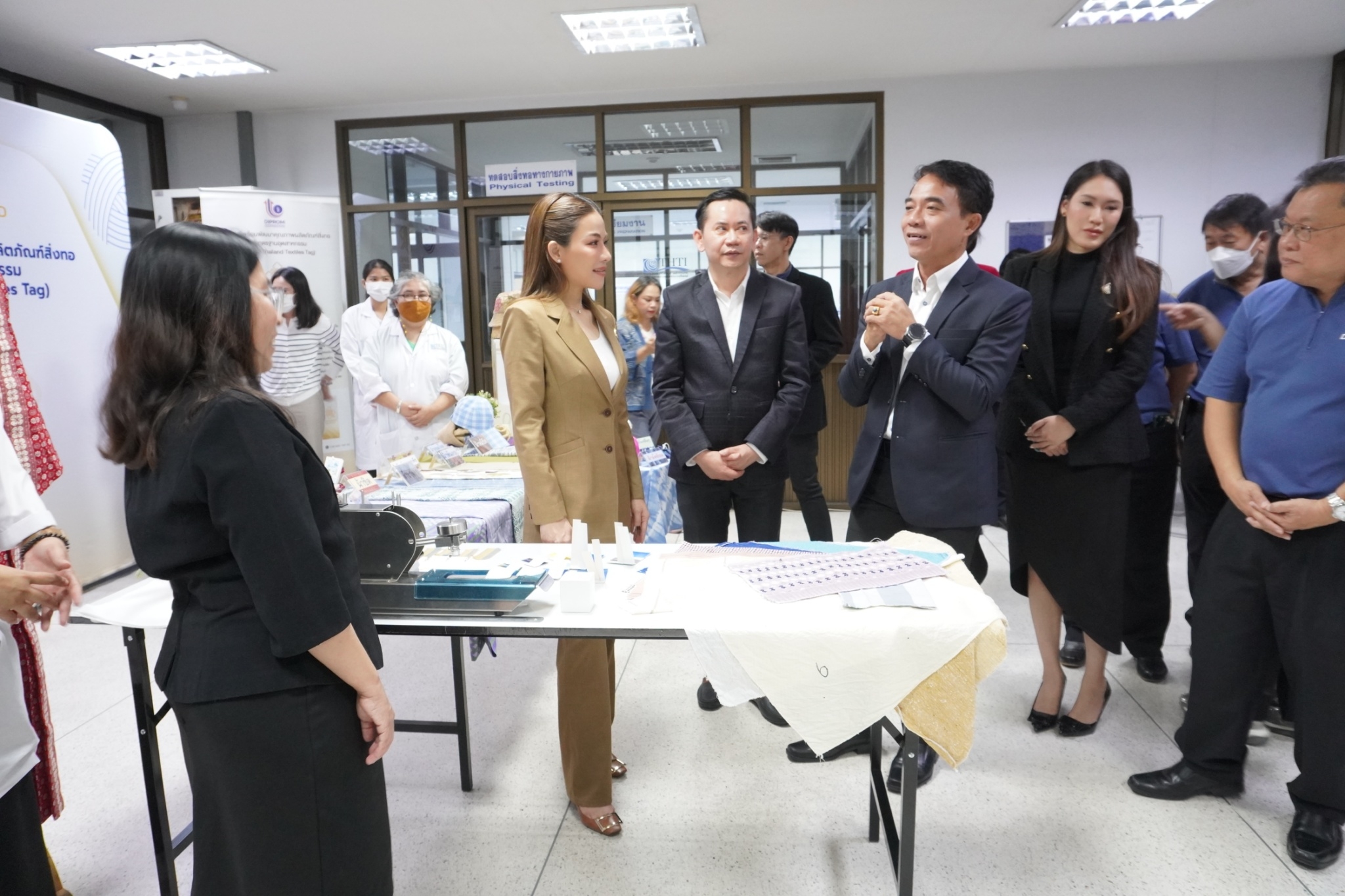 โดยสถาบันพัฒนาอุตสาหกรรมสิ่งทอ ได้นำชมศูนย์วิเคราะห์ทดสอบสิ่งทอ ชมผลิตภัณฑ์และการดำเนินด้านมาตรฐานผลิตภัณฑ์ชุมชน (มผช.) มาตรฐานฉลากคุณภาพผลิตภัณฑ์สิ่งทอไทย (Thailand Textiles Tag) และศูนย์พัฒนาผลิตภัณฑ์สิ่งทอ พร้อมจัดแสดงนิทรรศการผลิตภัณฑ์ผ้าและผลการดำเนินงาน อาทิ งานโครงการผลิตภัณฑ์ภายใต้โครงการพัฒนาผ้าไหมไทยร่วมสมัย โครงการพัฒนาผลิตภัณฑ์สิ่งทอและเครื่องแต่งกายมุสลิมในจังหวัดชายแดนใต้ การพัฒนาเส้นใยกัญชงสู่ผลิตภัณฑ์ และชมตัวอย่างเส้นใยธรรมชาติต่าง ๆ ทั้งนี้เพื่อเร่งดำเนินการหาแนวทางขับเคลื่อนอุตสาหกรรมซอฟต์พาวเวอร์ แฟชั่นสิ่งทอ โดยเน้นยกระดับให้มีความสวยงามและมีคุณภาพมาตรฐานและสามารถไปสู่ตลาดสากลได้