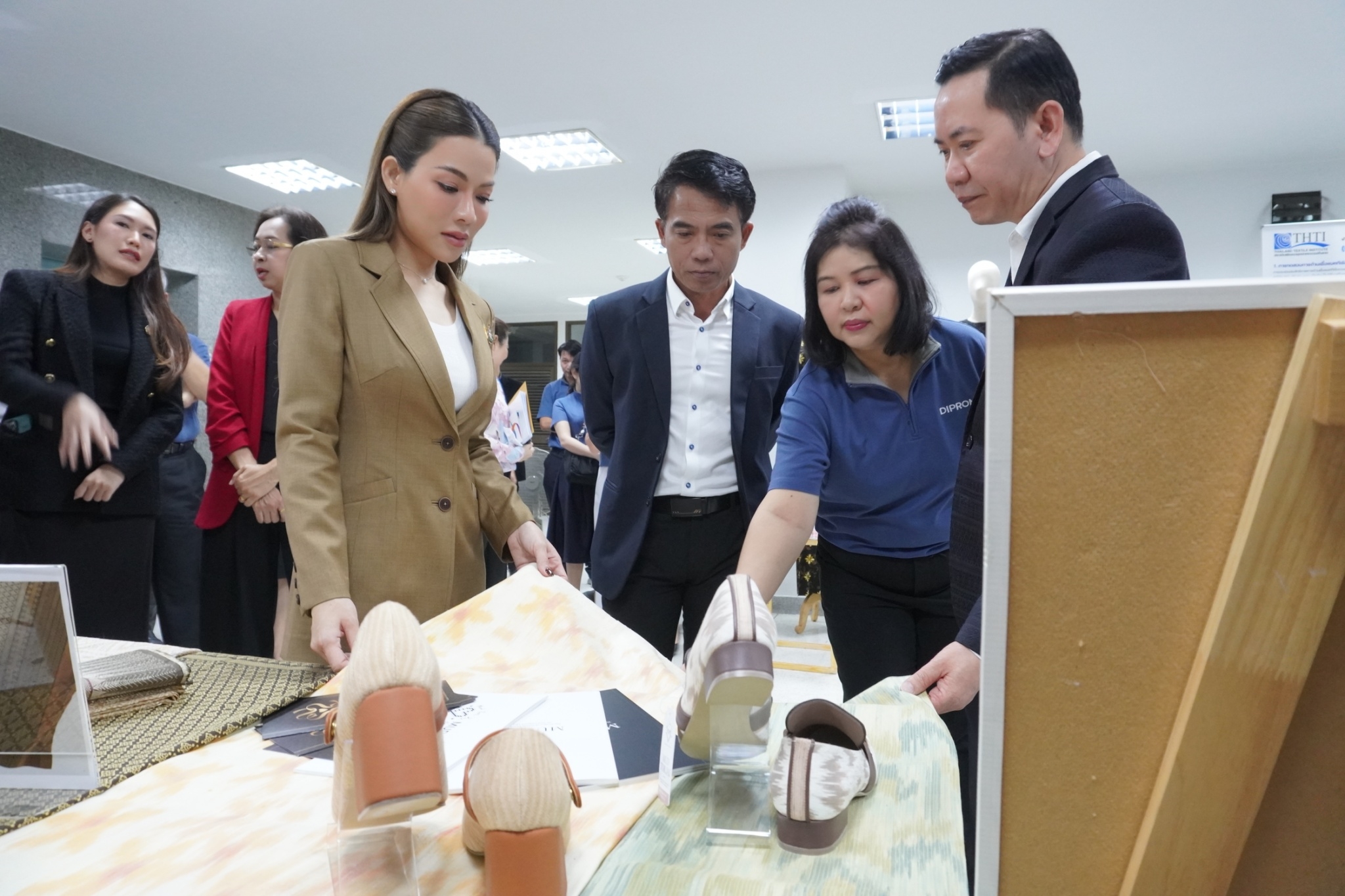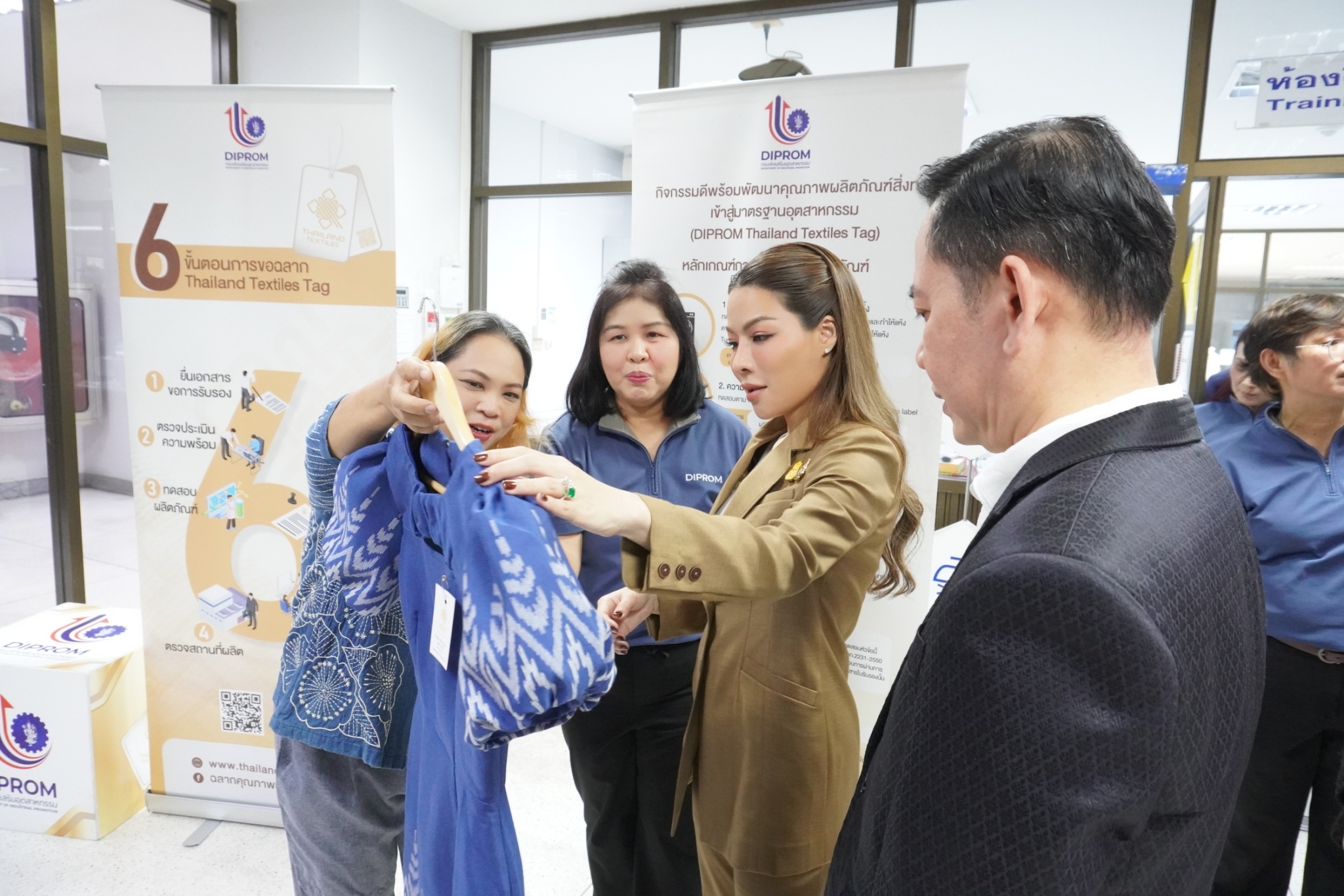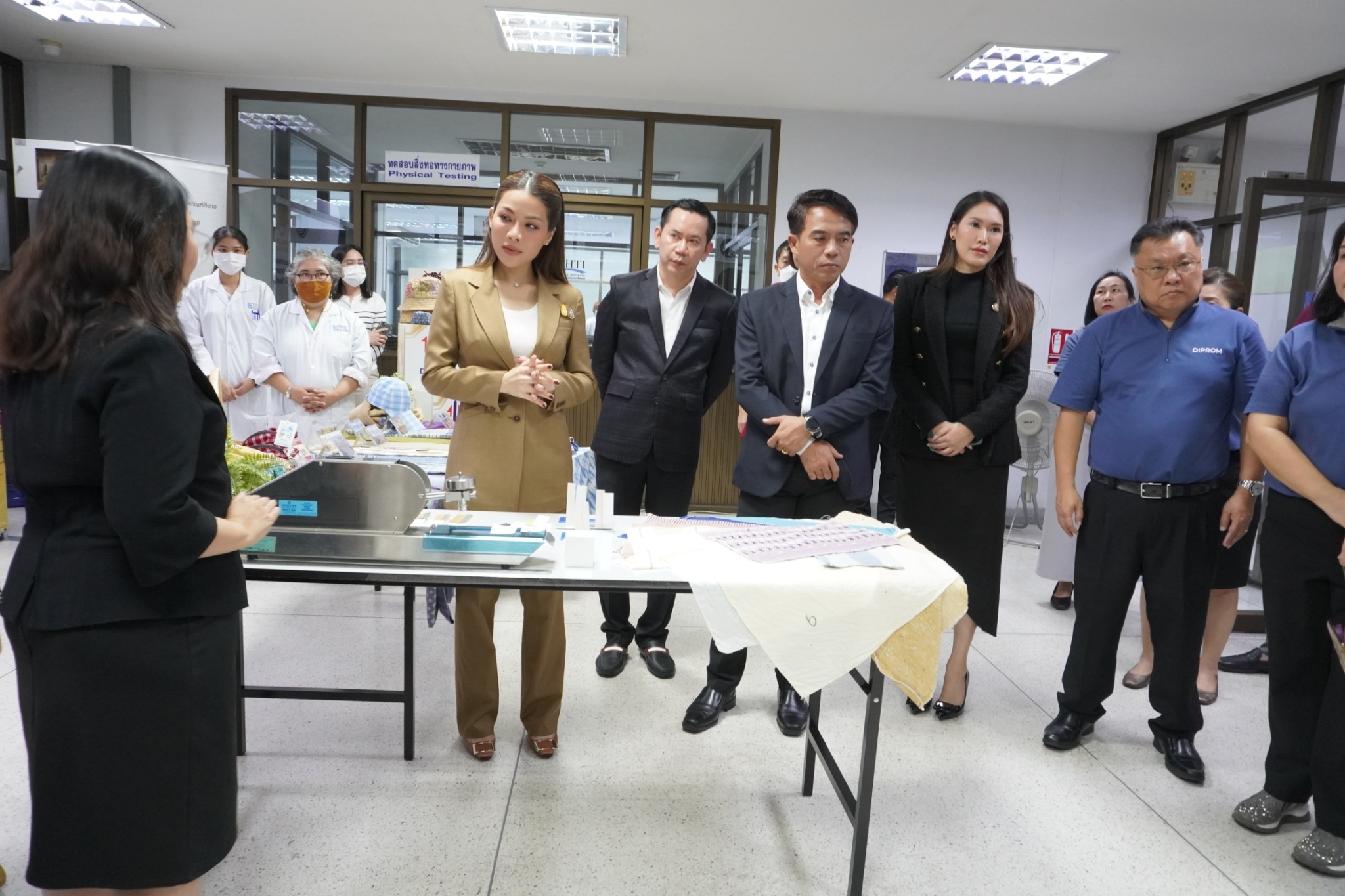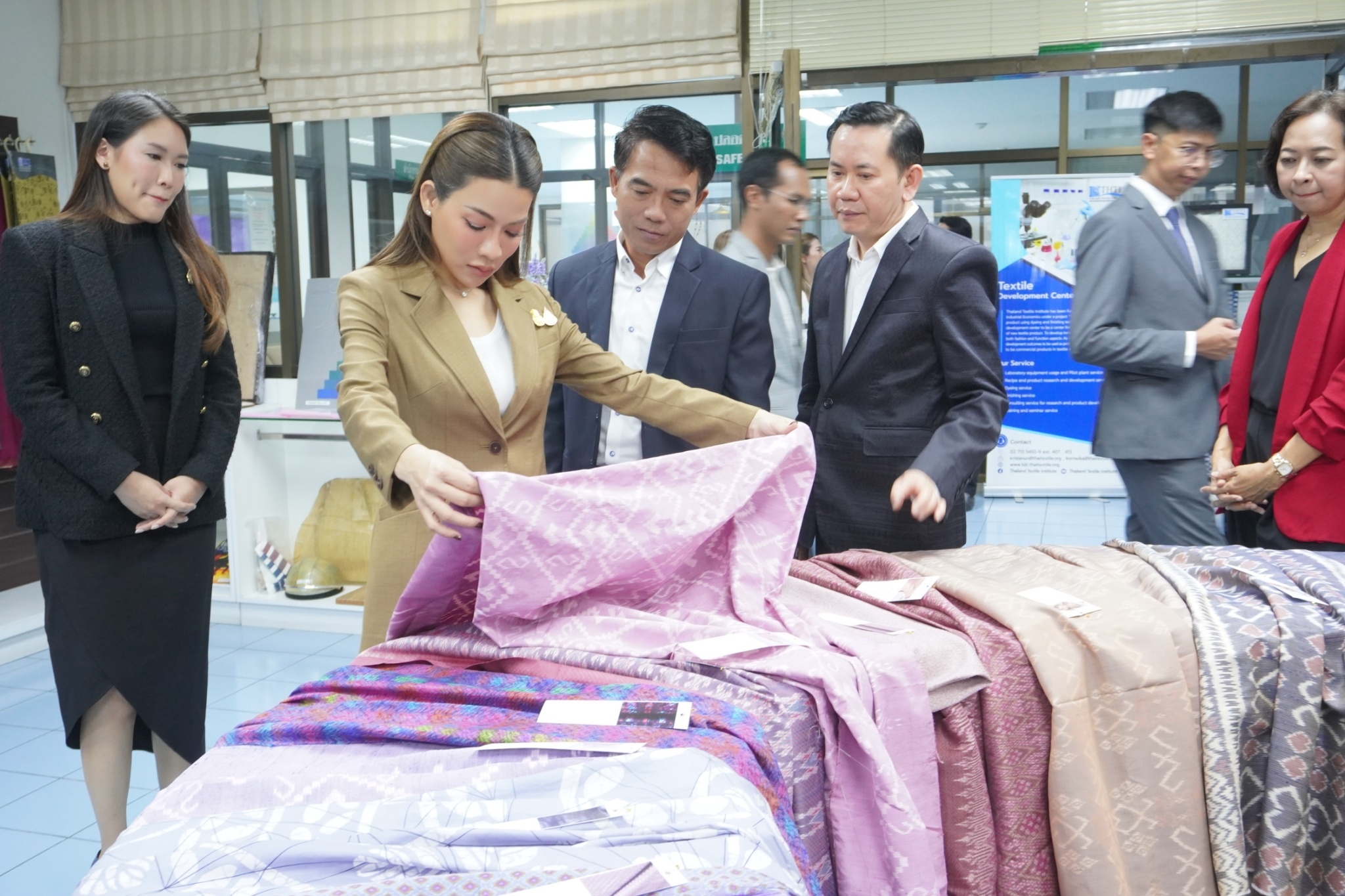โดยสถาบันพัฒนาอุตสาหกรรมสิ่งทอ ได้นำชมศูนย์วิเคราะห์ทดสอบสิ่งทอ ชมผลิตภัณฑ์และการดำเนินด้านมาตรฐานผลิตภัณฑ์ชุมชน (มผช.) มาตรฐานฉลากคุณภาพผลิตภัณฑ์สิ่งทอไทย (Thailand Textiles Tag) และศูนย์พัฒนาผลิตภัณฑ์สิ่งทอ พร้อมจัดแสดงนิทรรศการผลิตภัณฑ์ผ้าและผลการดำเนินงาน อาทิ งานโครงการผลิตภัณฑ์ภายใต้โครงการพัฒนาผ้าไหมไทยร่วมสมัย โครงการพัฒนาผลิตภัณฑ์สิ่งทอและเครื่องแต่งกายมุสลิมในจังหวัดชายแดนใต้ การพัฒนาเส้นใยกัญชงสู่ผลิตภัณฑ์ และชมตัวอย่างเส้นใยธรรมชาติต่าง ๆ ทั้งนี้เพื่อเร่งดำเนินการหาแนวทางขับเคลื่อนอุตสาหกรรมซอฟต์พาวเวอร์ แฟชั่นสิ่งทอ โดยเน้นยกระดับให้มีความสวยงามและมีคุณภาพมาตรฐานและสามารถไปสู่ตลาดสากลได้