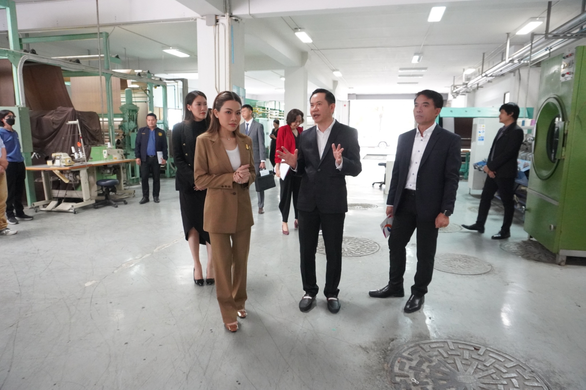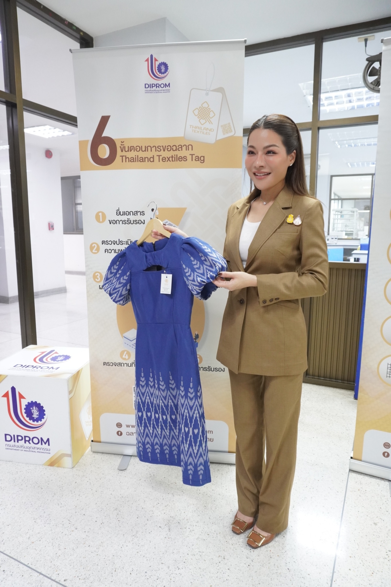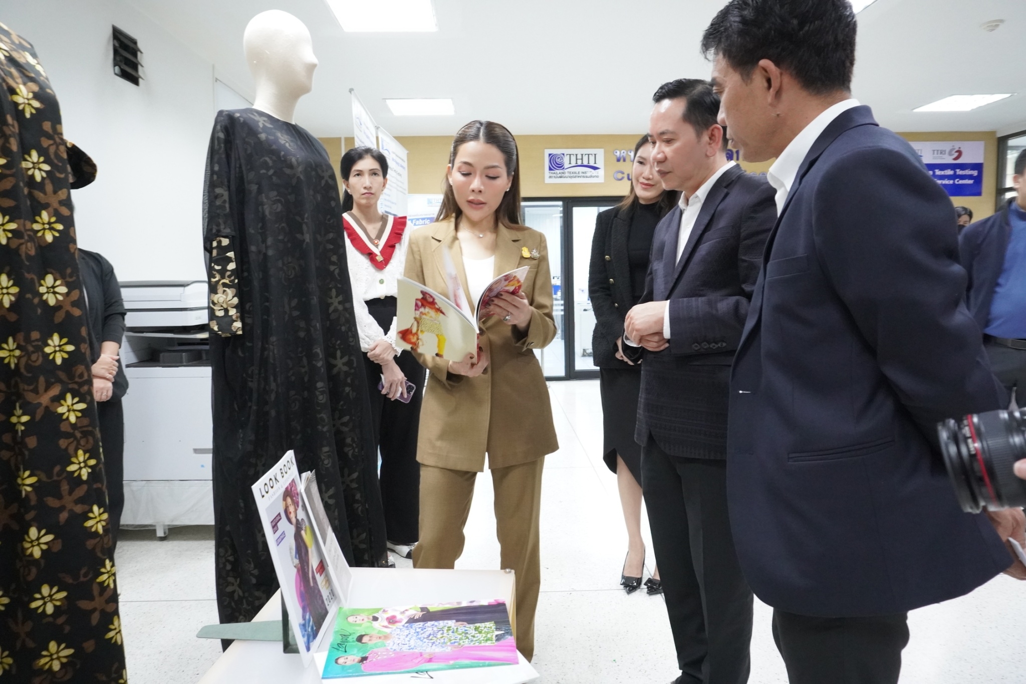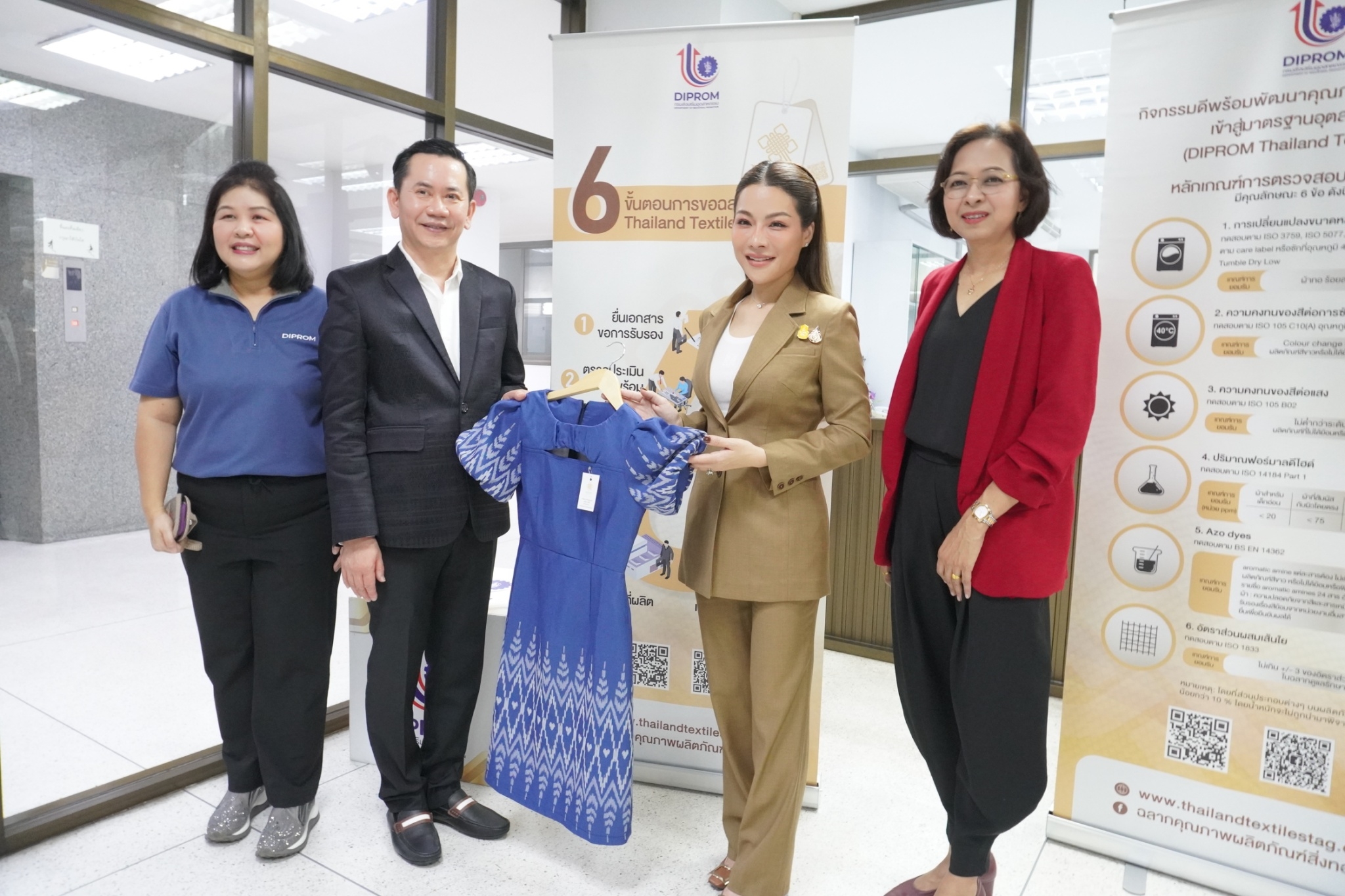 โดยสถาบันพัฒนาอุตสาหกรรมสิ่งทอ ได้นำชมศูนย์วิเคราะห์ทดสอบสิ่งทอ ชมผลิตภัณฑ์และการดำเนินด้านมาตรฐานผลิตภัณฑ์ชุมชน (มผช.) มาตรฐานฉลากคุณภาพผลิตภัณฑ์สิ่งทอไทย (Thailand Textiles Tag) และศูนย์พัฒนาผลิตภัณฑ์สิ่งทอ พร้อมจัดแสดงนิทรรศการผลิตภัณฑ์ผ้าและผลการดำเนินงาน อาทิ งานโครงการผลิตภัณฑ์ภายใต้โครงการพัฒนาผ้าไหมไทยร่วมสมัย โครงการพัฒนาผลิตภัณฑ์สิ่งทอและเครื่องแต่งกายมุสลิมในจังหวัดชายแดนใต้ การพัฒนาเส้นใยกัญชงสู่ผลิตภัณฑ์ และชมตัวอย่างเส้นใยธรรมชาติต่าง ๆ ทั้งนี้เพื่อเร่งดำเนินการหาแนวทางขับเคลื่อนอุตสาหกรรมซอฟต์พาวเวอร์ แฟชั่นสิ่งทอ โดยเน้นยกระดับให้มีความสวยงามและมีคุณภาพมาตรฐานและสามารถไปสู่ตลาดสากลได้