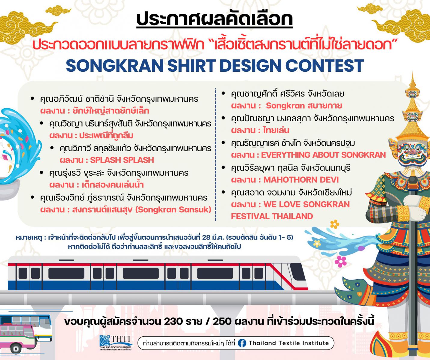 ประกาศรางวัลชนะเลิศ กิจกรรมการประกวดออกแบบลายกราฟฟิก “เสื้อเชิ้ตสงกรานต์ที่ไม่ใช่ลายดอก” SONGKRAN SHIRT DESIGN CONTEST โดยสถาบันพัฒนาอุตสาหกรรมสิ่งทอ หน่วยงานเครือข่ายกระทรวงอุตสาหกรรม