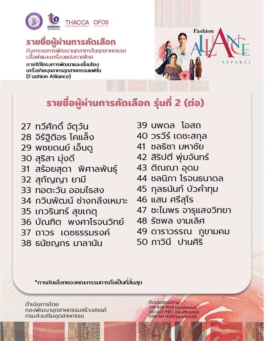 13 พ.ค. 68 ดีพร้อมคัดเลือกผู้เข้าร่วมกิจกรรมพัฒนาบุคลากรในอุตสาหกรรมเสื้อผ้าและเครื่องแต่งกายไทย (Soft Power Fashion Apparel Alliance) ภายใต้โครงการ พัฒนาและเชื่มโยงเครือข่ายบุคลากรอุตสาหกรรมแฟชั่น (Fashion Alliance) โดยคณะกรรมการผู้ทรงคุณวุฒิ