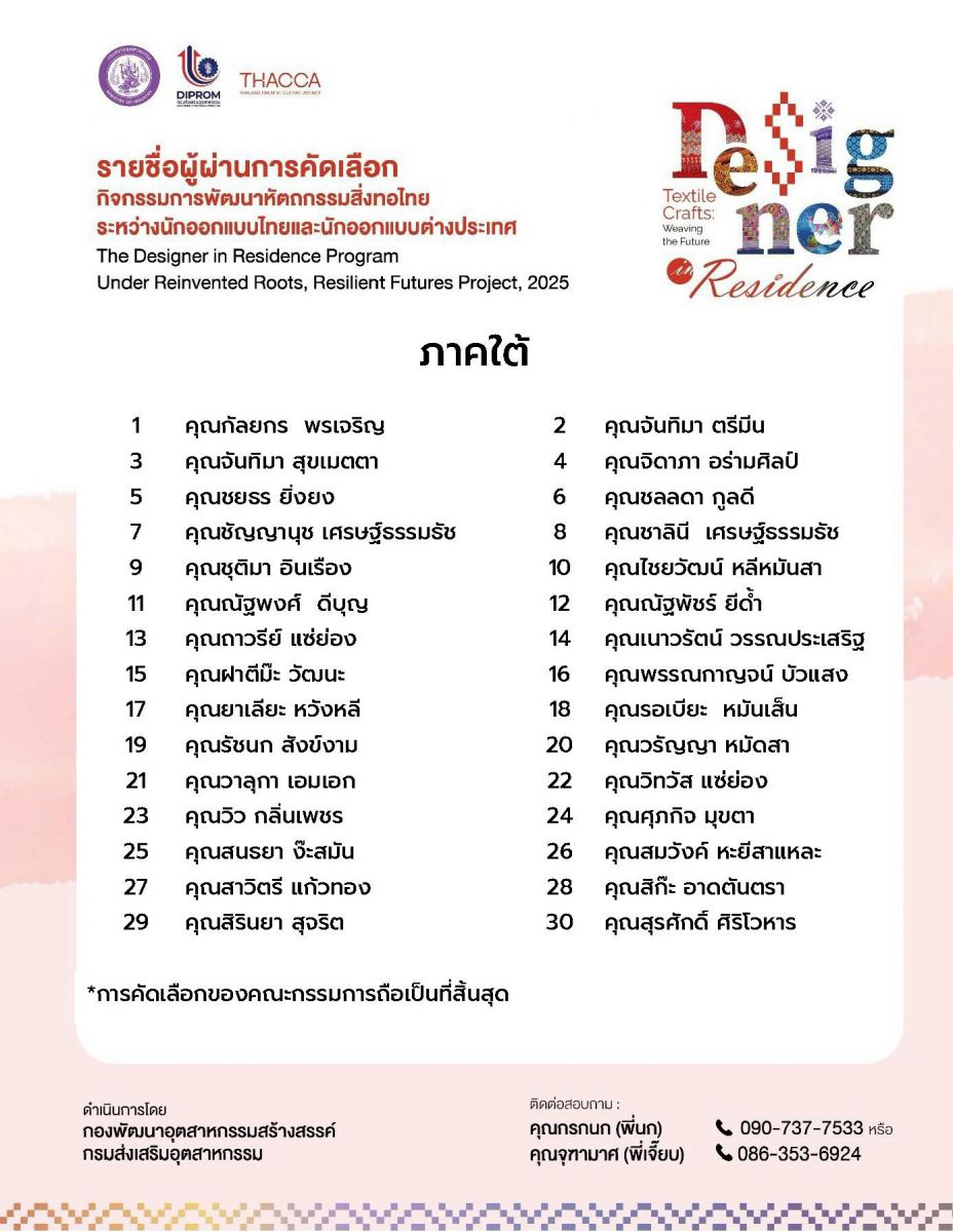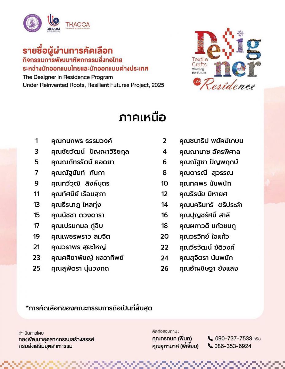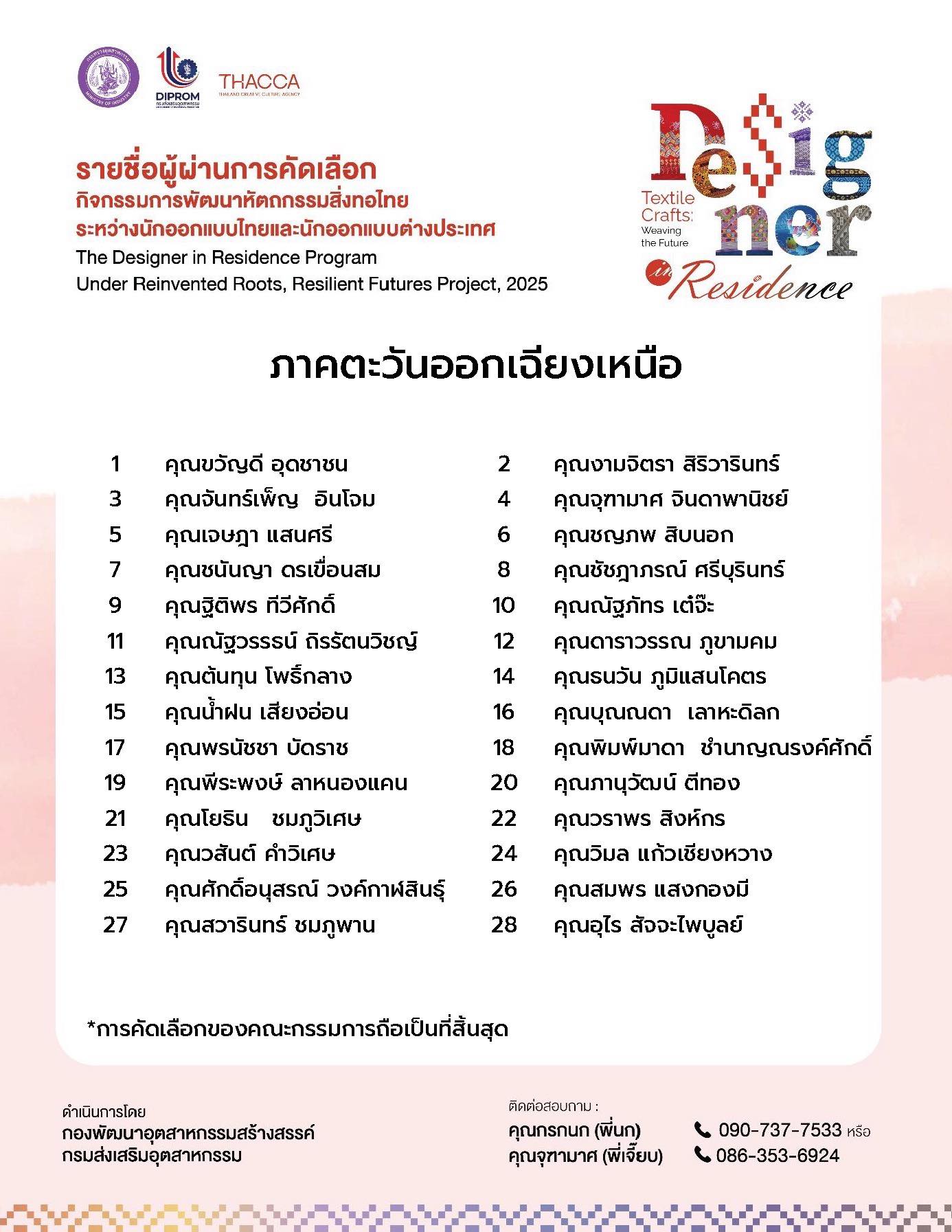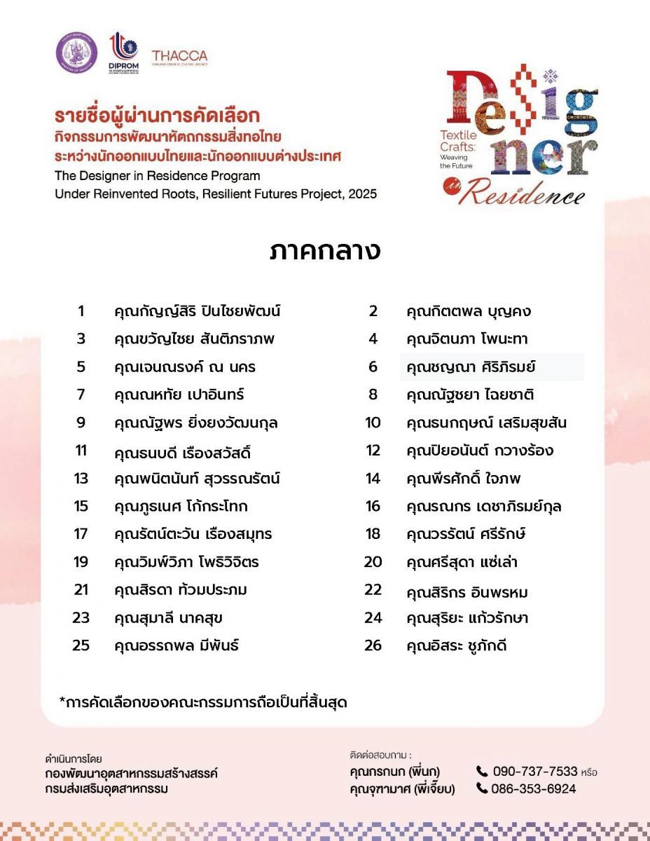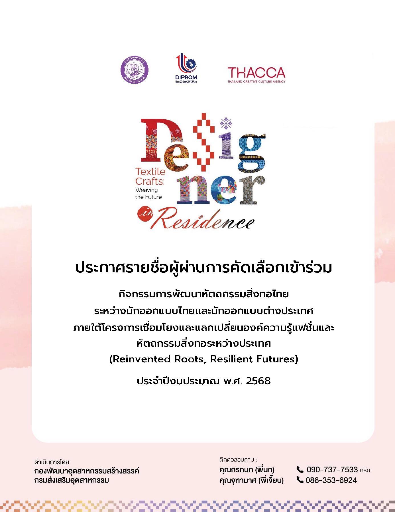 🔸กิจกรรมการพัฒนาหัตถกรรมสิ่งทอไทยระหว่างนักออกแบบไทยและนักออกแบบต่างประเทศ ภายใต้โครงการเชื่อมโยงและแลกเปลี่ยนองค์ความรู้แฟชั่นและหัตถกรรมสิ่งทอระหว่างประเทศ (Reinvented Roots, Resilient Futures) ประจำปีงบประมาณ พ.ศ. 2568 จำนวน 110 ท่าน