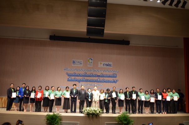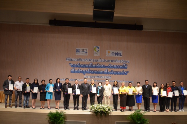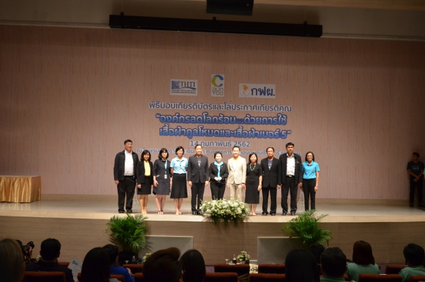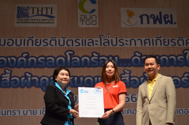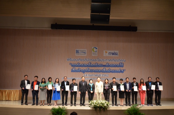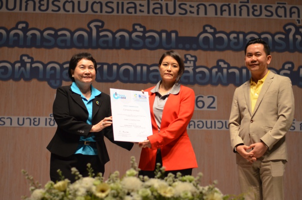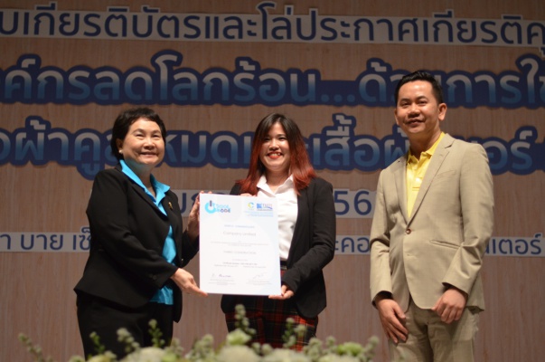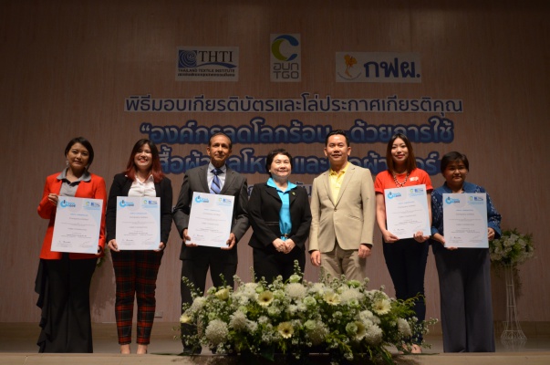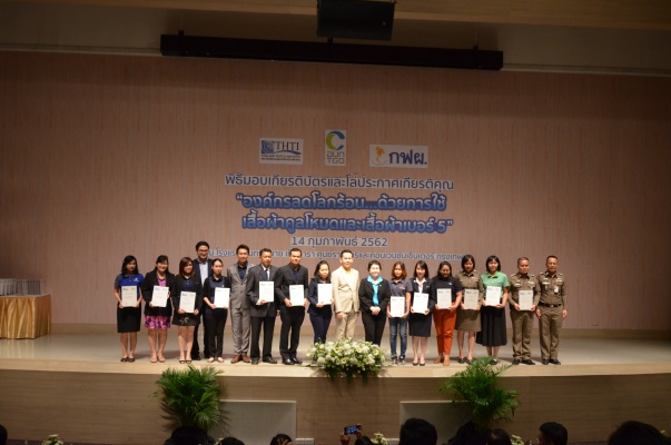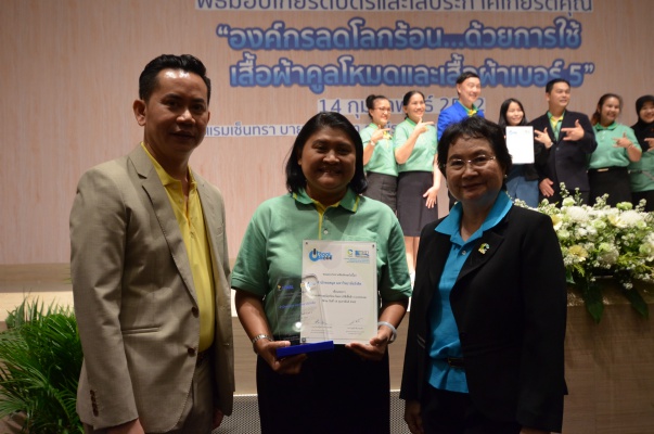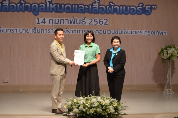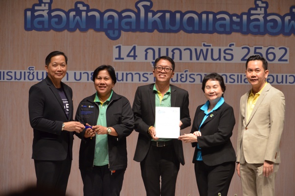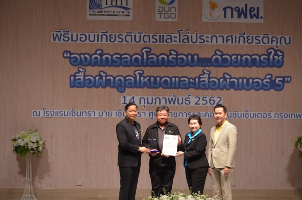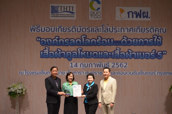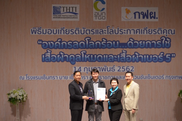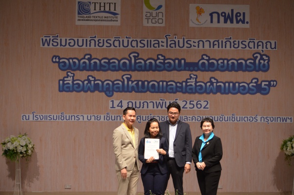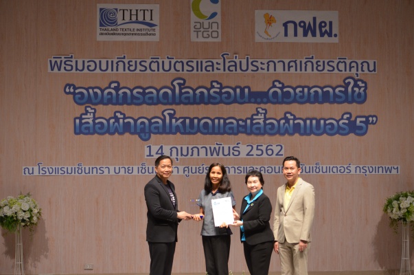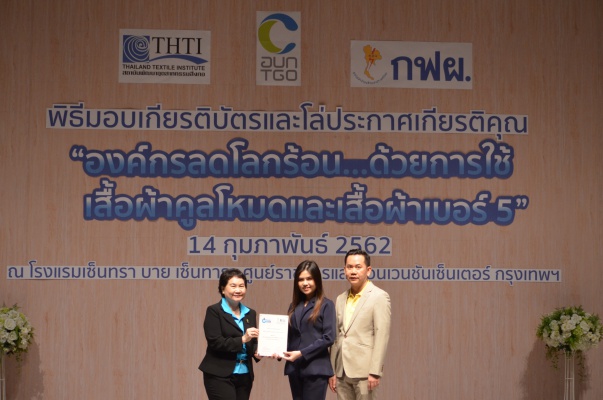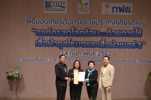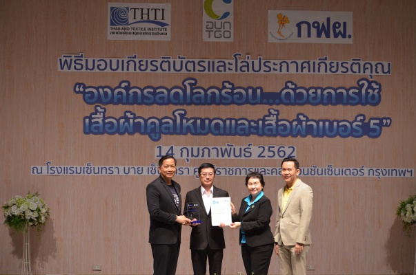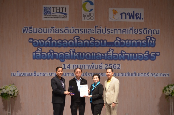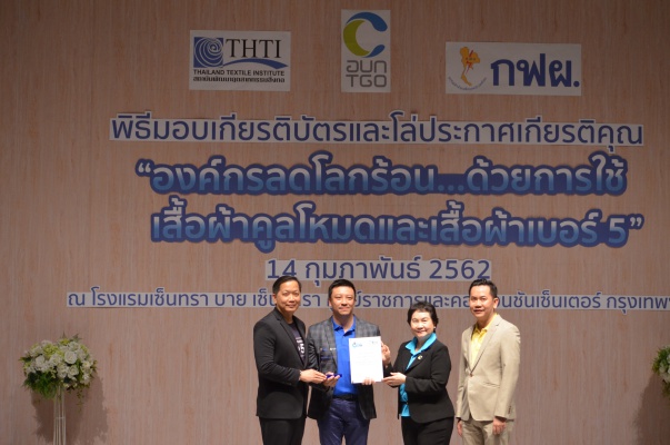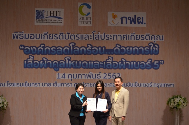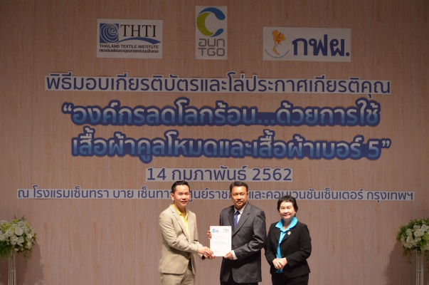 14 ก.พ.62 นางประเสริฐสุข เพฑูรย์สิทธิชัย ผู้อำนวยการองค์การบริหารจัดการก๊าซเรือนกระจก (องค์การมหาชน) (อบก.) นายจิระศักดิ์ มัณฑางกูร ผู้อำนวยการฝ่ายบริหารด้านการใช้ไฟฟ้าและกิจการเพื่อสังคม การไฟฟ้าฝ่ายผลิตแห่งประเทศไทย (กฟผ.) และ ดร.ชาญชัย สิริเกษมเลิศ ผู้อำนวยการสถาบันพัฒนาอุตสาหกรรมสิ่งทอ (สสท.) ร่วมกันแถลงความร่วมมือ พร้อมมอบเกียรติบัตรและโล่ประกาศเกียรติคุณให้กับหน่วยงาน ทั้งภาครัฐและภาคเอกชน จำนวน 87 หน่วยงาน เพื่อแสดงความขอบคุณที่ให้ความร่วมมือในการใช้เสื้อผ้าคูลโหมด และเสื้อผ้าเบอร์ 5 ภายในงานพิธีมอบเกียรติบัตรและโล่ประกาศเกียรติคุณ “องค์กรลดโลกร้อน...ด้วยการใช้เสื้อผ้าคูลโหมดและเสื้อผ้าเบอร์ 5” ซึ่งทาง อบก. ได้ร่วมกับ กฟผ.และ สสท.จึดขึ้น ณ ห้องประชุมออดิทอเรียม โรงแรมเซ็นทรา บายเซ็นทารา ศูนย์ราชการและคอนเวนชันเซ็นเตอร์ แจ้งวัฒนะ กรุงเทพฯ