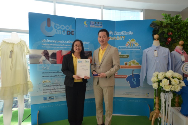 นางประเสริฐสุข เพฑูรย์สิทธิชัย ผู้อำนวยการ อบก. กล่าวว่า อบก. ได้พัฒนาฉลากคาร์บอน 3 รูปแบบ เพื่อเป็นการแสดงออกถึงความรับผิดชอบต่อสังคมในการให้ข้อมูลแก่ผู้บริโภคและช่วยในการบริหารจัดการ การปล่อยก๊าซเรือนกระจกที่เกิดจากผลิตภัณฑ์ กิจกรรม หรือบริการ ซึ่ง “ฉลากคูลโหมด” เป็นหนึ่งในเครื่องหมายฉลากคาร์บอน ที่รับรองเสื้อผ้าที่มีคุณสมบัติพิเศษในการซับเหงื่อและระบายความร้อนได้ดี ช่วยเพิ่มความเย็นสบายในการสวมใส่ เพิ่มทางเลือกให้กับผู้บริโภคในการเลือกใช้เสื้อผ้าที่สามารถลดการปล่อยก๊าซเรือนกระจก และส่งเสริมให้เกิดผู้ผลิตและตลาดสินค้าสิ่งทอที่ลดโลกร้อนในประเทศไทย โดยเป็นความร่วมมือการดำเนินงานระหว่าง อบก. กฟผ. และสสท. ซึ่งผลการดำเนินงานตั้งแต่ปี 2552 จนถึงปัจจุบัน มีโครงสร้างผ้าที่ได้ขึ้นทะเบียนเครือหมายคูลโหมดจำนวน 123 โครงสร้างผ้า จาก 29 บริษัทและมีหน่วยงานที่ได้นำไปใช้งานมากกว่า 100 ราย