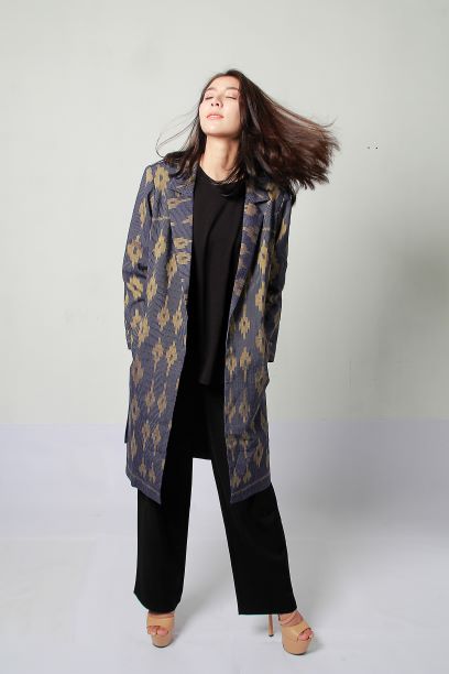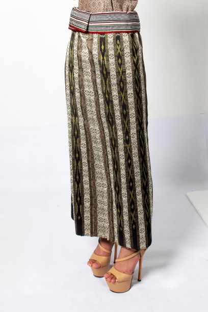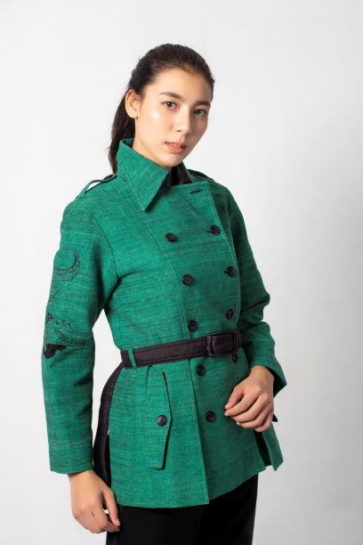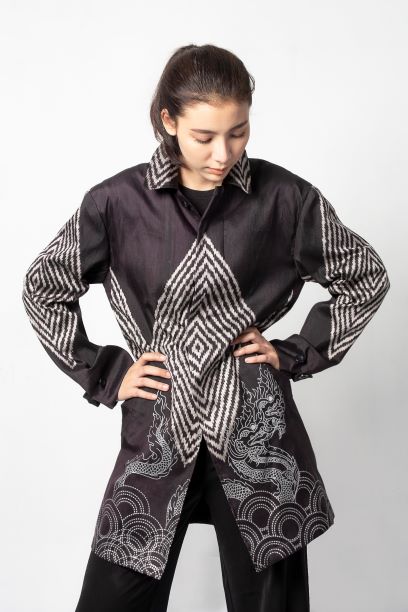 The design of fabrics and women's suits in contemporary style inspired from the legendary local crocodile. It is conveyed through the fabric and embroidery on the shirt. The product is derived from the cultural with new fiber materials. The fabric alternate fibers with cotton to increase the surface dimension on woven fabrics. It applied dyeing and finishing process of antibactericidal and natural dyes from local materials, including mud color and peel color.