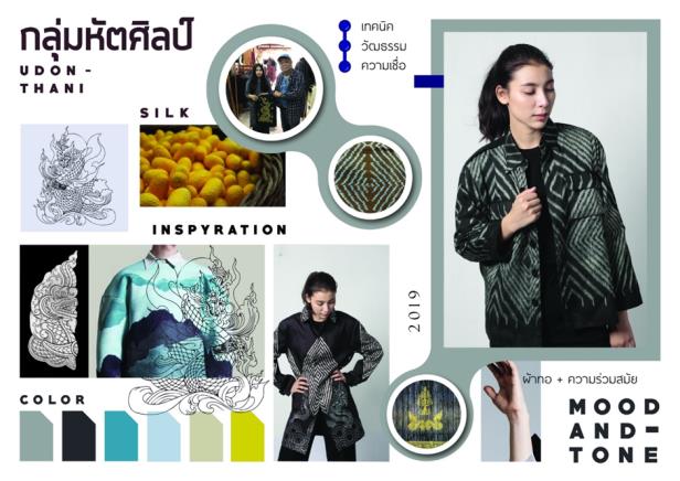 ผลิตภัณฑ์ผ้าไหมลายประยุกต์ ได้รับแรงบันดาลใจมาจากเรื่องราวของพญานาค โดยใช้กราฟิคมาช่วยในลักษณะของการเพ้นท์บนลายผ้าไหมทอมัดหมี่ โดยใช้สีธรรมชาติ ได้แก่ สีน้ำเงินจากคราม สีแดงจากครั่ง และสีเหลืองจากขมิ้นมาผสมให้เกิดเฉดสีใหม่ การออกแบบผ้าทอลายมัดหมี่ทอเป็นเส้นฟันปลาเป็นพื้นหลังของลวดลาย ให้ความรู้สึกที่ร่วมสมัยและมีความสะดุดตาอันสื่อถึงความสง่างามและเพ้นท์ด้วยเฉดสีสด เกิดการตัดกันของสีเพื่อสร้างโทนสีที่ฉูดฉาดสะท้อนความงามดูมีมิติและความหลากหลายดึงดูดทุกสายตา