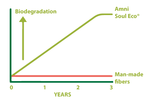 เมื่อผลิตภัณฑ์ที่ทำจากเส้นใยสังเคราหะทั่วไป ถูกกำจัดเป็นขยะ จะใช้เวลาในการย่อยสลายนานหลายสิบปี แต่ด้วยเทคโนโลย Amni Soul Eco® กระบวนการสลายตัวจะเริ่มเมื่อเสื้อผ้าถูกทิ้งในหลุมฝังกลบ จุลินทรีย์ที่อยู่ในดินจะกระตุ้นเส้นด้ายให้เกิดการย่อยสลายทางชีวภาพ ซึ่งแตกต่างจากเส้นใยชนิดอื่นๆ ที่ต้องใช้เวลาหลายสิบปีในการสลาย แต่ Amni Soul Eco®ใช้เวลาประมาณสามปี ช่วยลดผลกระทบต่อสิ่งแวดล้อมและสร้างอนาคตที่ดีสำหรับคนรุ่นต่อไป