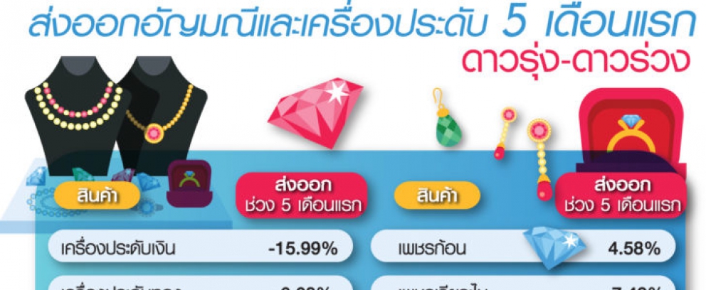 นางดวงกมล เจียมบุตร ผู้อำนวยการสถาบันวิจัยและพัฒนาอัญมณีและเครื่องประดับแห่งชาติ (องค์การมหาชน) หรือจีไอที เปิดเผยว่า การส่งออกอัญมณีและเครื่องประดับของไทยในช่วง 5 เดือนของปี 2562 (ม.ค.-พ.ค.) มีมูลค่า 4,605.80 ล้านเหรียญสหรัฐ ลดลง 9.98% คิดเป็นเงินบาทมีมูลค่า 145,264.11 ล้านบาท ลดลง 9.70% หากหักทองคำซึ่งเป็นสินค้าที่มีความผันผวนออก
