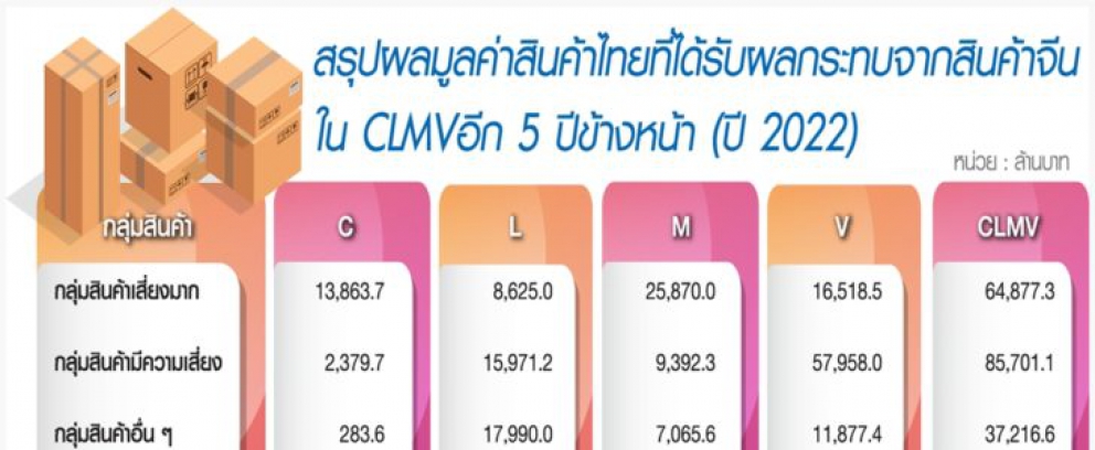 สินค้าจีนทะลัก ถล่มตลาด CLMV หลังรวม AEC หวั่นอีก 3 ปี มูลค่า1.87 แสนล้านเหรียญสหรัฐ สินค้าไทยเสี่ยงเสียส่วนแบ่งตลาด “เวียดนาม” สูงสุด 86,353 ล้านเหรียญสหรัฐ