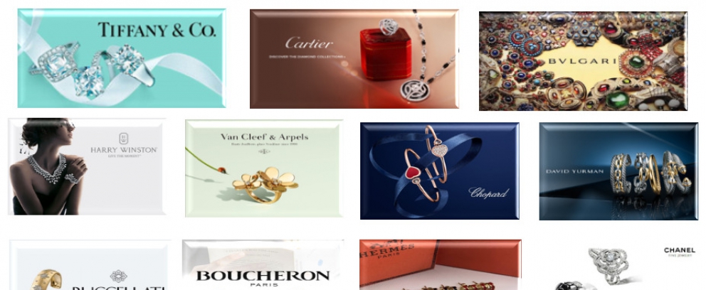 อันดับที่ 1-15 จากซ้ายไปขวา แถวบนสุด คือ Tiffany & Co., Cartier, BVLGARI แถวที่ 2 Harry Winston, Van Cleef & Arpels, Chopard, David Yurman แถวที่ 3 Buccellati, Boucheron, Hermes, Chanel และแถวล่างสุด Dior, Mikimoto, H. Stern และ Graff
