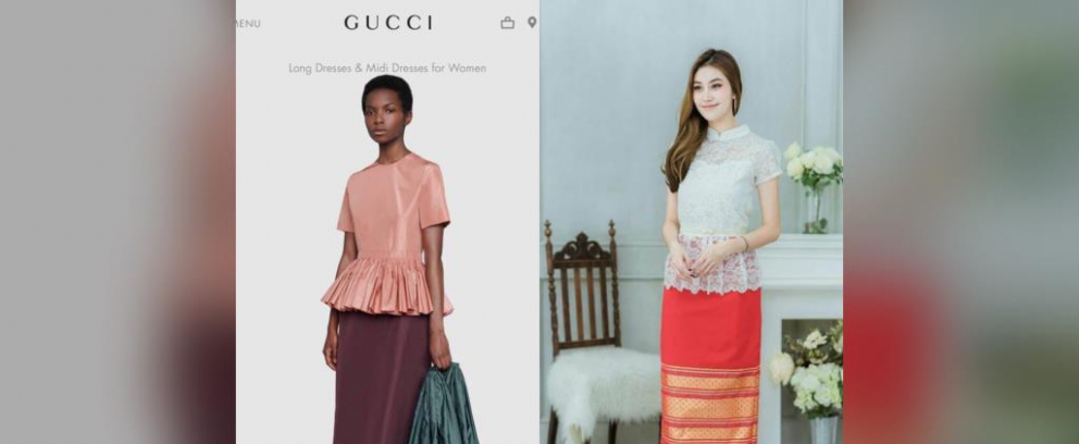 เพจดังเผยภาพคอลเลกชันชุดผู้หญิงแบรนด์ดังระดับโลก อย่าง “Gucci” ซึ่งดีไซน์ออกมาคล้ายชุดร่วมงานสำคัญยอดนิยมของผู้หญิงไทย โดยตัวกระโปรงคล้ายผ้าถุง และตัวเสื้อก็คล้ายการตัดเย็บแบบผ้าไทย เพจดังถึงกับระบุว่าเป็น “ชุดตักบาตรเช้า”